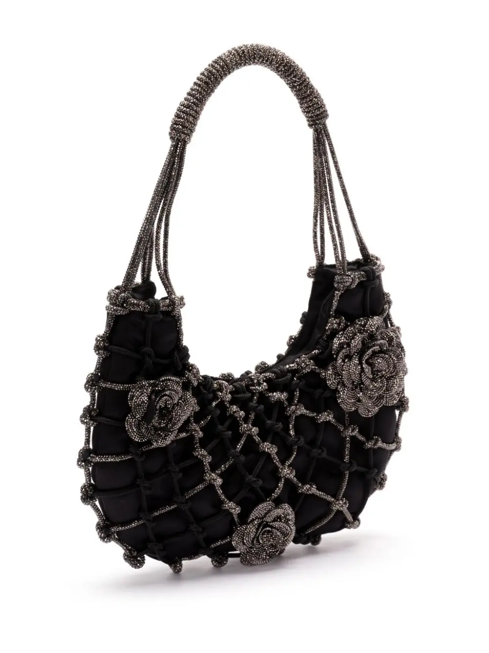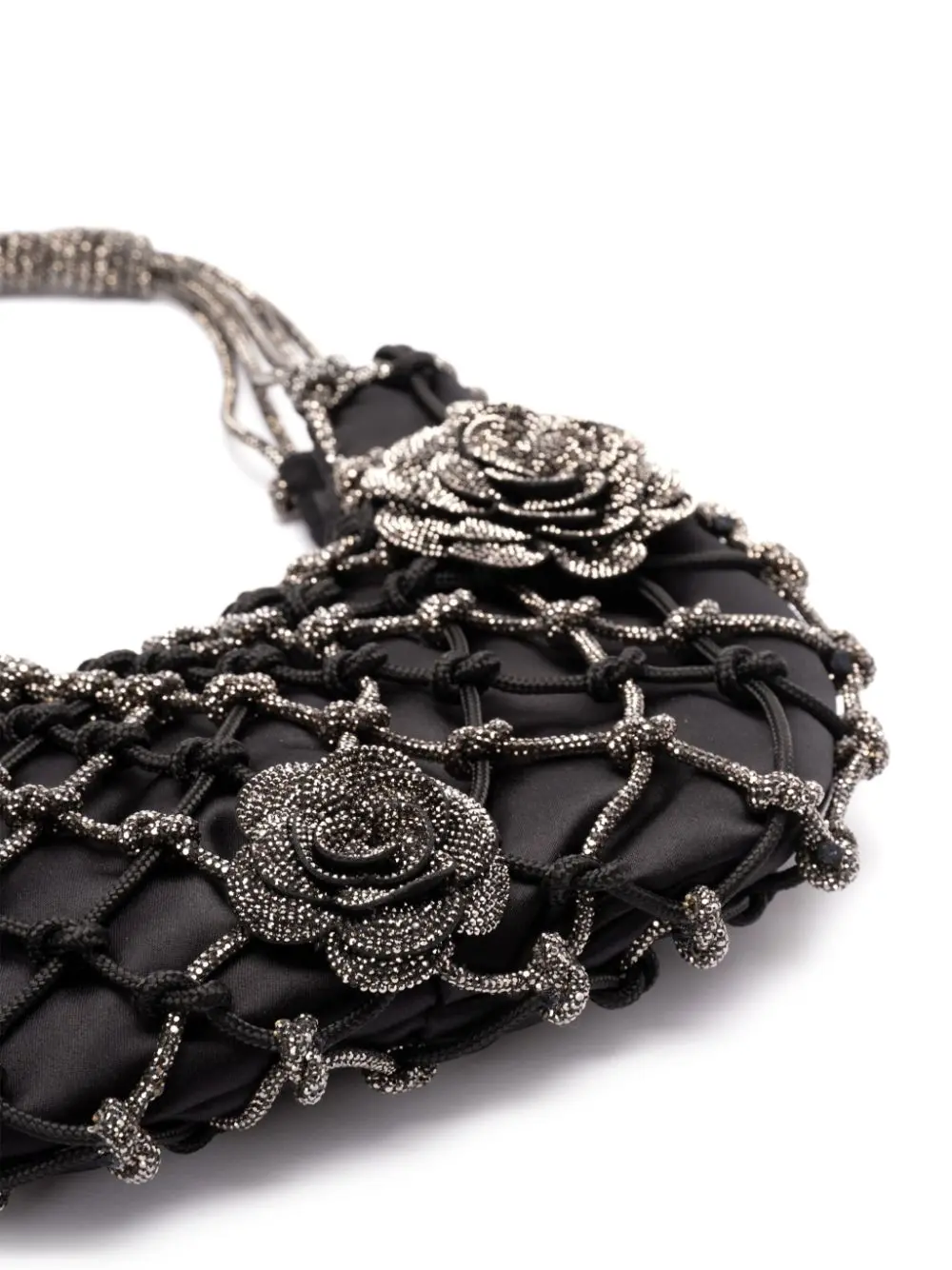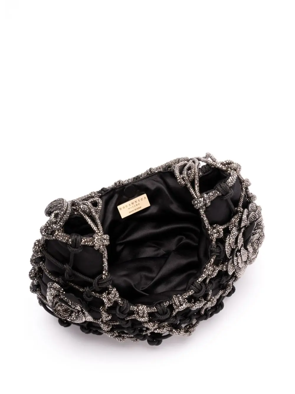 The 'Nodi Ninfa' is this season's must-have bag. Handwoven by skilled artisans using a yarn adorned with tiny crystals. The design is enhanced by floral details that add character, style, and a touch of feminine personality. The refined black satin lining hide the magnetic closure.