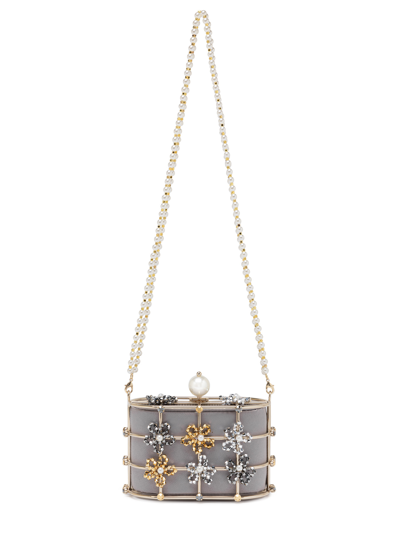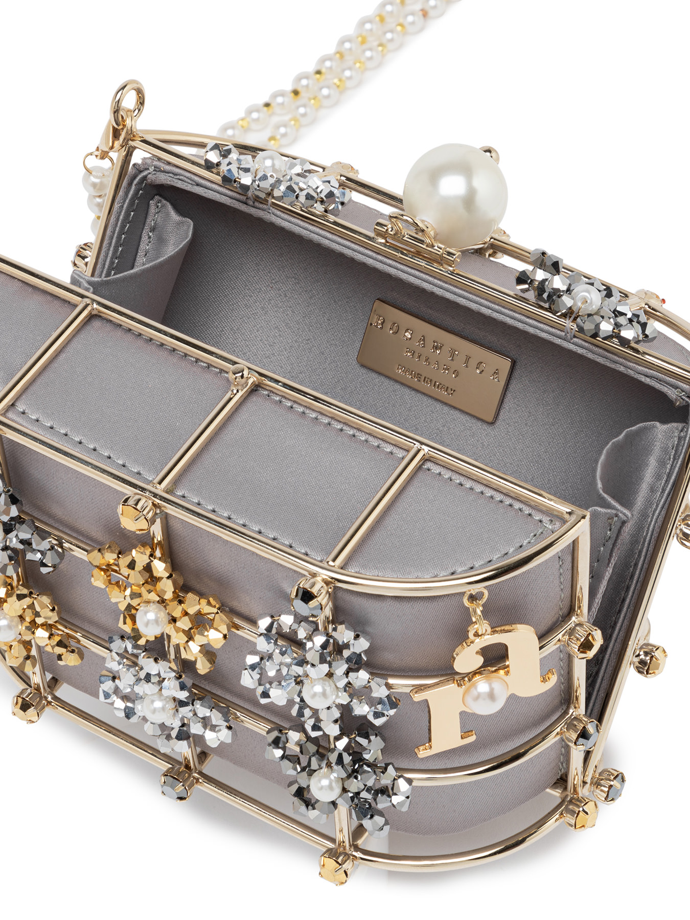 An explosion of elegance for the new "Mini Shell Berillo" bag. A refined "Mini" variant of our iconic Holli, made with the classic golden brass structure embellished with floral details in metallic beads with elegant satin pouch in grey color. This accessory stands out for the central clutch closure with maxi faux pearl and for the new refined removable handle in beads for a practical portability on the shoulder. An important accessory to enrich all your outfits.