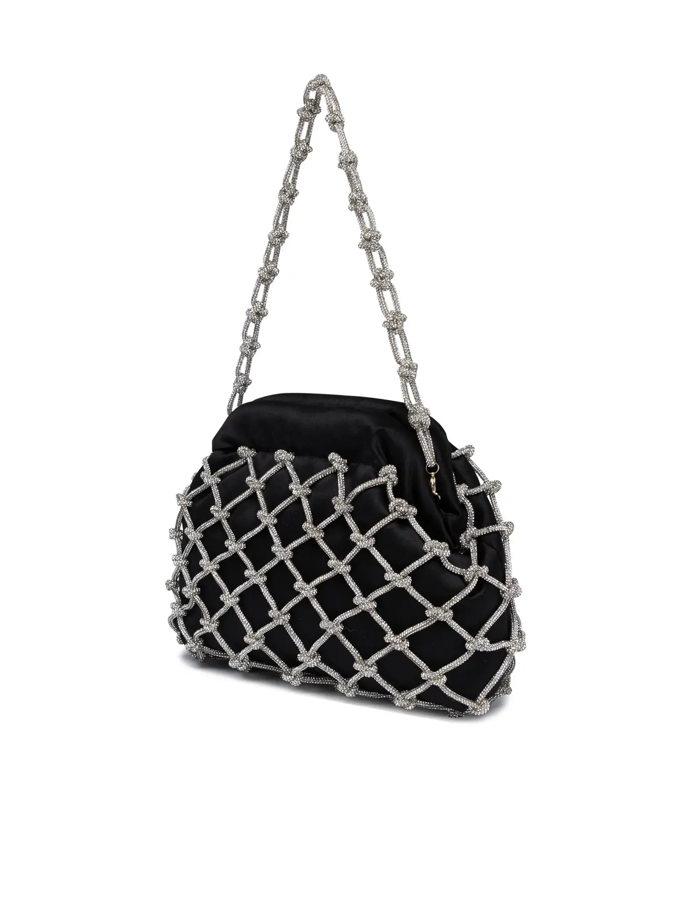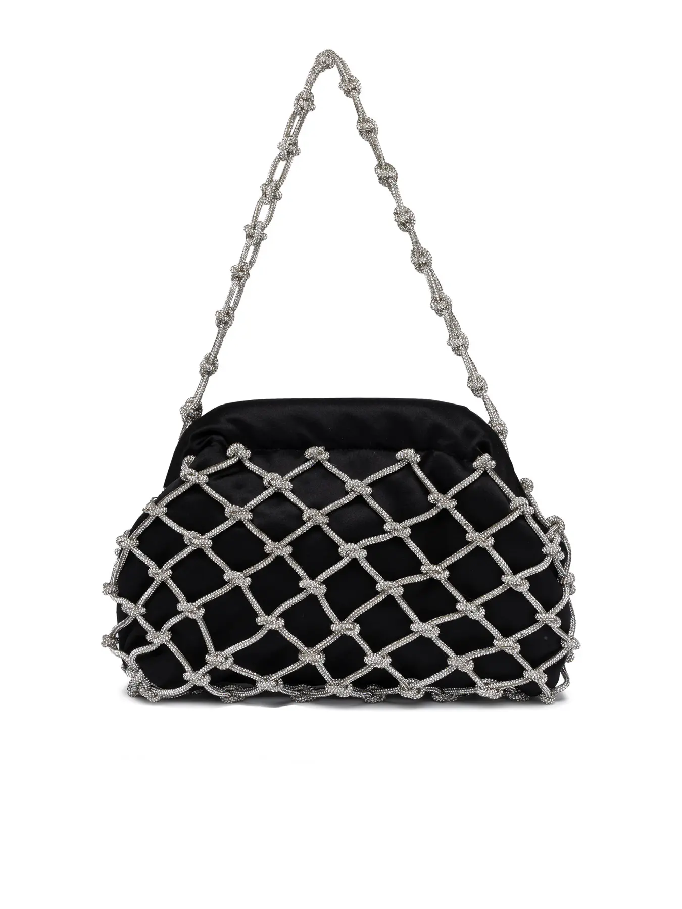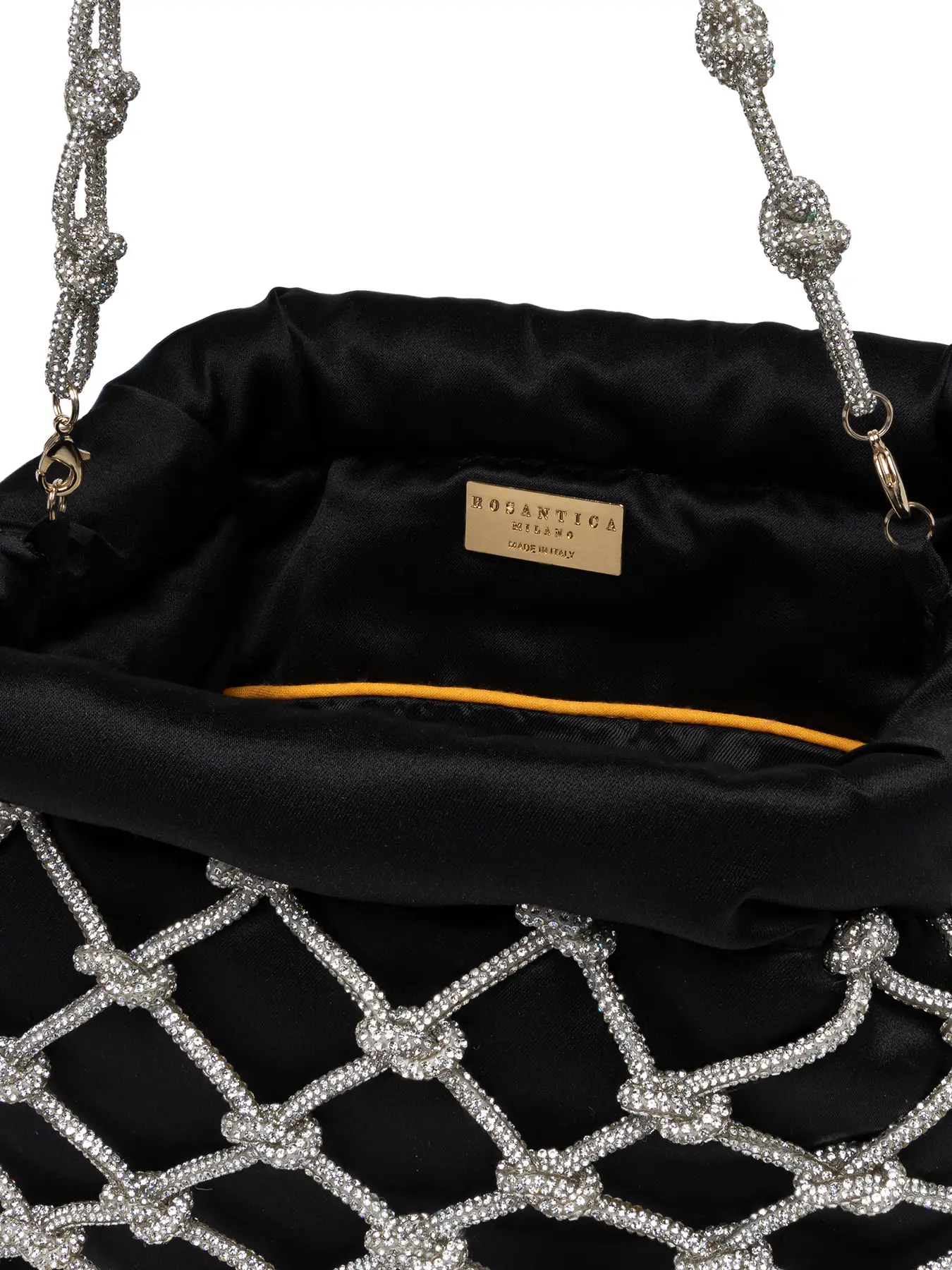 The "BonBon Nodi" clutch is a versatile accessory, capable of adapting to various occasions and styles. Its combination of puffy black satin, hand-woven, crystal-embellished tubulars results in a unique blend of materials and textures. The removable hotfix shoulder strap allows it to be transformed from a clutch to a shoulder bag, making it ideal for completing contemporary and chic outfits.