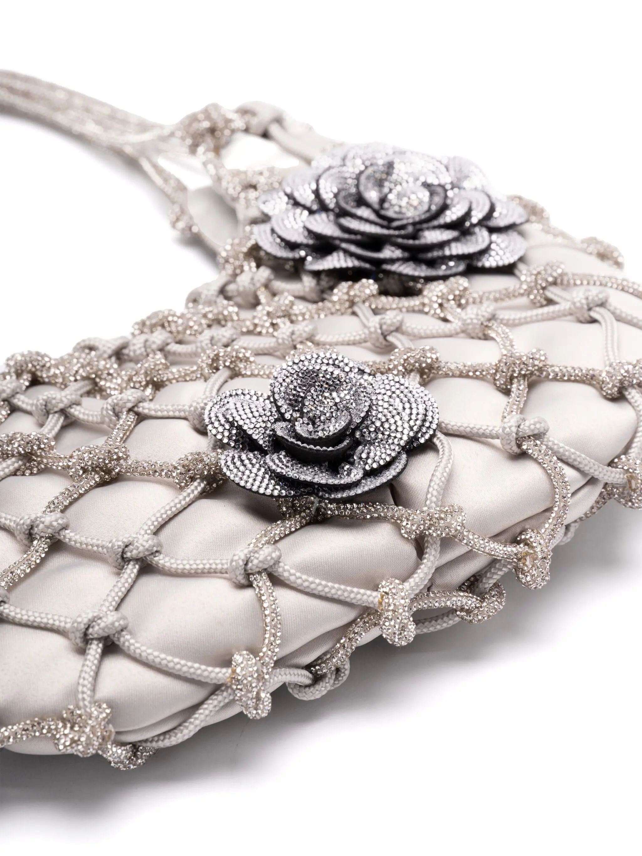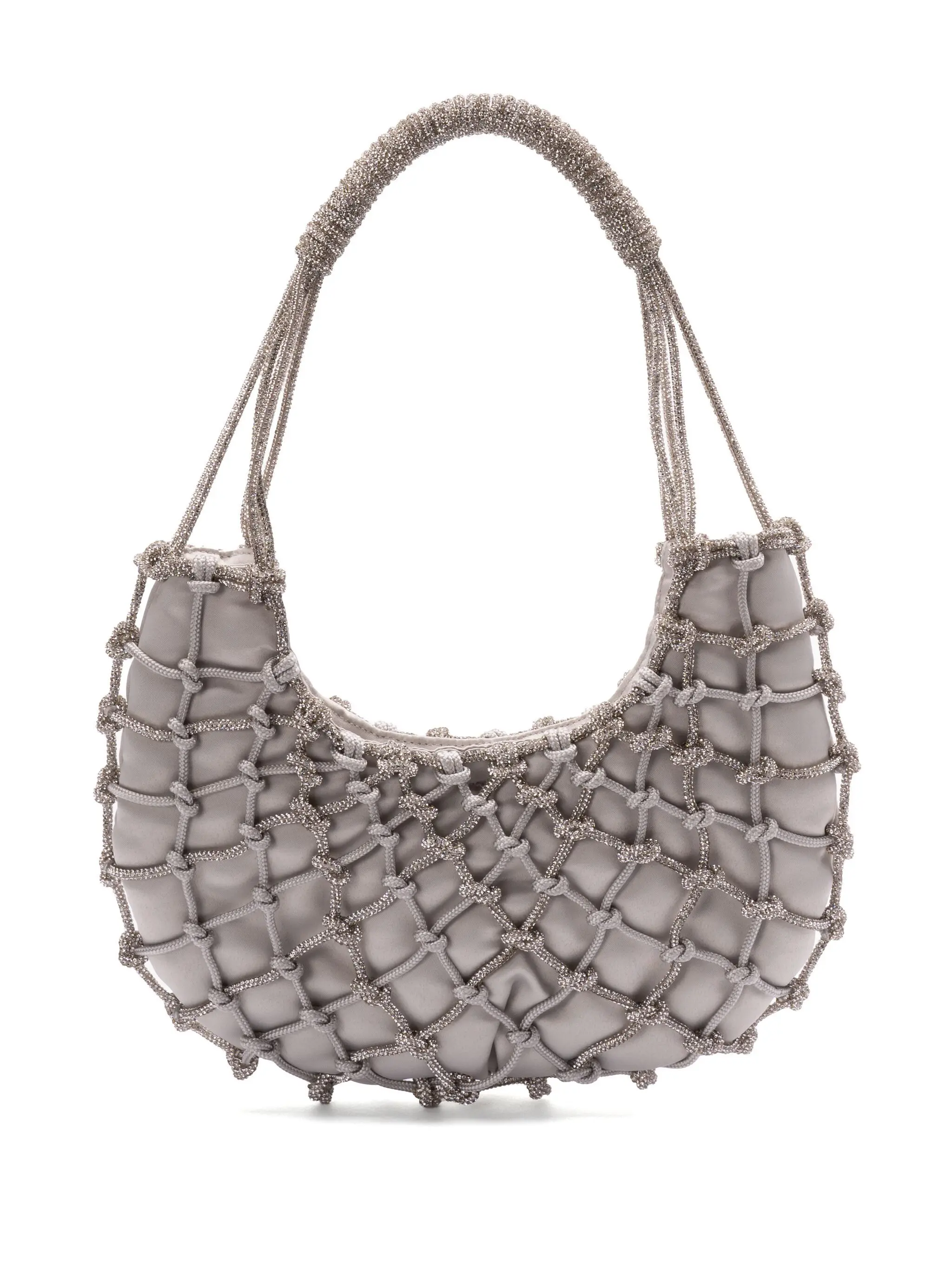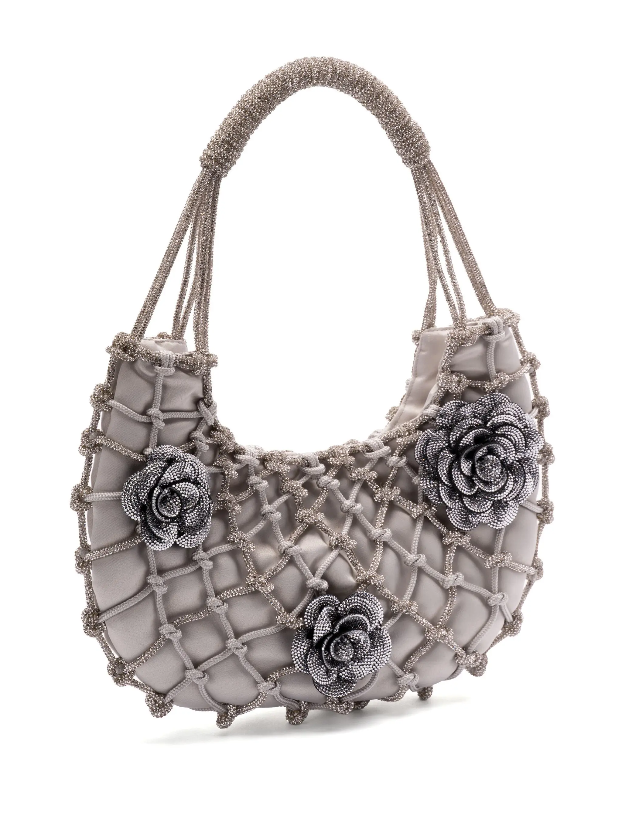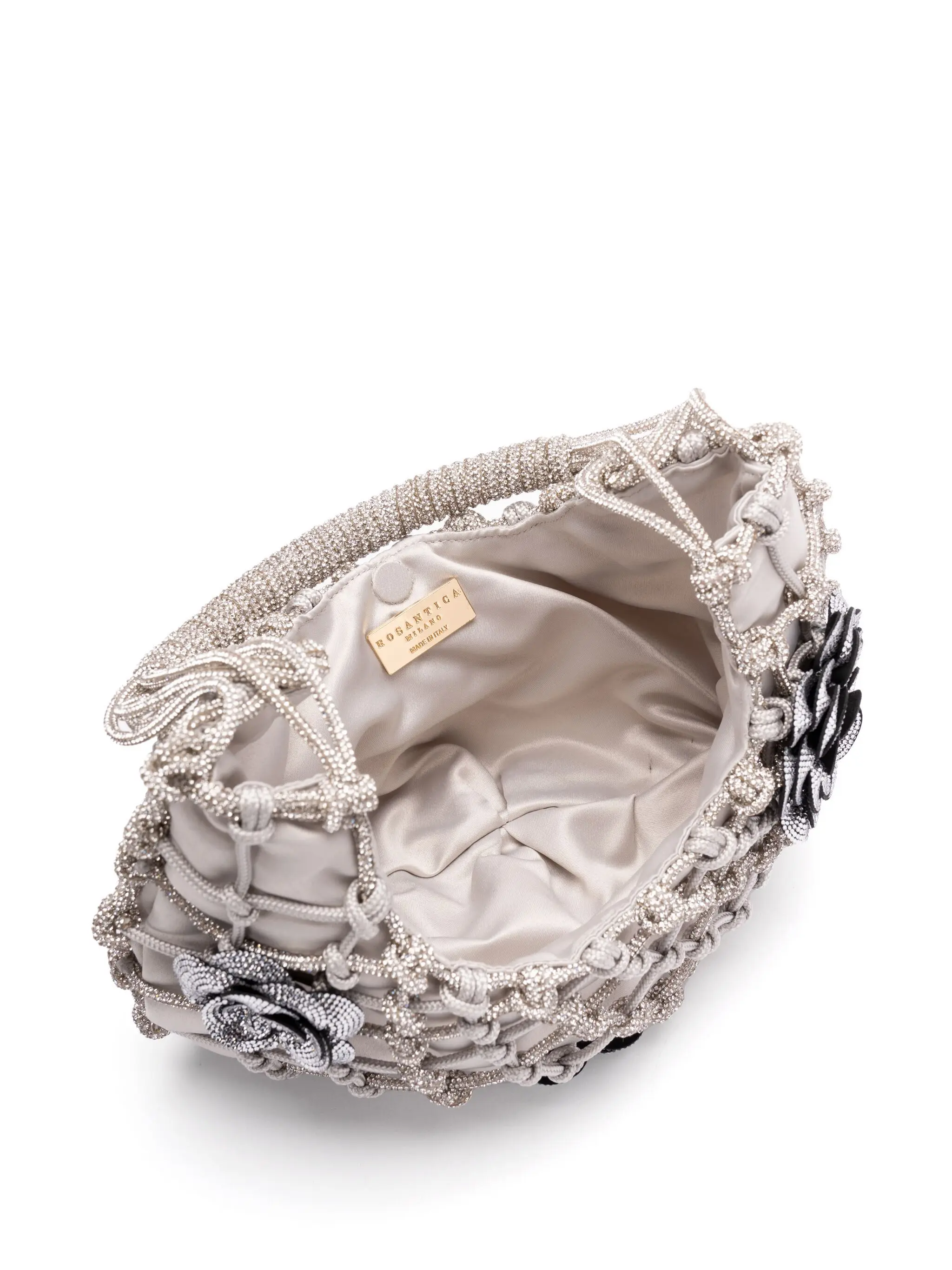 The 'Nodi Ninfa' is this season's must-have bag. Handwoven by skilled artisans using a yarn adorned with tiny crystals. The design is enhanced by floral details that add character, style, and a touch of feminine personality. The refined black satin lining hide the magnetic closure.