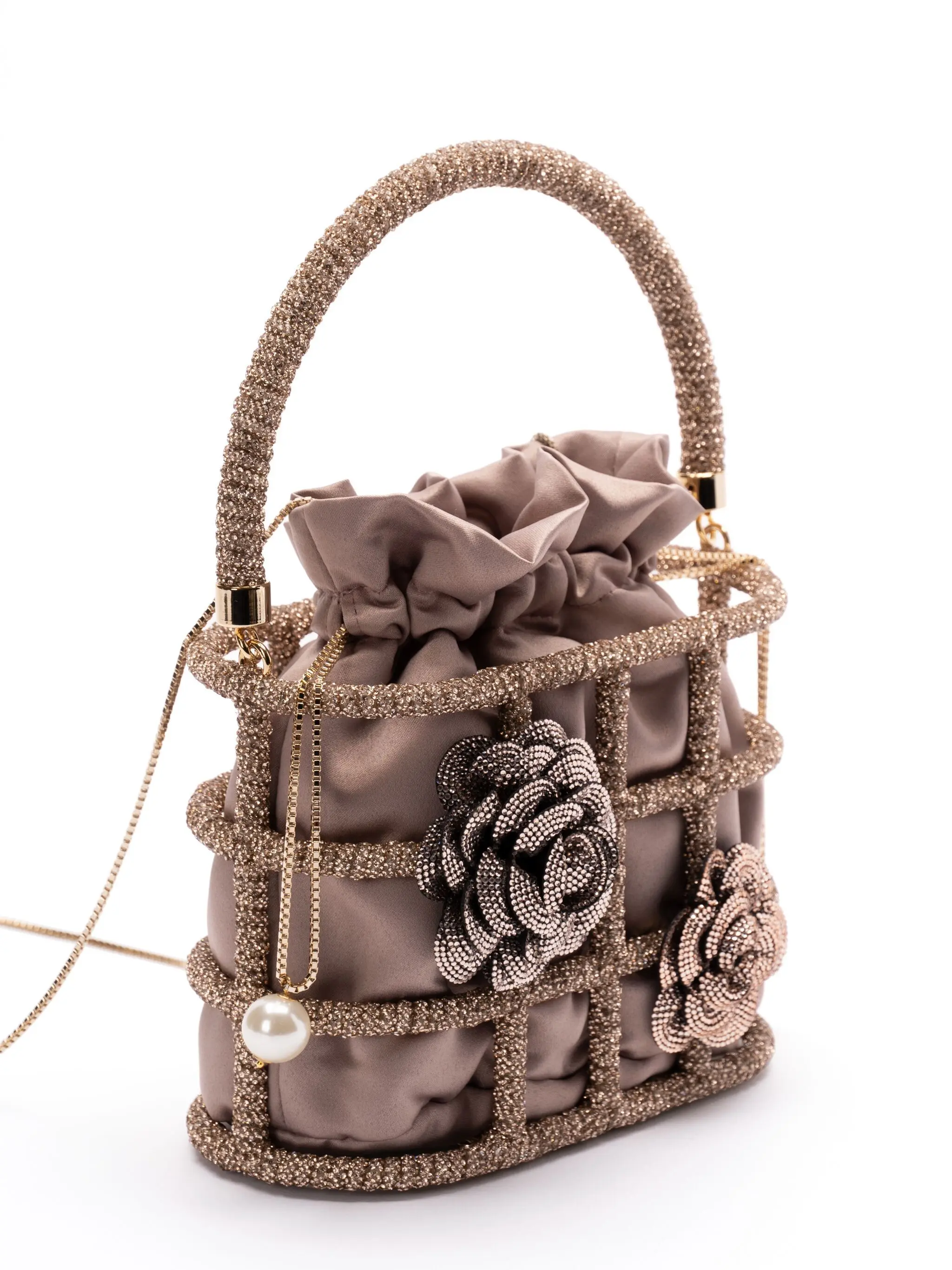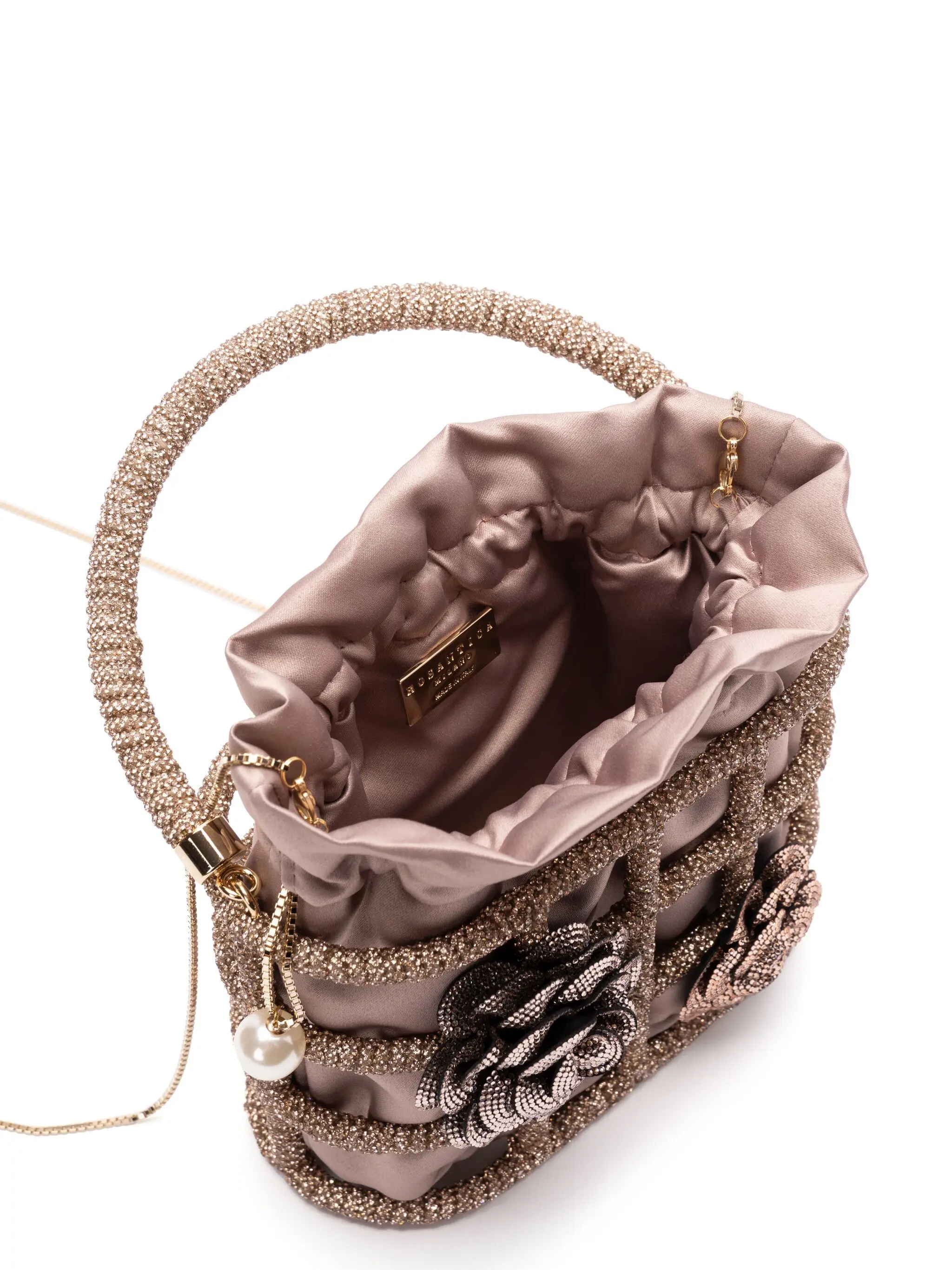 Leave your baggage at the door, because the mini bag trend is still going strong. This Mini Holli Ninfa bag Rosantica is fitted with a crystal-embellished caged design and enriched by elegant flowers. Other key details on this beauty include a dazzling handle, silver-chain drawstring, and a removable pouch.