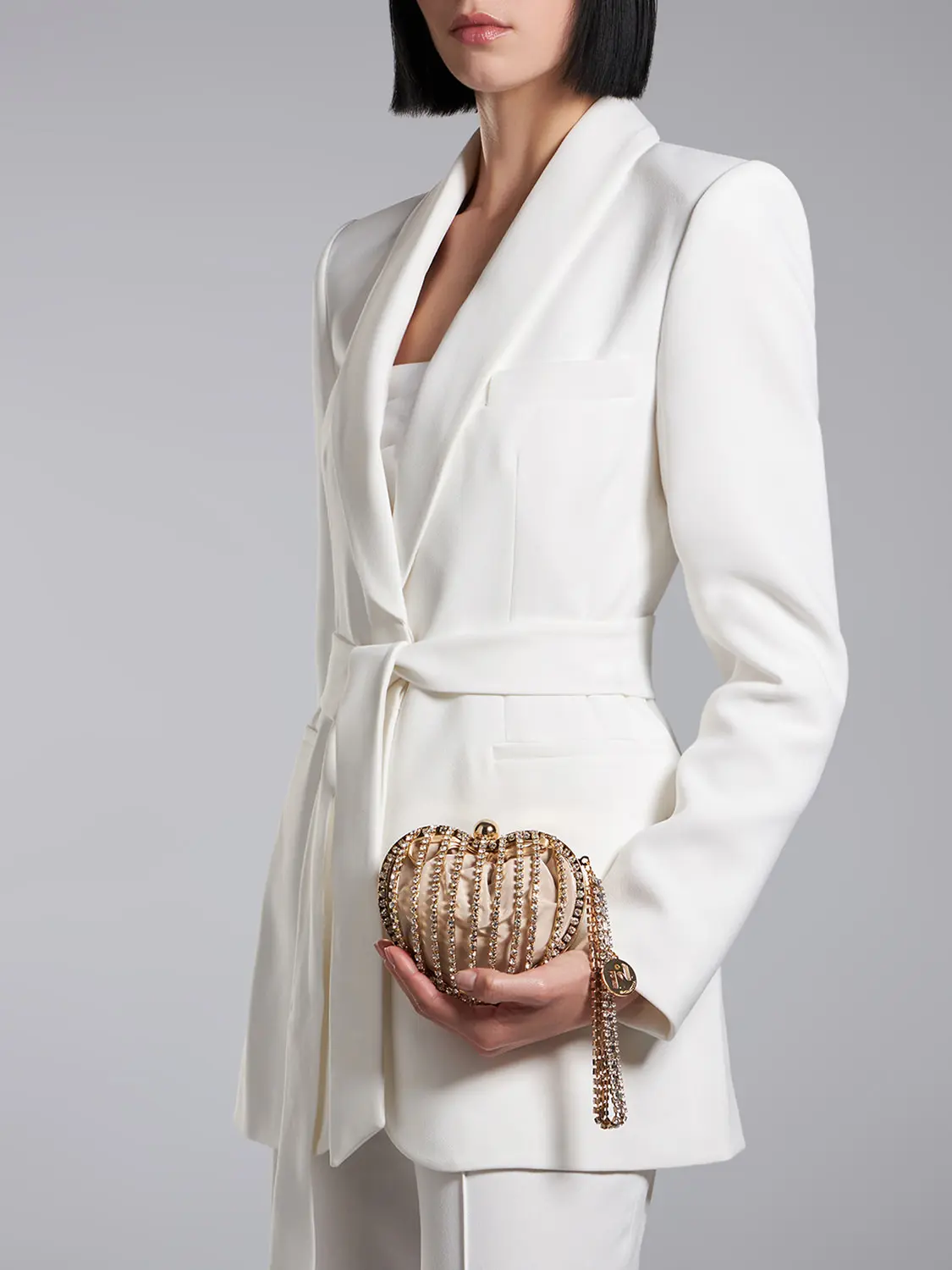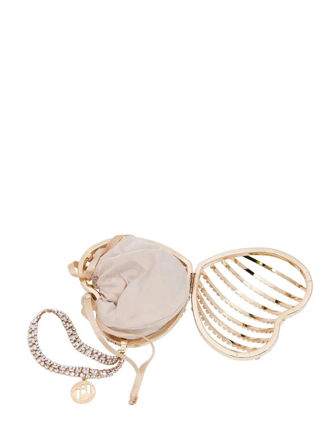 "Sospiro" is the new Rosantica bag with a romantic heart shape. A rigid structure in golden brass and clear crystals with a nude satin fabric pouch. The bag can be worn as clutch with its own wristlet or with its crossbody chain.A precious accessory to enrich and make many original outfits.