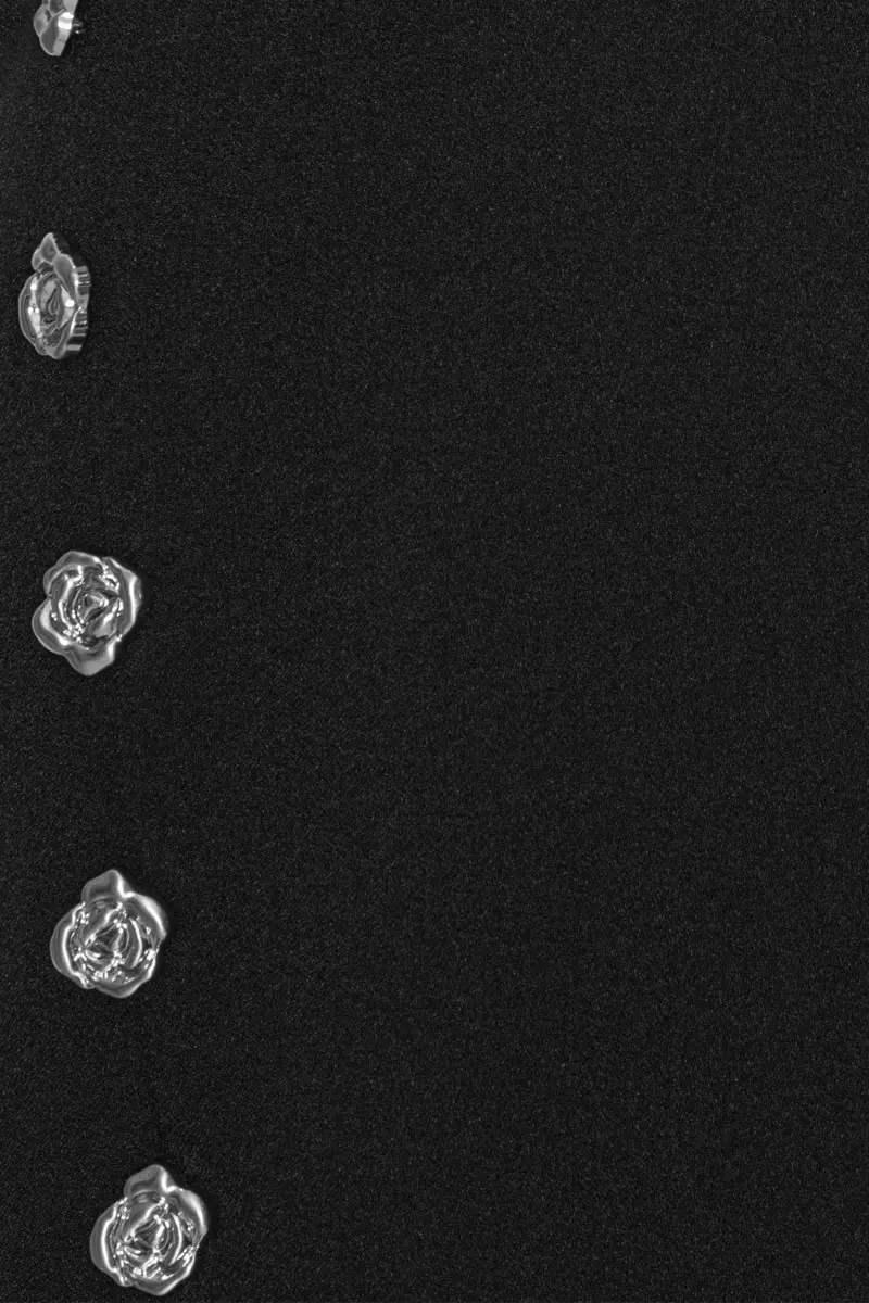 Crepe Button Dress Black features a streamlined silhouette with a concealed back zipper. The hemline falls to a mid-length and maintains a structured finish.