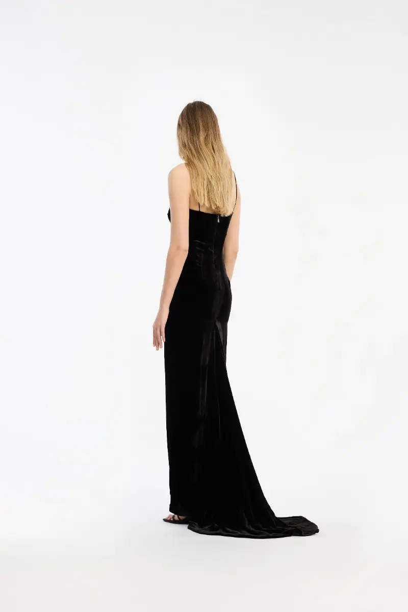 Velvet Maxi Train Dress Black is made from a silk-viscose velvet blend with a floor-length silhouette and a subtle train. It features thin shoulder straps, a square neckline, and a fitted bodice. The dress is lined.