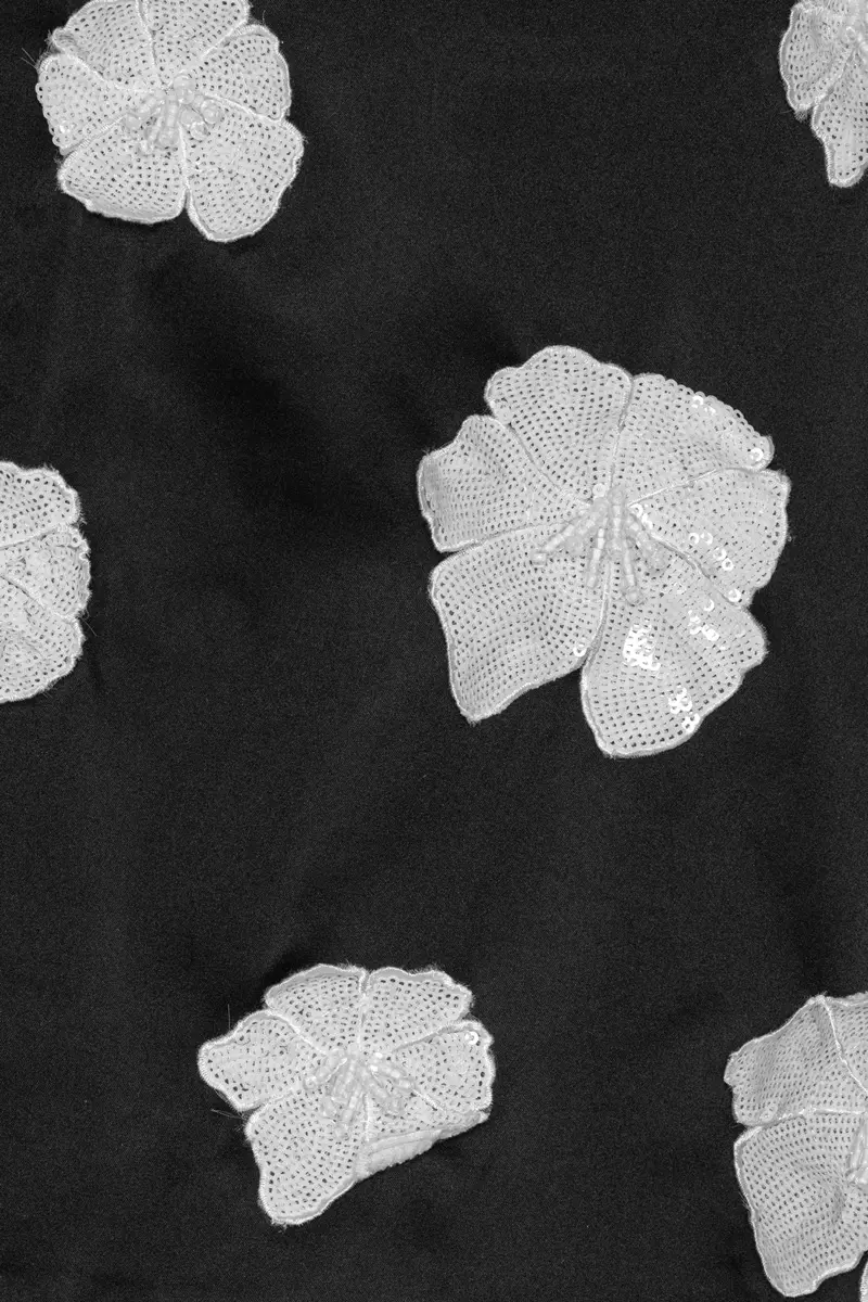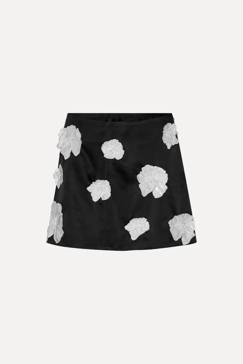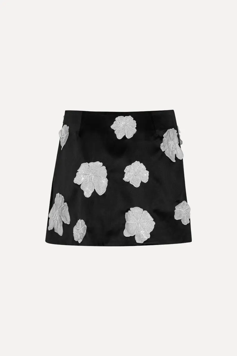 This mini skirt crafted from heavy satin features intricate 3D flowers for a touch of elegance. With a convenient side zipper, it's both stylish and easy to wear.
