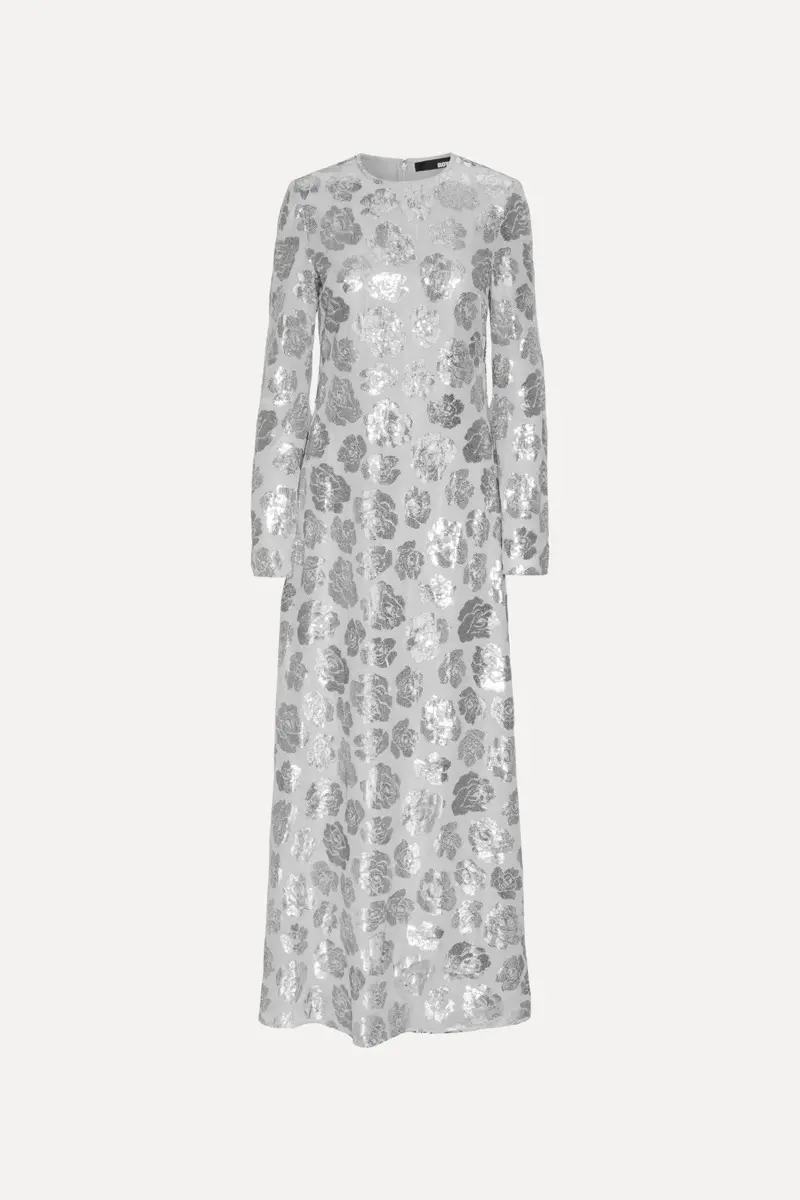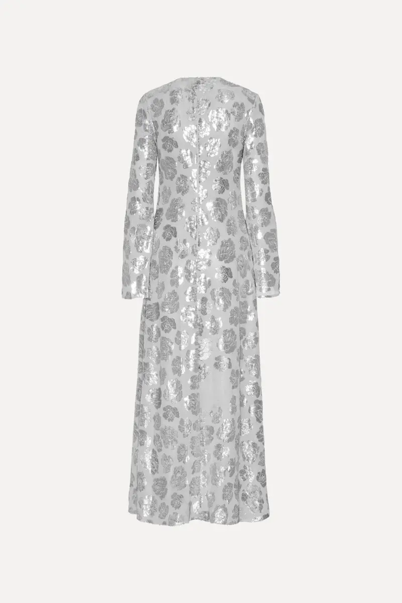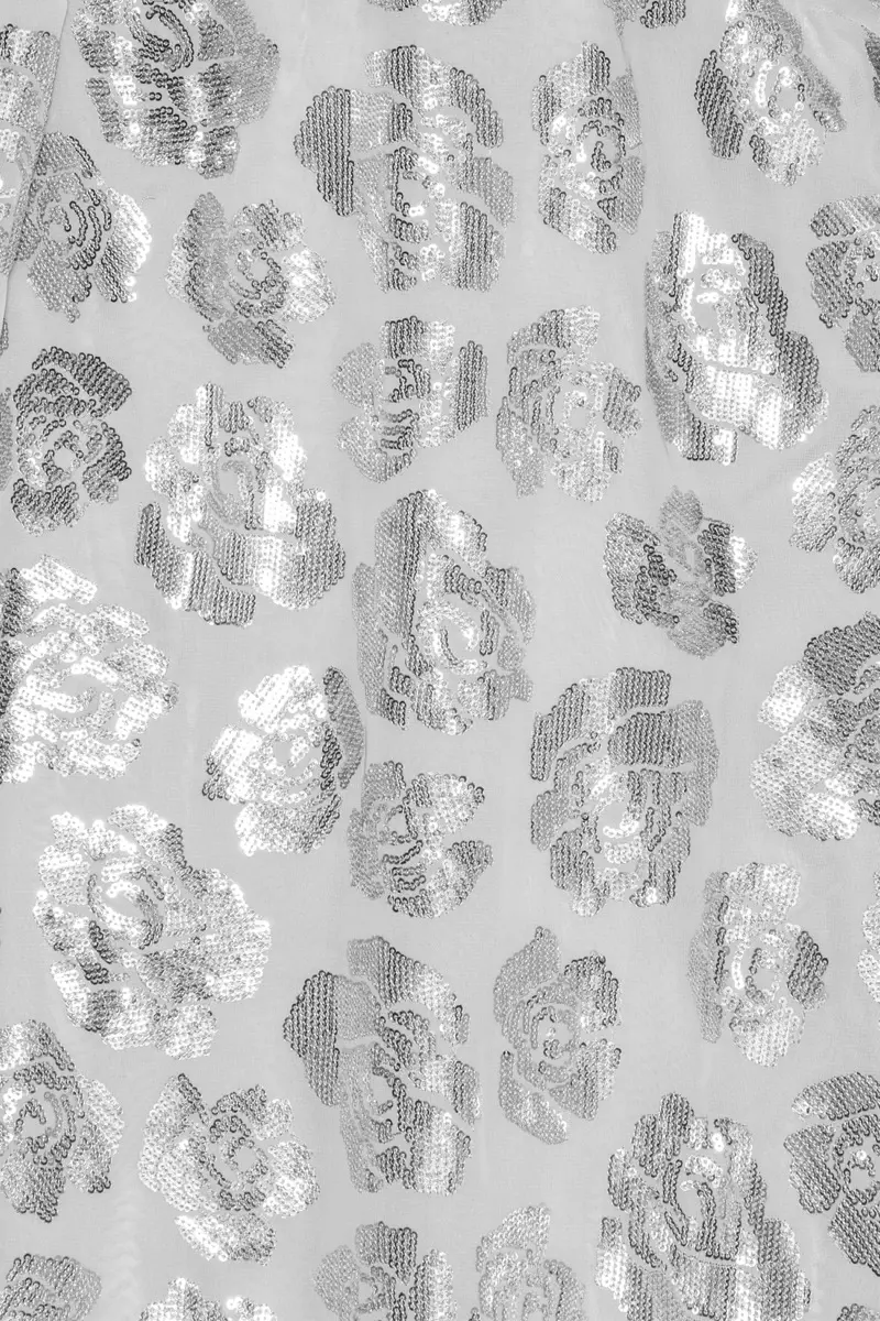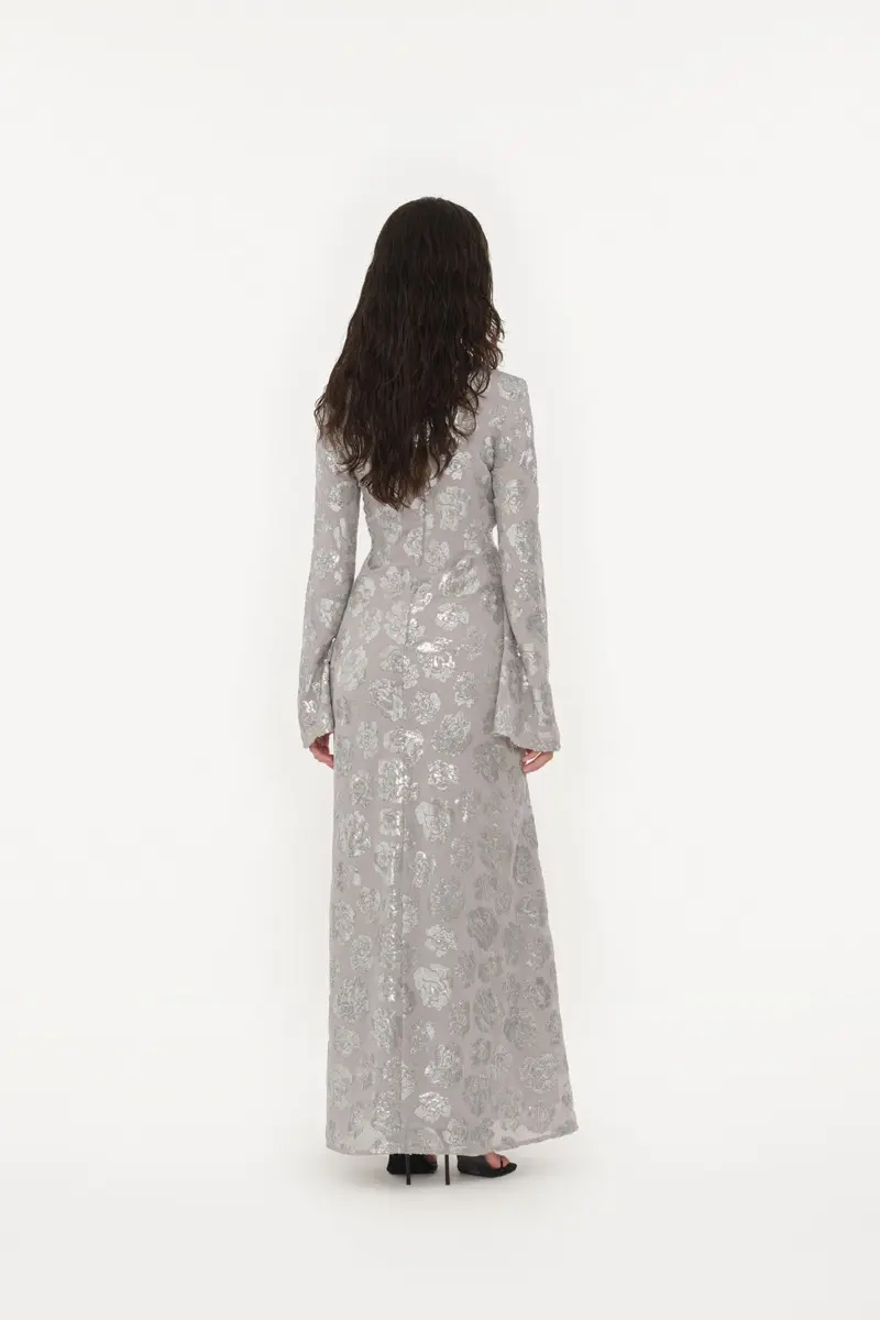 This maxi dress boasts long, flared sleeves and a shimmering display of silver flower sequins. With a shaped A-line silhouette and a convenient back zipper, it's both flattering and easy to wear. Perfect for making a glamorous entrance at any event.