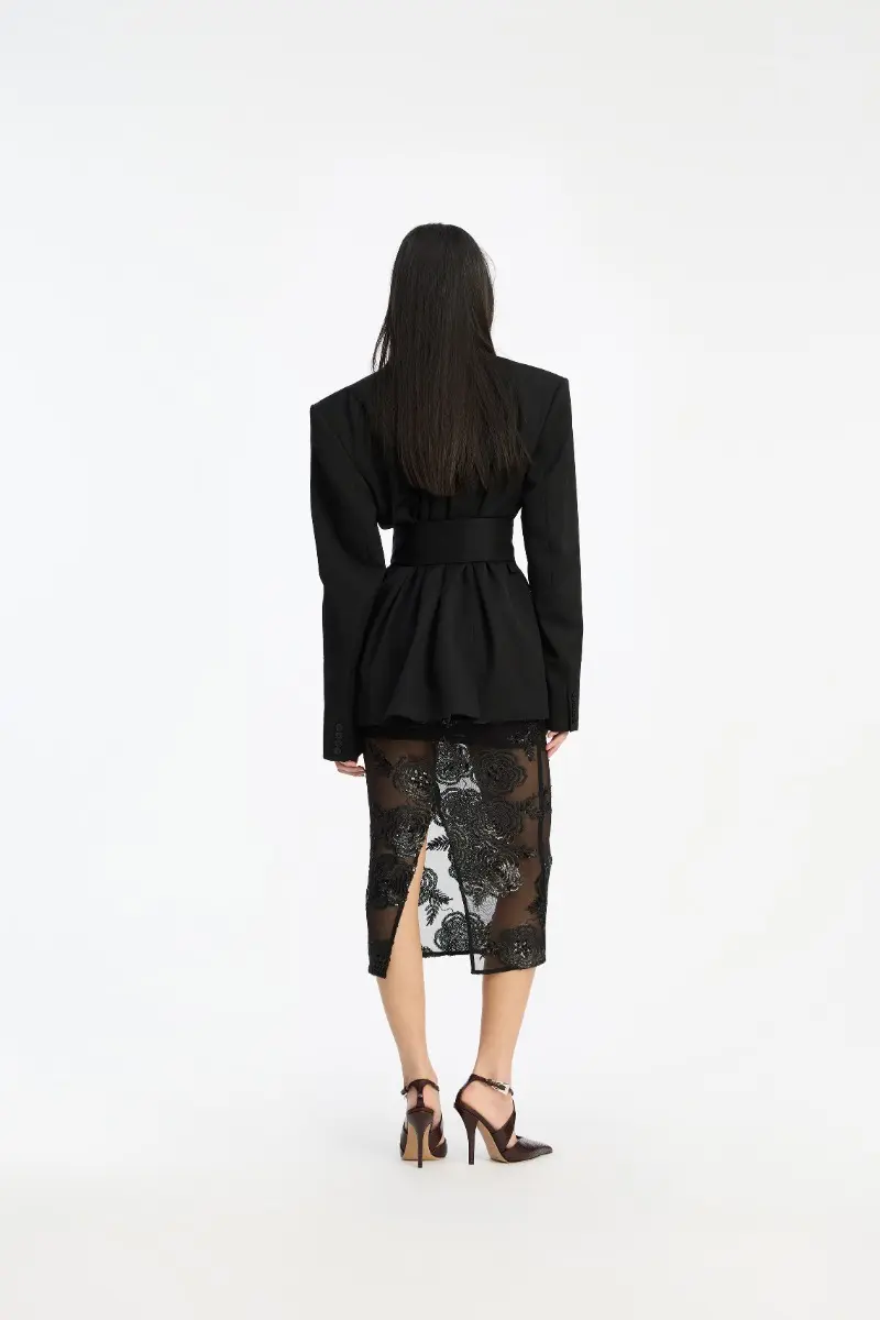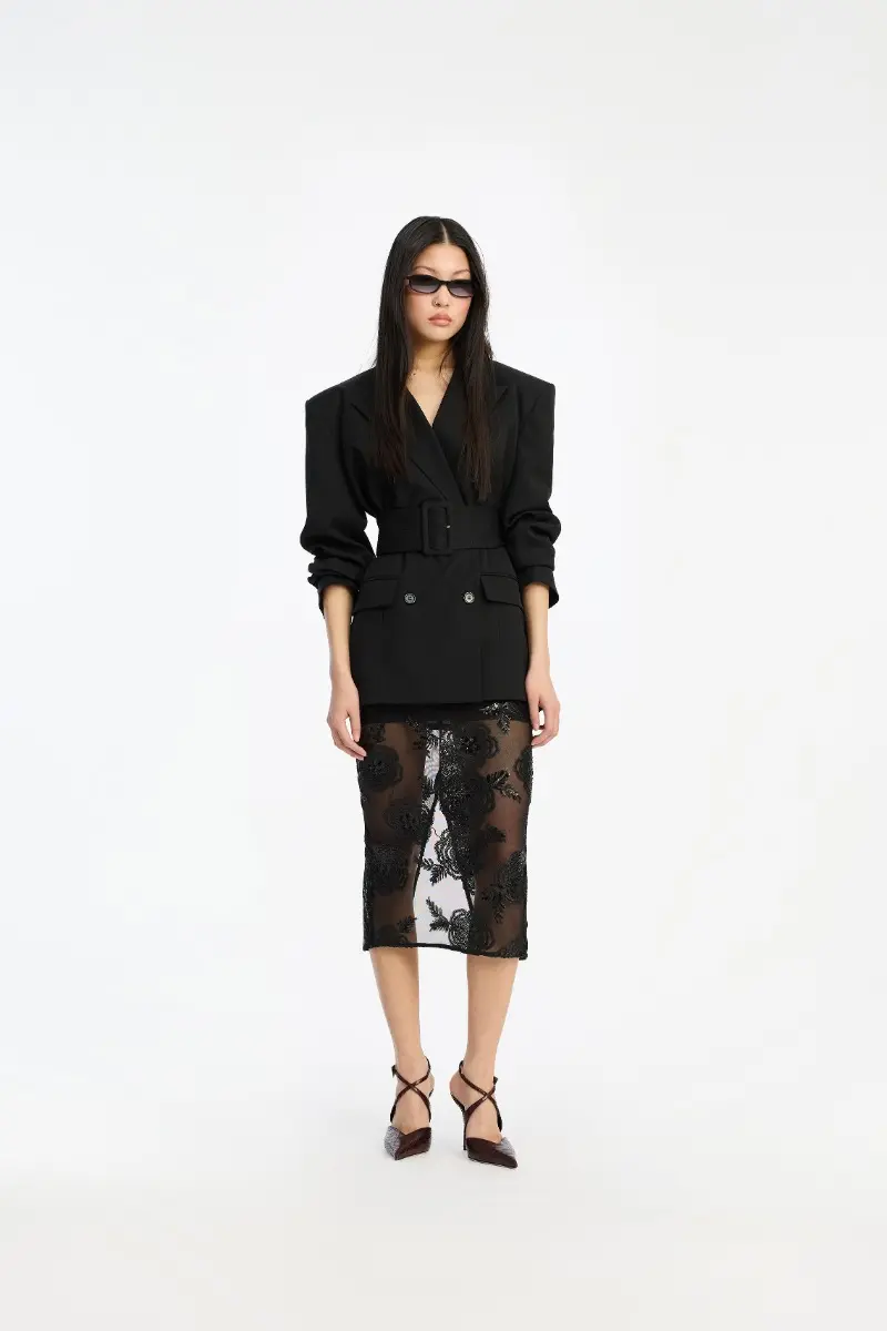 Belted Blazer Black is a double-breasted blazer. The design features sharp shoulders and a wide belt that accentuates the waist. The blazer has front flap pockets and buttoned cuffs. The blazer is lined.