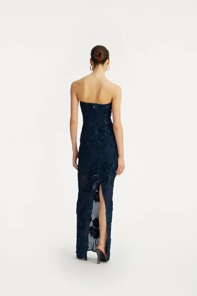 The 3d Mesh Maxi Dress features a strapless neckline and a fitted silhouette. It is designed with 3D floral appliqués placed throughout the body, adding dimension and texture. The dress has a maxi length with a slit at the back for ease of movement. A hidden zipper is placed at the back for closure.