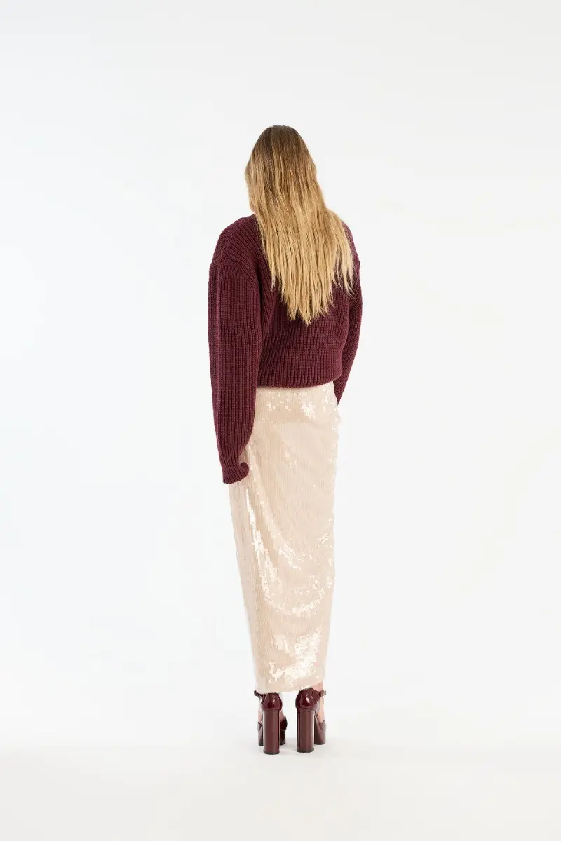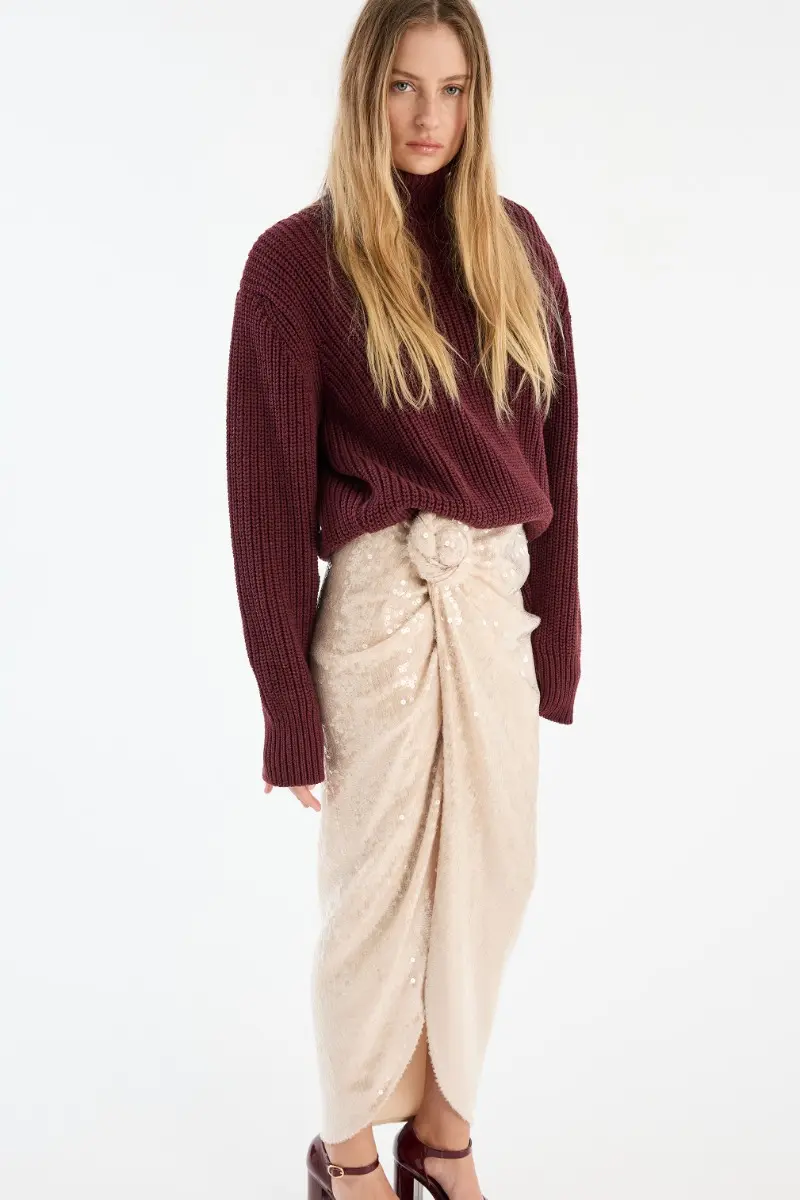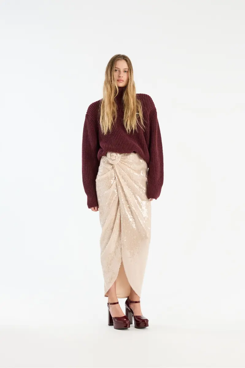 Sequins Knot Skirt Creme is a fitted midi skirt adorned with sequins. It features a wrap-effect front with draped detailing and a decorative flower at the waist. The skirt is lined.