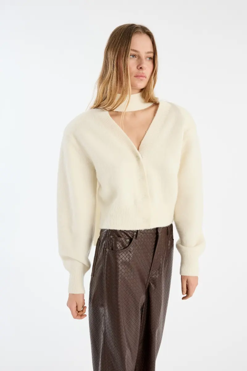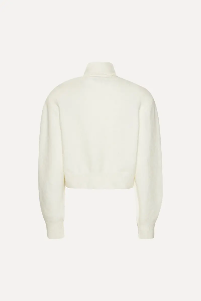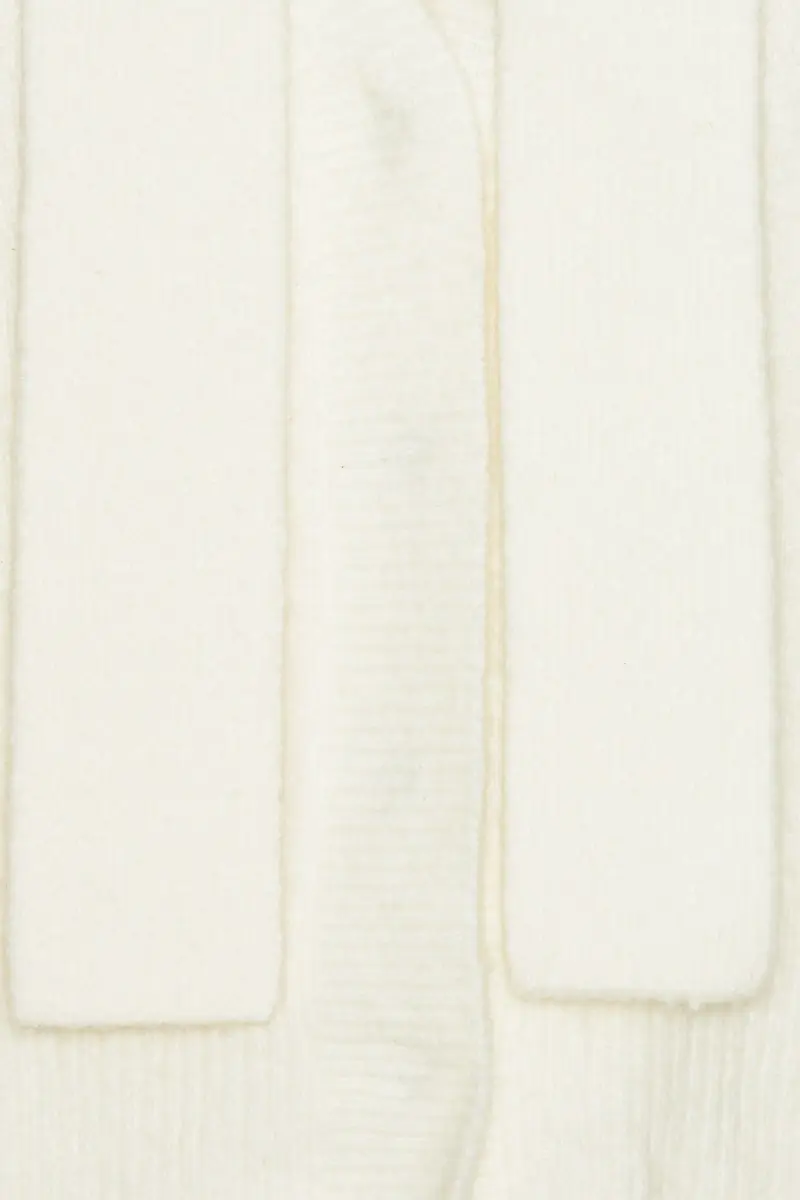 Knit Scarf Cardigan White is a cropped cardigan with slightly dropped shoulders and long sleeves. It features a ribbed hem, cuffs, and neckline, and is detailed with a built-in scarf attached at the collar that drapes down the front and back. The cardigan is made from a soft and fluffy wool and alpaca blend.