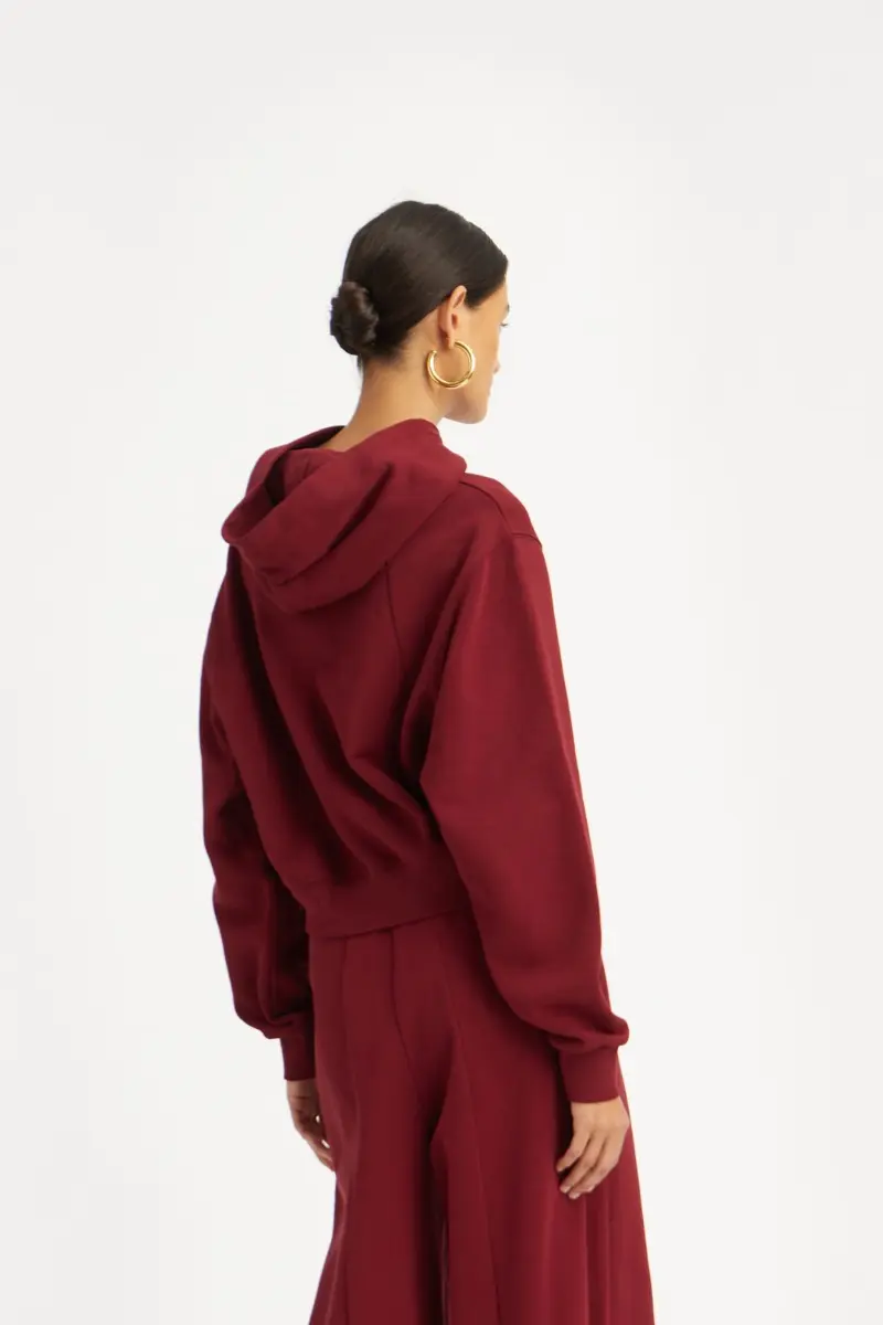 The Terry Back Cropped Hoodie features a cropped silhouette with long sleeves, ribbed cuffs, and a crossover hood. Designed with raglan sleeves and a soft texture, it is finished with a small ROTATE logo label at the hem.