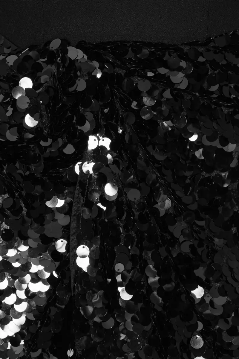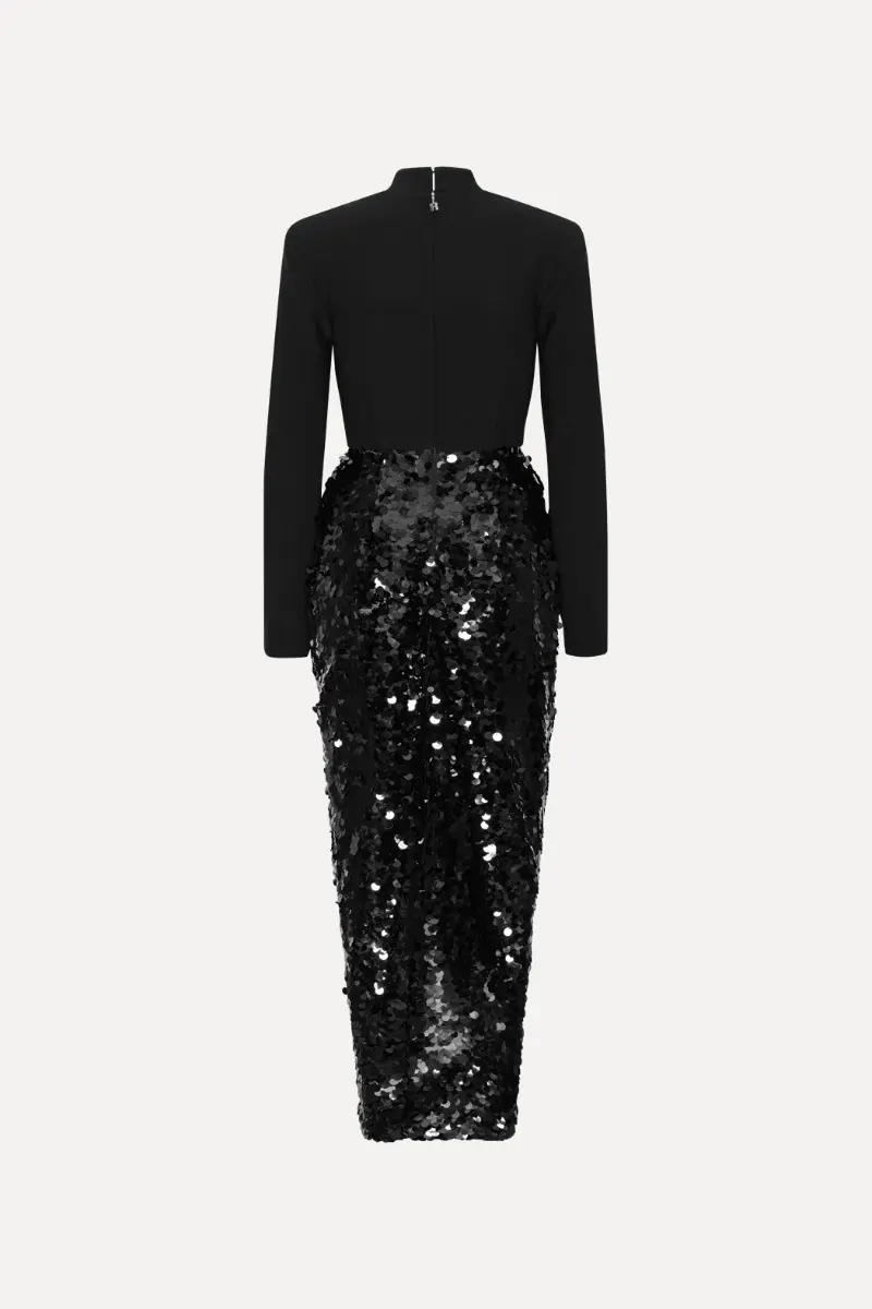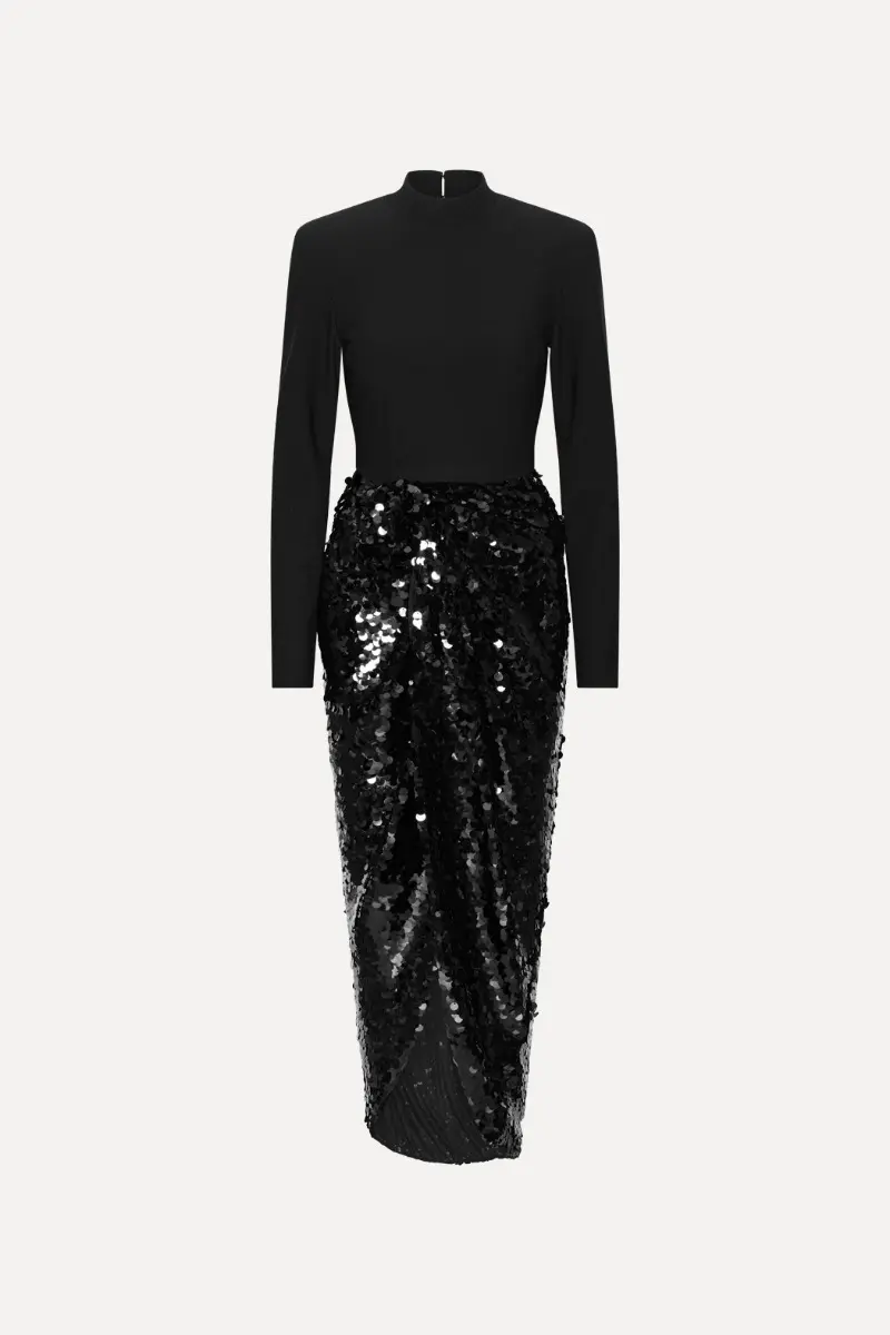 Knotted Midi Dress Black has a fitted jersey top with long sleeves and a high neckline. The sequined skirt wraps into a gathered knot detail at the waist. The dress is fastened with a button at the back of the neck and is lined. Composition 1: 95% Polyester (Recycled) 5% Elastane
