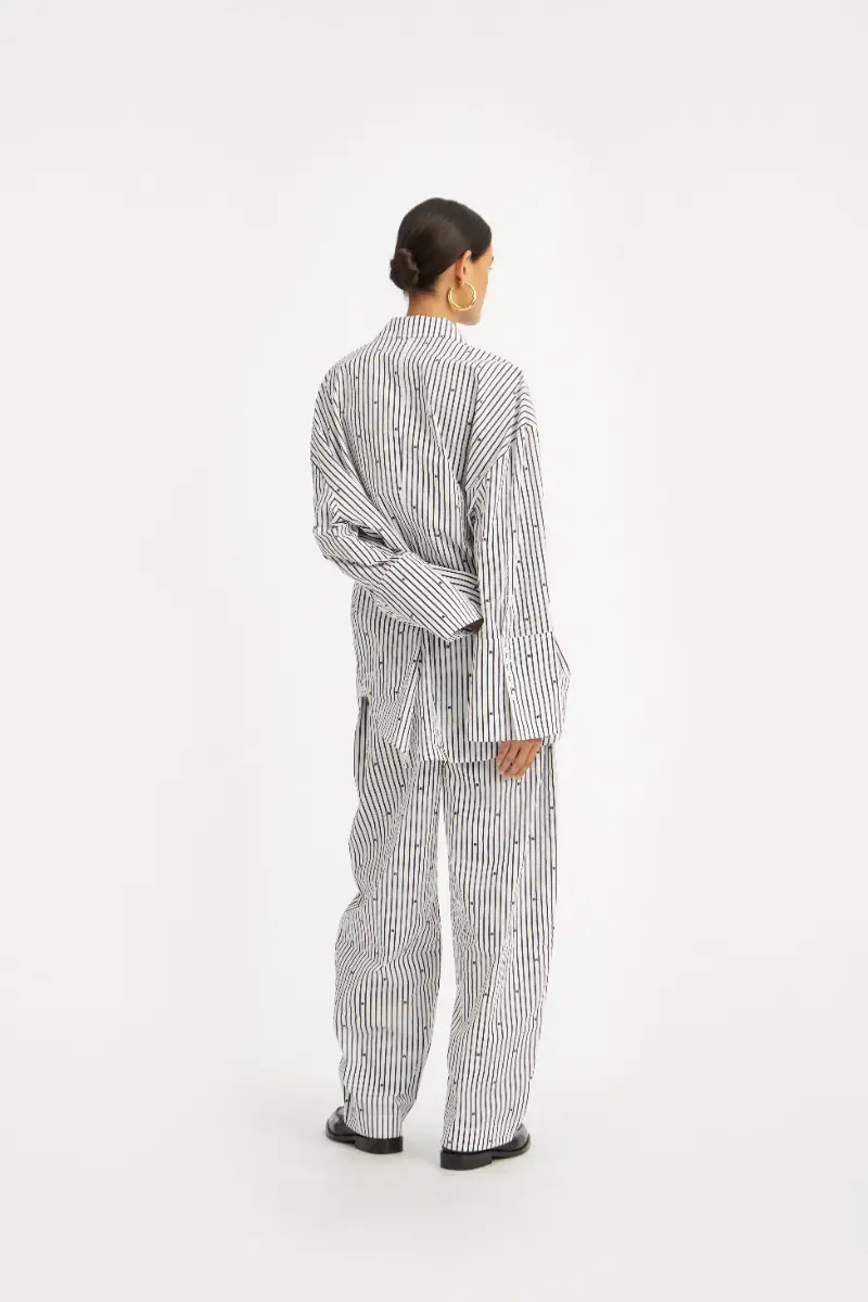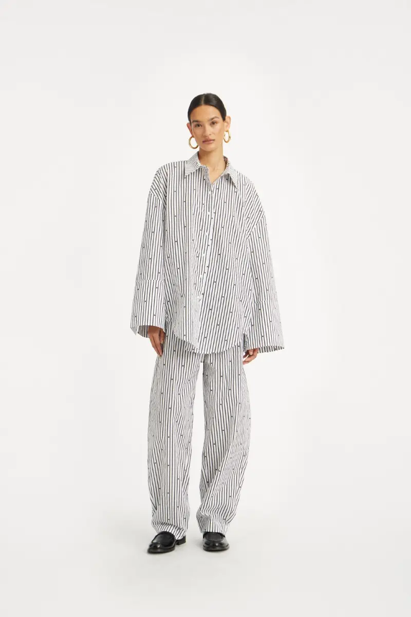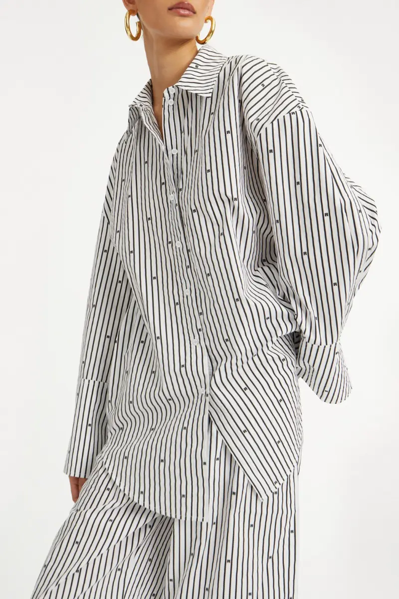 The Poplin Oversized Shirt is a statement in effortless confidence—crafted in crisp organic cotton with an oversized silhouette that moves with you. Its sharp collar, curved hem, and all-over ROTATE monogram stripe bring a refined edge to everyday wear.