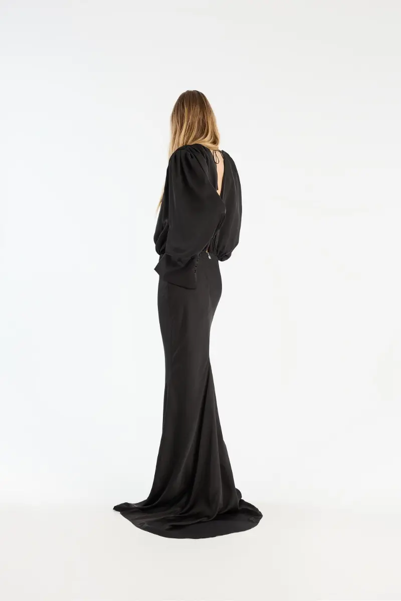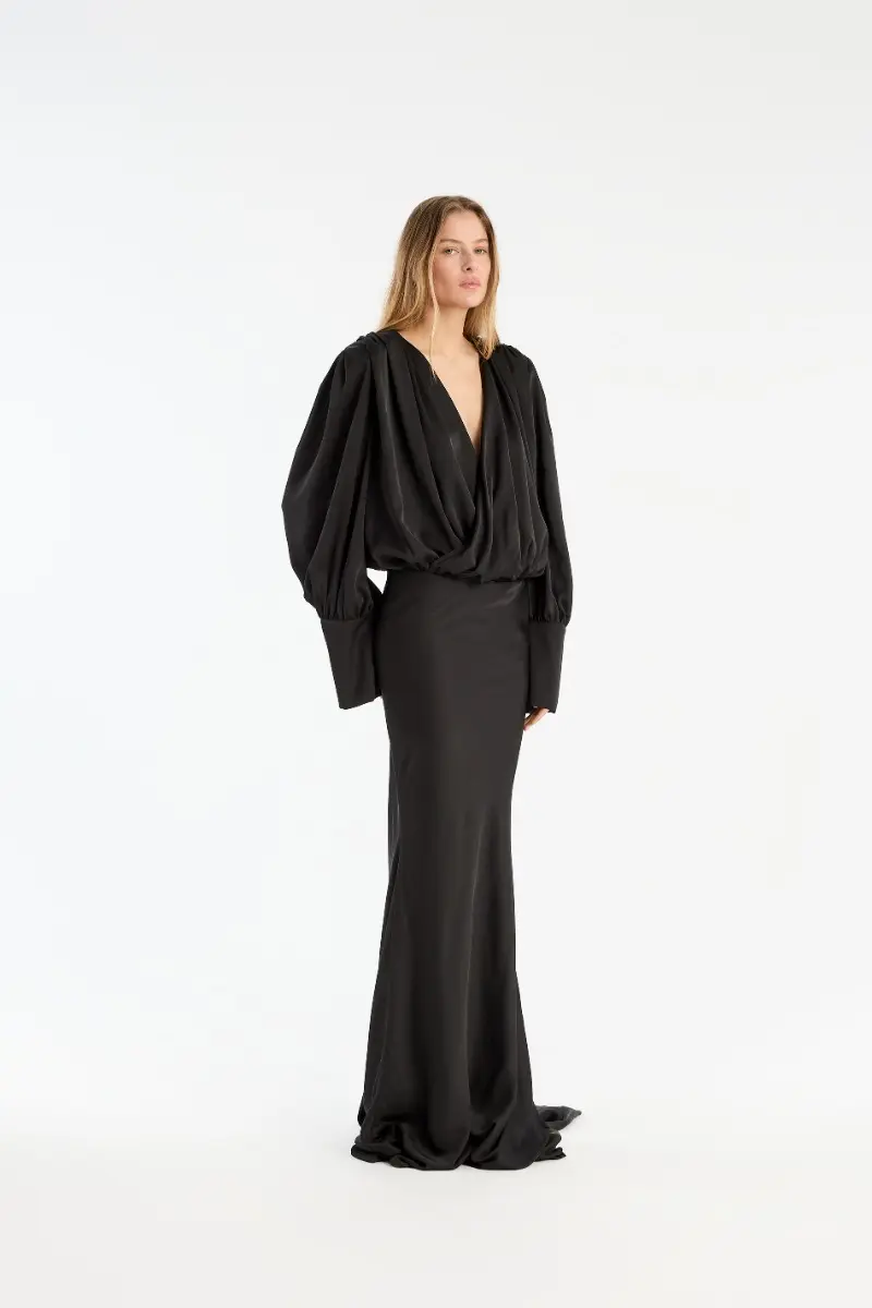 Chiffon Ls Maxi Dress Black features long voluminous sleeves with wide cuffs, a draped V-neckline, and broad shoulders.