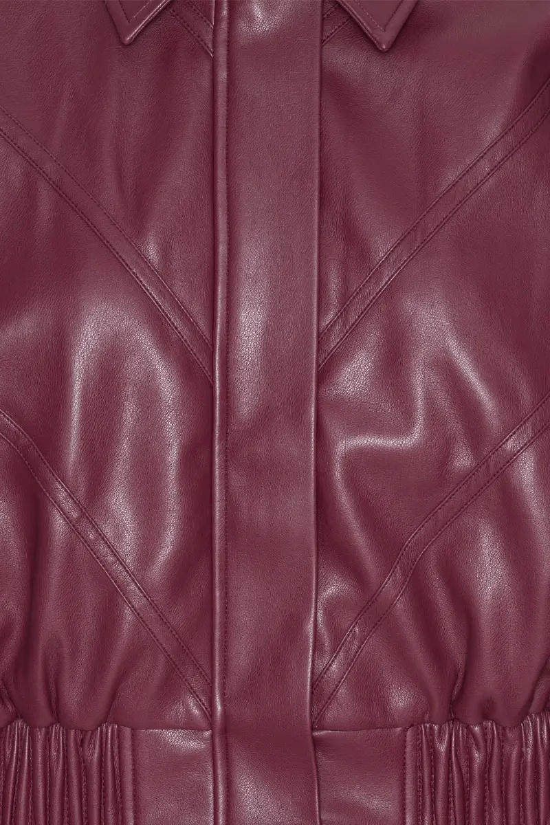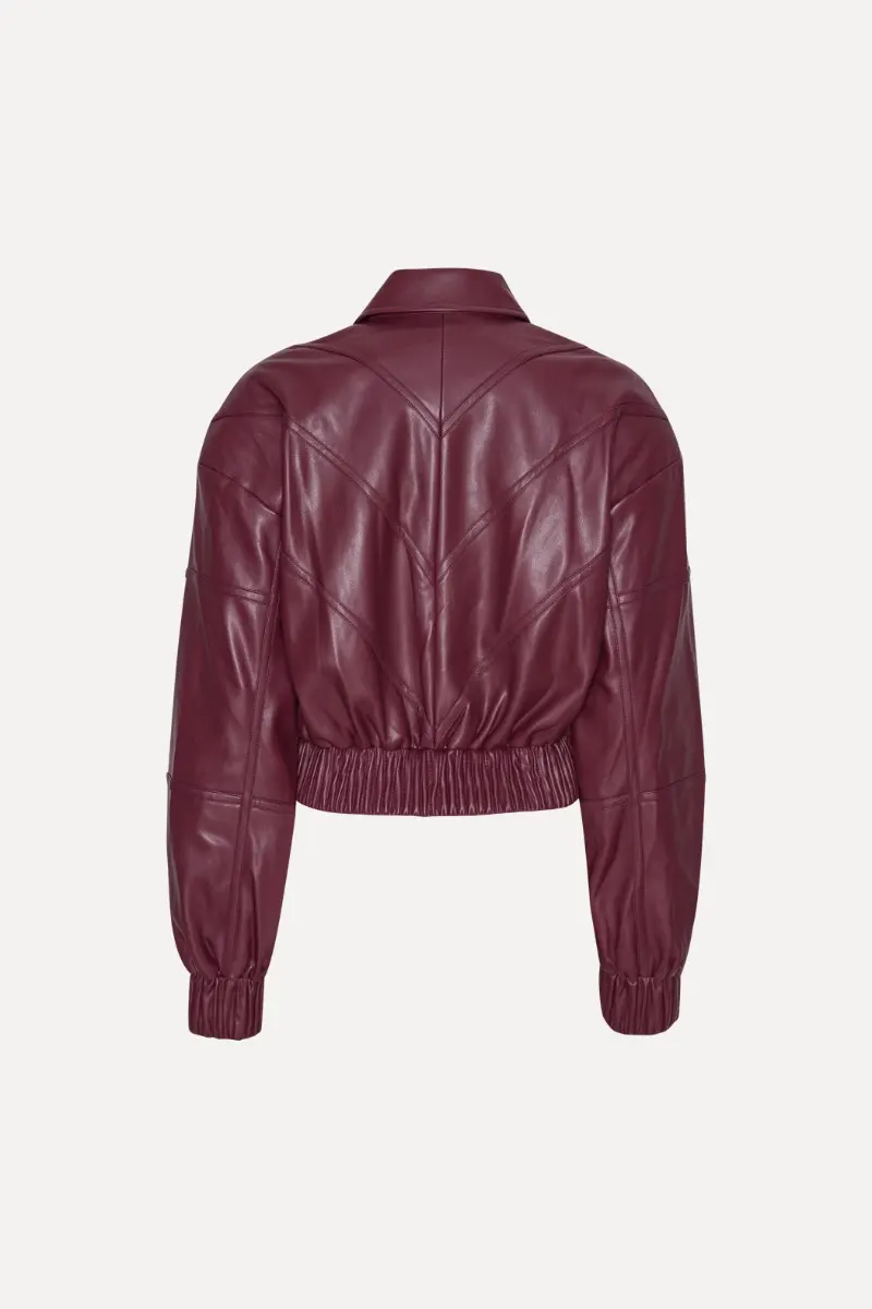 Bomber Jacket Bordeaux features a structured design with a pointed collar and concealed front closure. The cropped silhouette is defined by elasticated cuffs and hem. Angular paneling runs across the front and back, adding dimension. The long sleeves have a slightly voluminous shape. Designed to pair seamlessly with the Mid Waisted Piping Pants Bordeaux for a coordinated look.