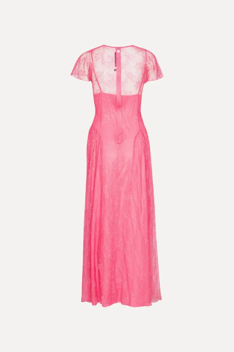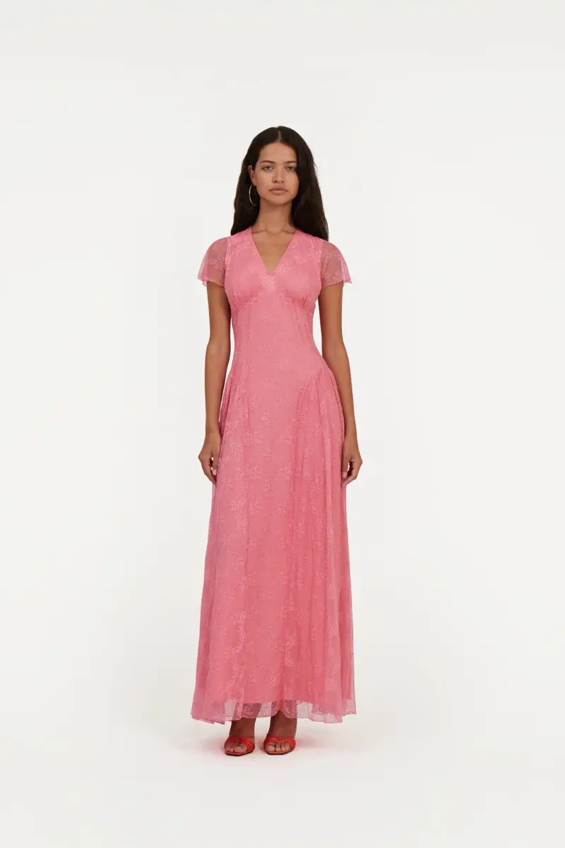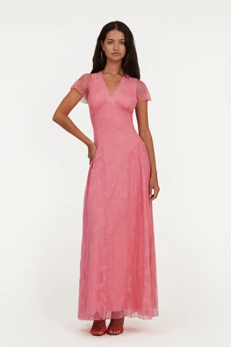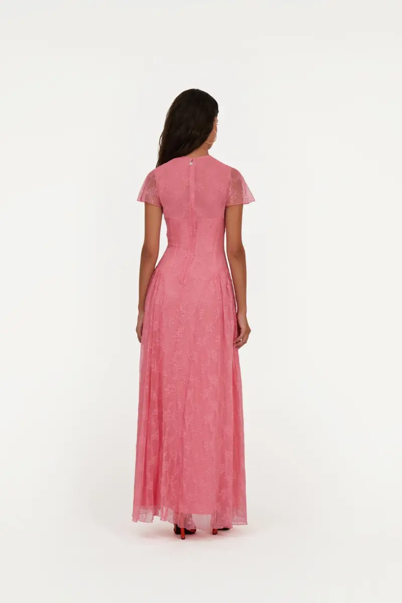 Lace Maxi Dress Pink features a V-neckline and short sleeves, crafted from delicate lace fabric. The flowing maxi-length design is complemented by a fitted bodice and a zip closure at the back, creating a timeless and elegant silhouette.