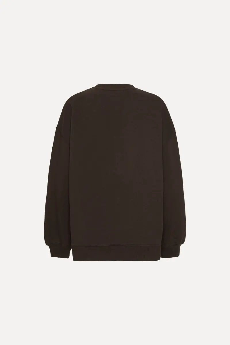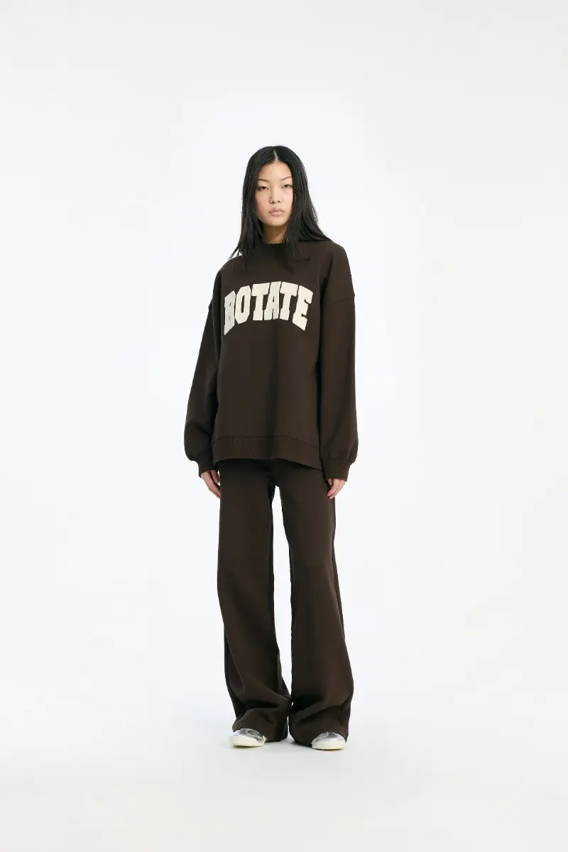 Heavy Sweat Crewneck Dark Brown is designed with a round neckline, long sleeves, and ribbed cuffs and hem. The silhouette is oversized with dropped shoulders and a straight hem. A large ROTATE logo is placed across the chest in a bold terry texture.