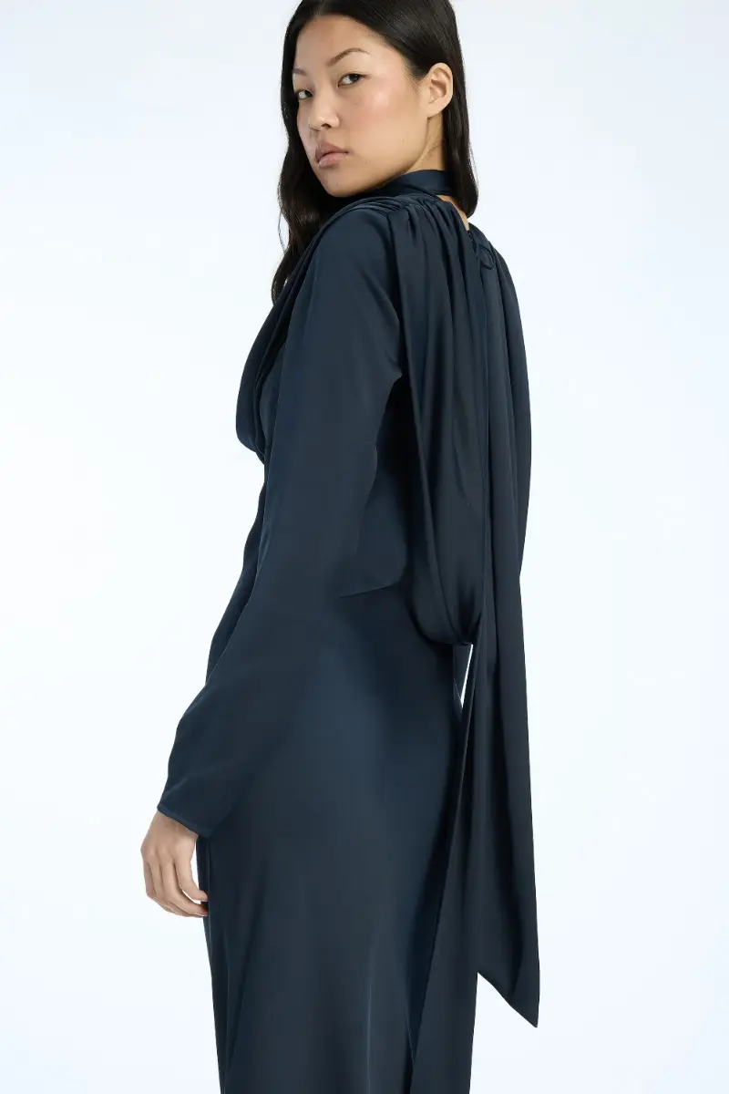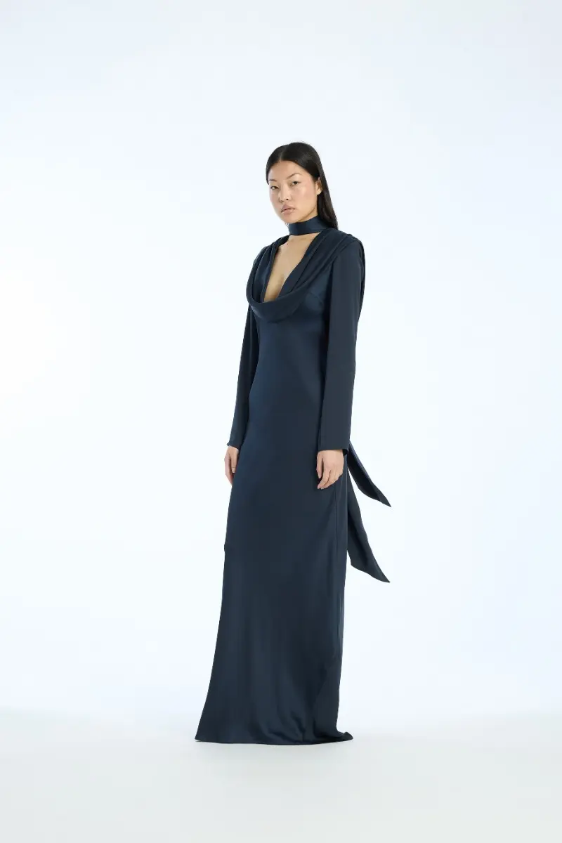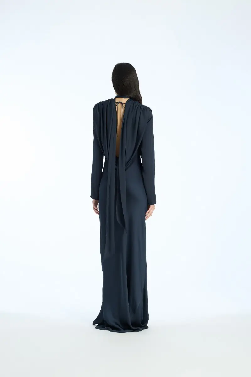 Satin Maxi Drapy Dress Dark Blue is a full-length dress with long sleeves and a flowing silhouette. It features a draped neckline that extends into a scarf-like detail at the front and back. The open back is secured with thin ties at the neck, creating an elegant design.