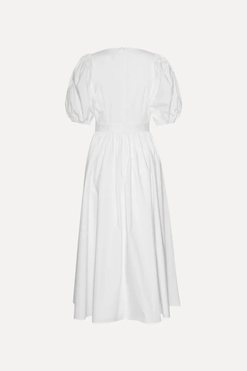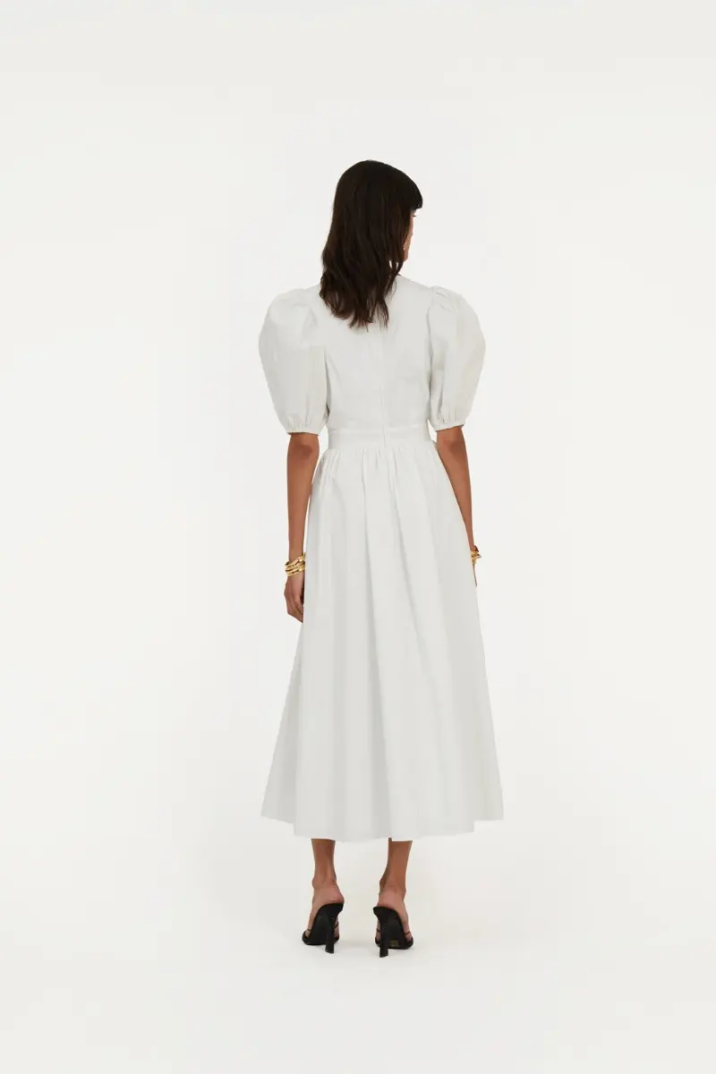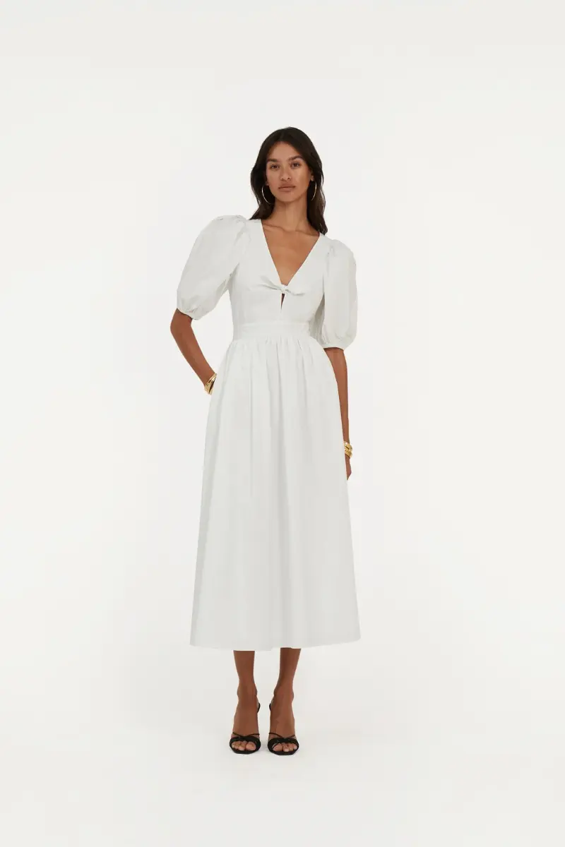 Puff Sleeve Midi Dress Bright White is designed with a graceful V-neckline and charming puffed short sleeves. The fitted waist enhances the silhouette, while a delicate tie detail at the bust adds a touch of elegance. The midi length and back zip closure complete this sophisticated style.