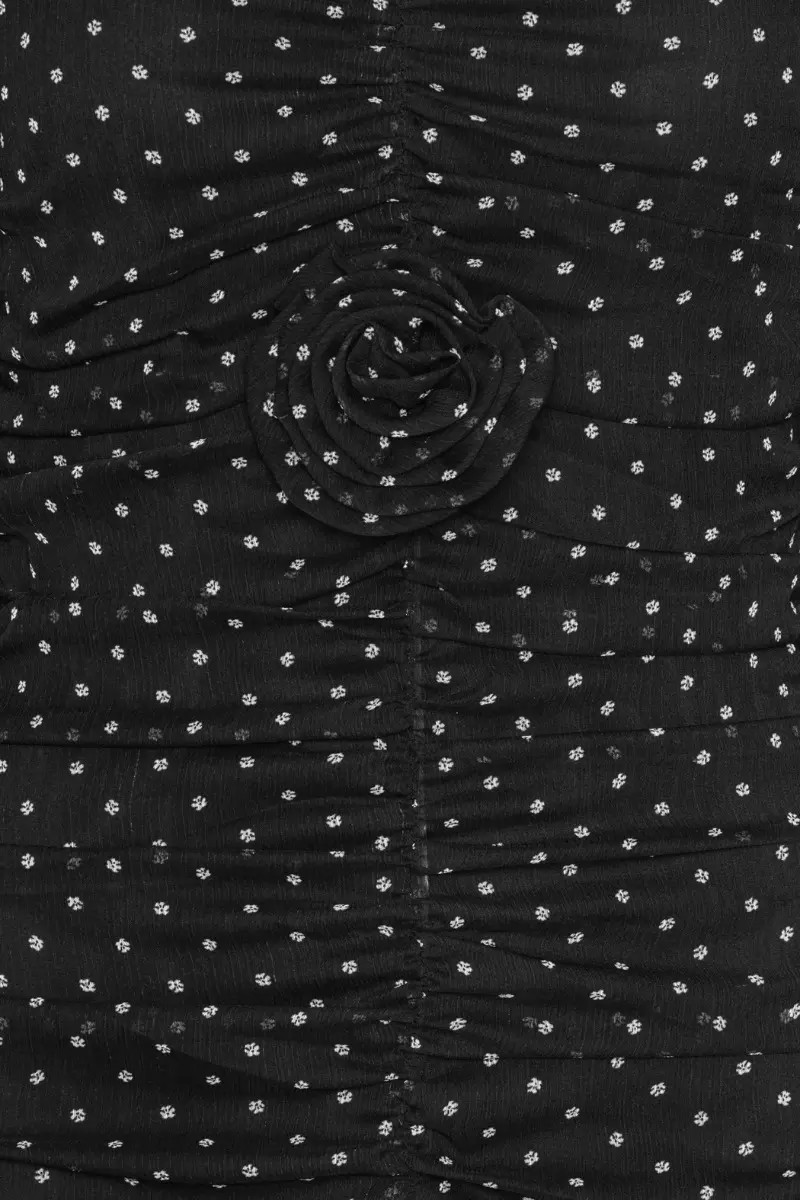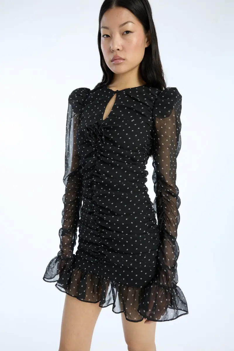 Printed Long-sleeve Dress Black is crafted in lightweight chiffon with a small dotted print. The dress features long sheer sleeves with ruched detailing and flared cuffs. The body is ruched at the front and back, creating a fitted silhouette, while a small keyhole opening at the neckline is finished with a delicate rose detail underneath. A ruffled hemline completes the look. The dress is lined