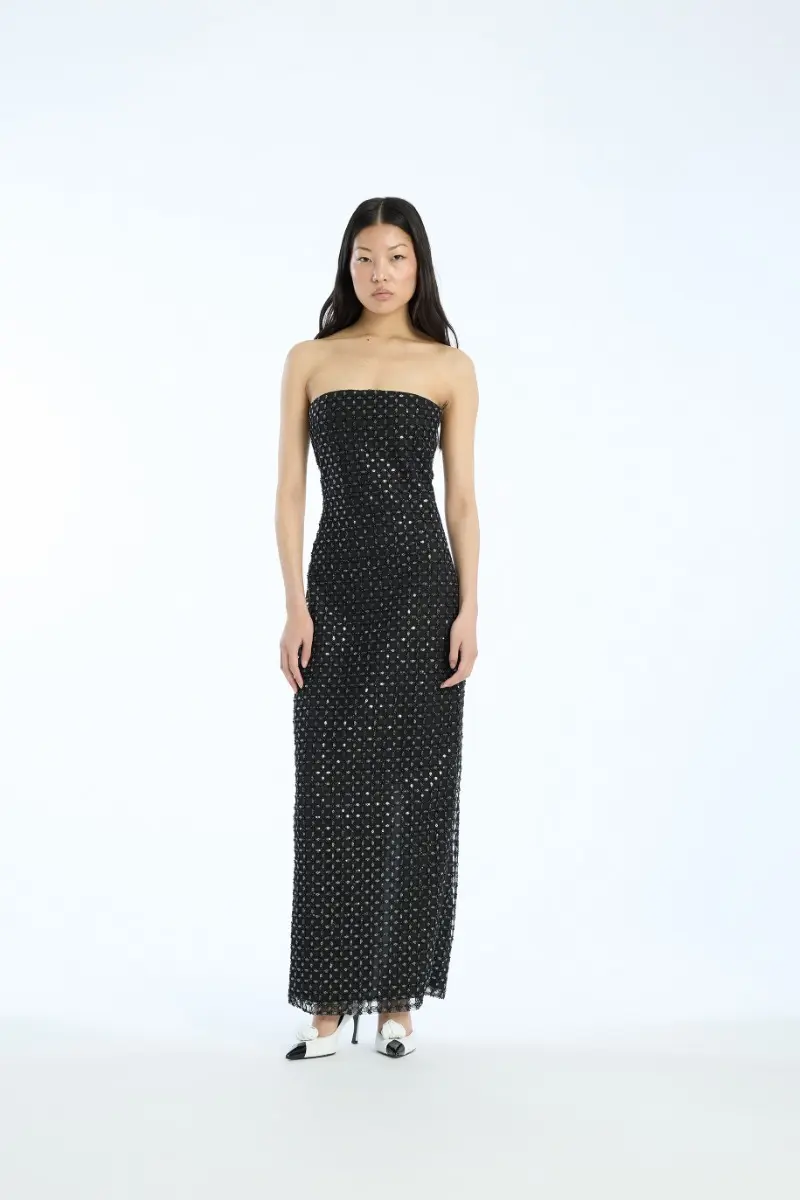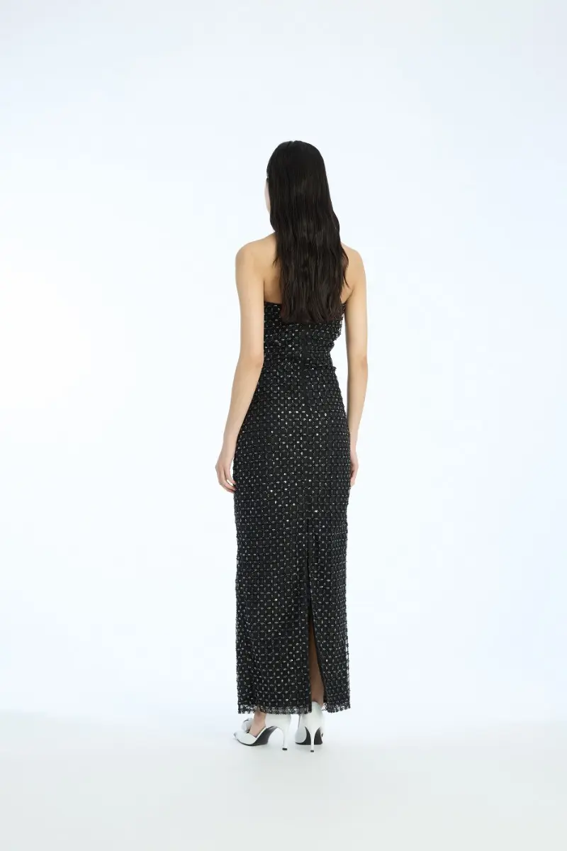 Beaded Maxi Tube Dress Black is a strapless ankle-length dress with a fitted silhouette. It features an all-over square-patterned sequin surface. The design includes a secure grip inside the top edge, a back slit for movement, and a zip closure at the back. The dress is lined.