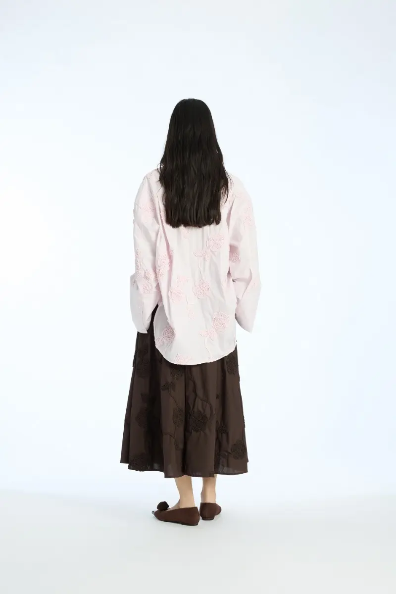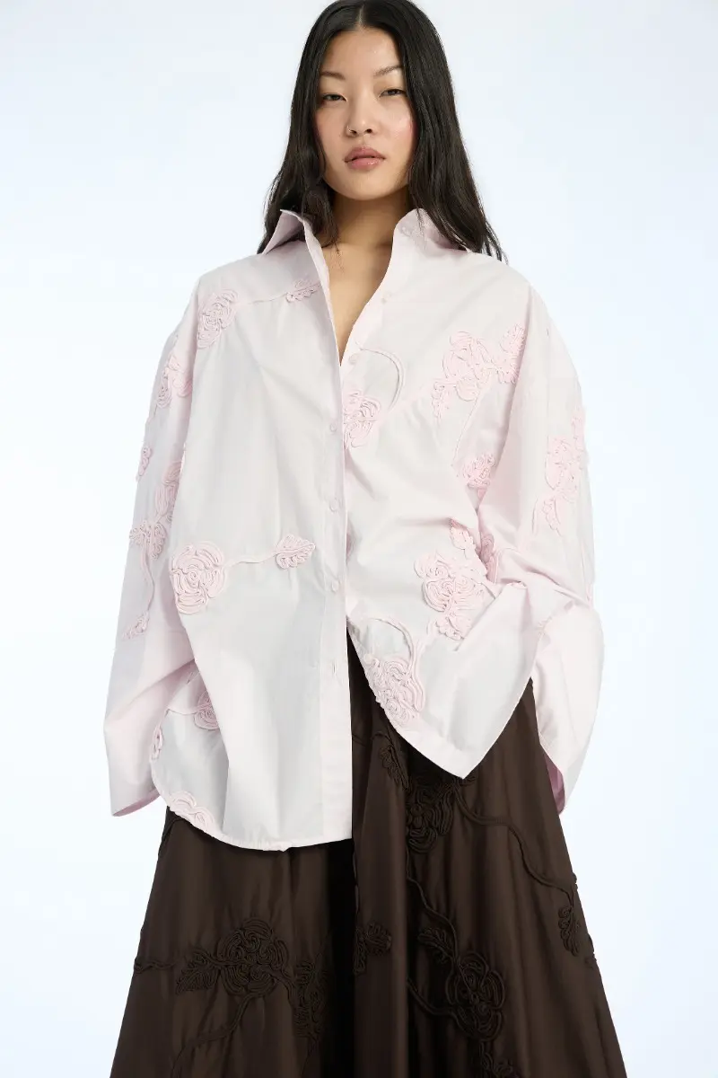 Flower Oversized Shirt Light Pink is designed with an Oversized silhouette and long, wide sleeves. The shirt features a classic collar, front button closure, and embroidered floral detailing across the fabric. Made from organic cotton with polyester embroidery. It can be matched with the Flower Maxi Skirt Light Pink for a coordinated look.