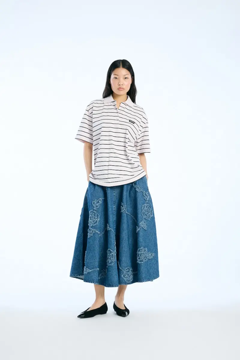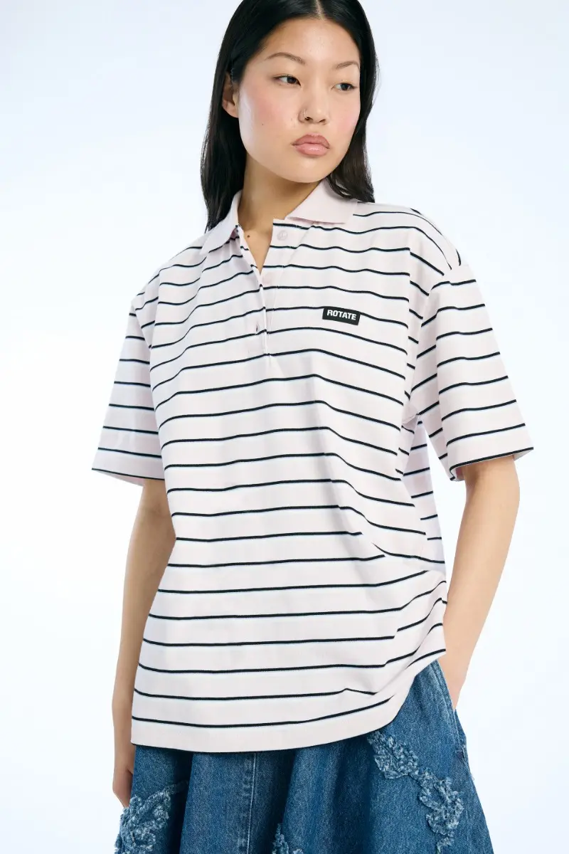 Jersey Polo Shirt Light Pink is designed with a classic polo collar, short sleeves, and a three-button placket. The shirt features a striped pattern and a small ROTATE logo patch placed on the chest.