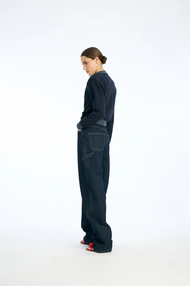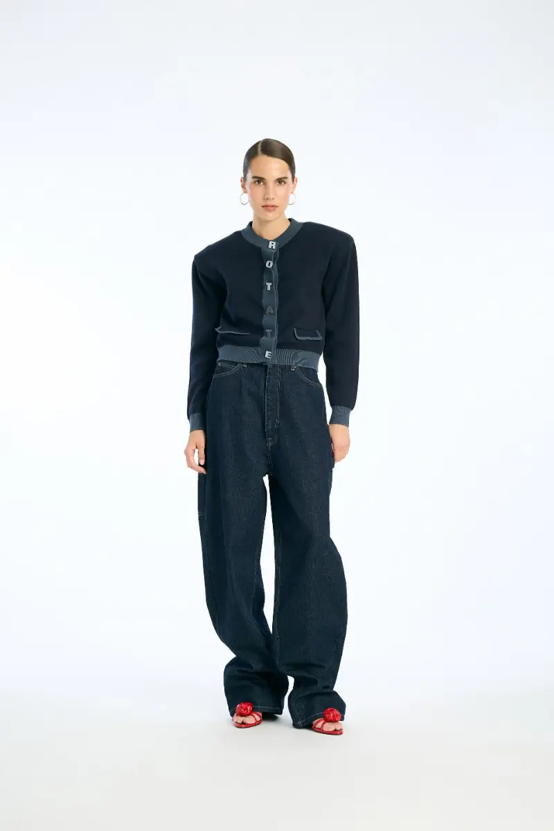 Firm Knit Cardigan is a cropped cardigan with detachable shoulder pads for a defined silhouette. It features ribbed edges at the collar, cuffs, and hem. The front is decorated with metallic letter buttons spelling out ROTATE and two decorative flap pockets.