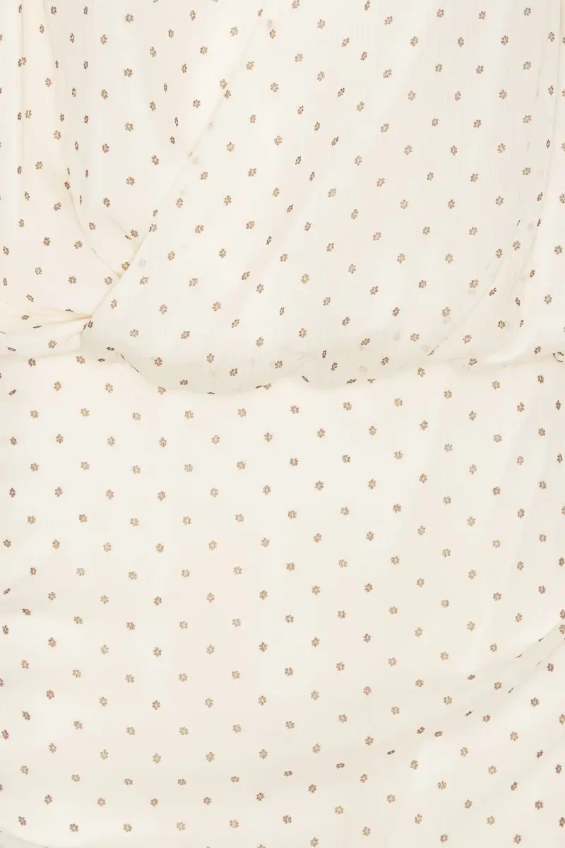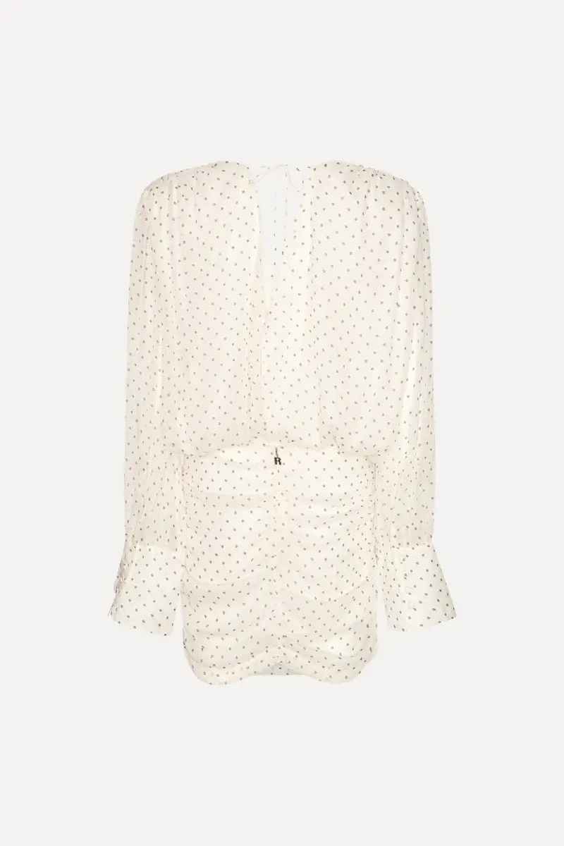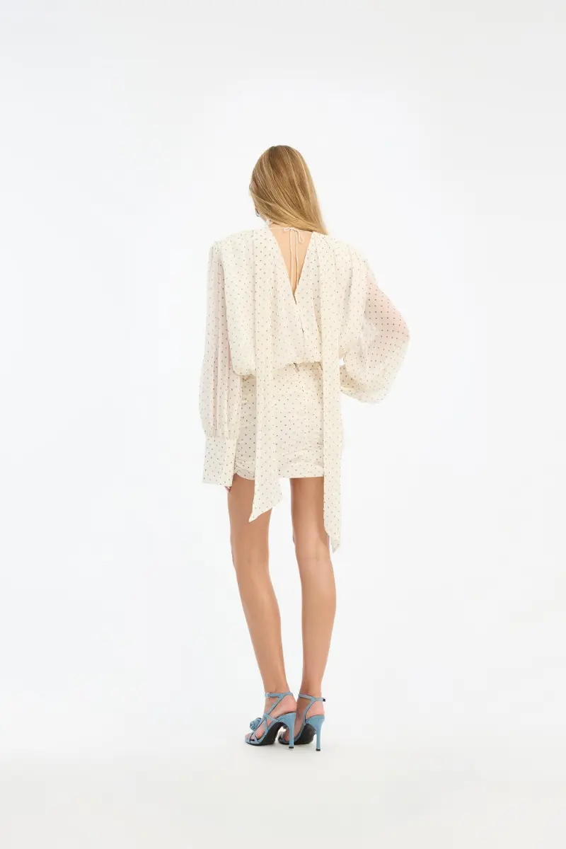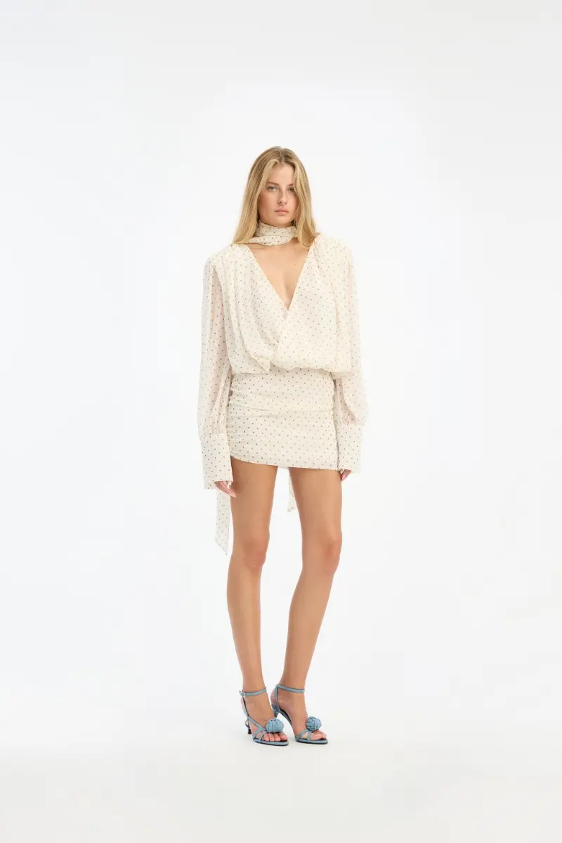 Chiffon Ls V-neck Dress Creme is a short dress made from lightweight chiffon with a subtle dotted pattern. It features long sleeves with slight volume and wide cuffs, along with a deep V-neckline at the front. The waist is defined with gathered detailing that creates a draped silhouette, and the skirt follows the shape of the body. The design includes an open back with tie detail at the neck. The dress is crafted in chiffon and is lined.