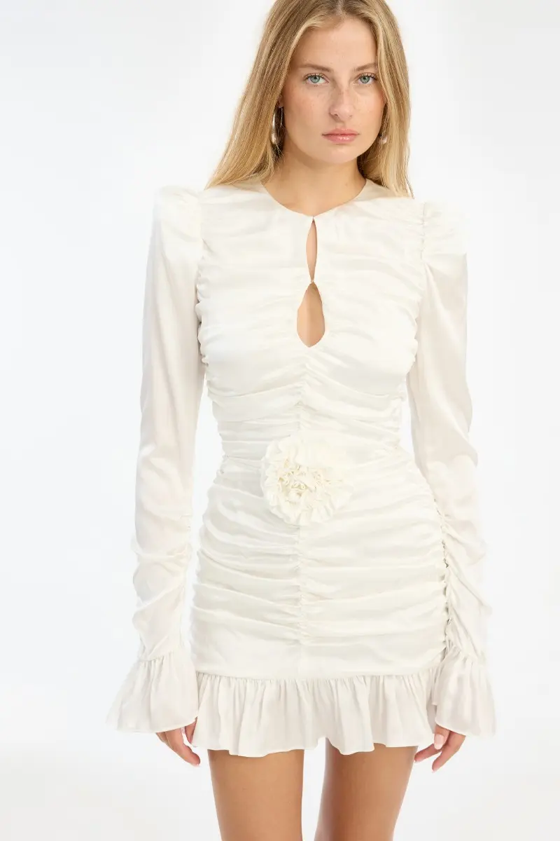 Mini Dress White is a fitted mini dress with long sleeves and a round neckline. The dress features an all-over ruched design along the front and back, creating a sculpted silhouette. A small teardrop-shaped cut-out is placed at the chest, and a decorative fabric flower detail accents the waist. The hem is finished with a soft ruffle, and the sleeves have a subtle flared cuff.