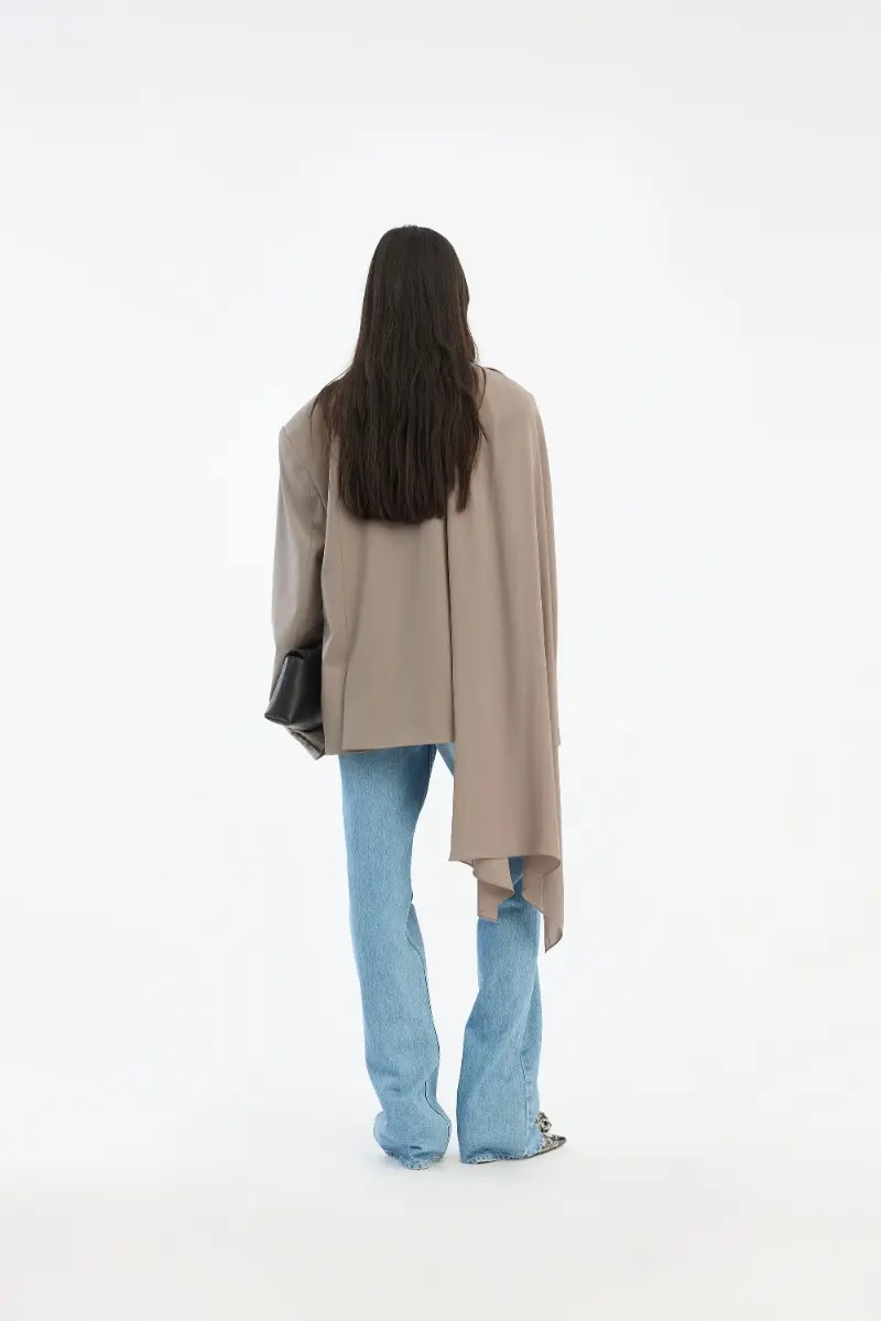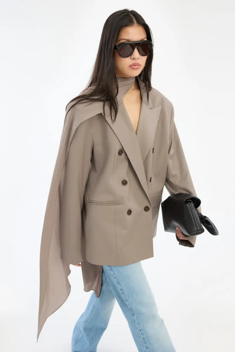 Oversized Scarf Blazer Grey is a blazer with a relaxed, oversized silhouette and classic lapels. The design is double-breasted with a button closure at the front and features welt pockets. An integrated scarf-like detail is attached at the shoulder and drapes fluidly down the side and back, creating a distinctive layered look. Crafted in a woven wool-blend fabric, the blazer is lined.
