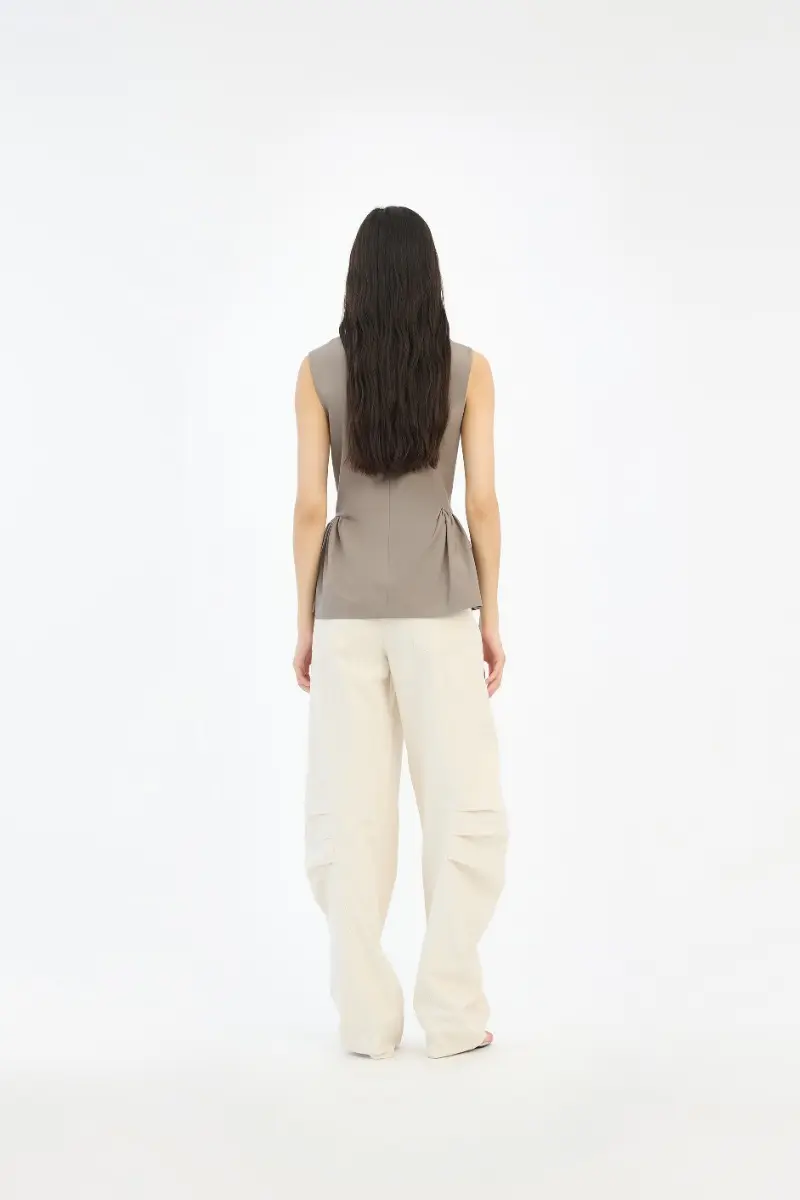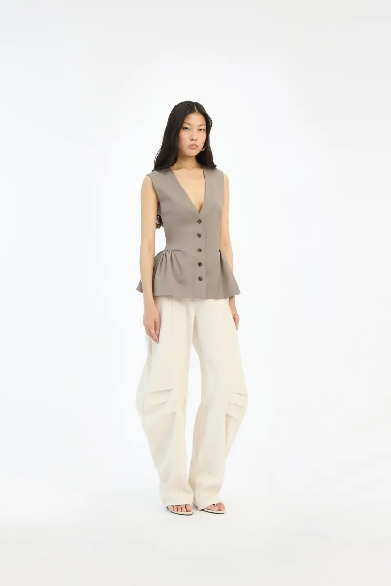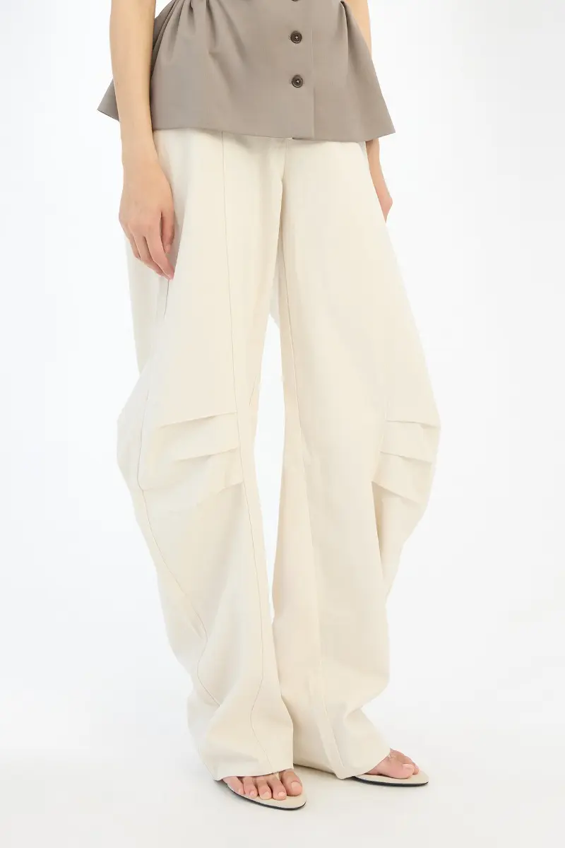 Linen Suiting Pants Cream are light-colored trousers with a straight waistband and belt loops. The trousers feature straight legs with visible pleats at the knees, adding shape to the silhouette. They have visible front pockets and patch pockets at the back. The fabric has a lightly textured surface indicating a linen blend. The trousers are lined.