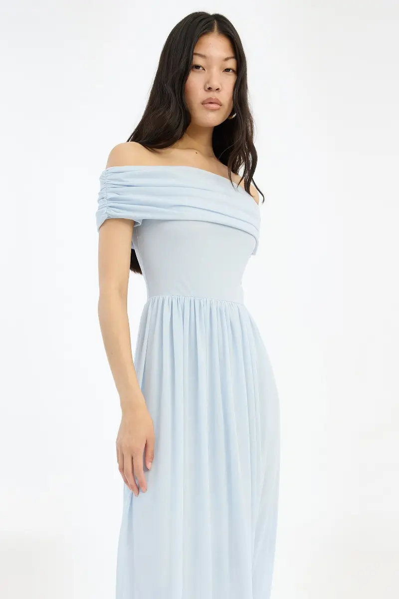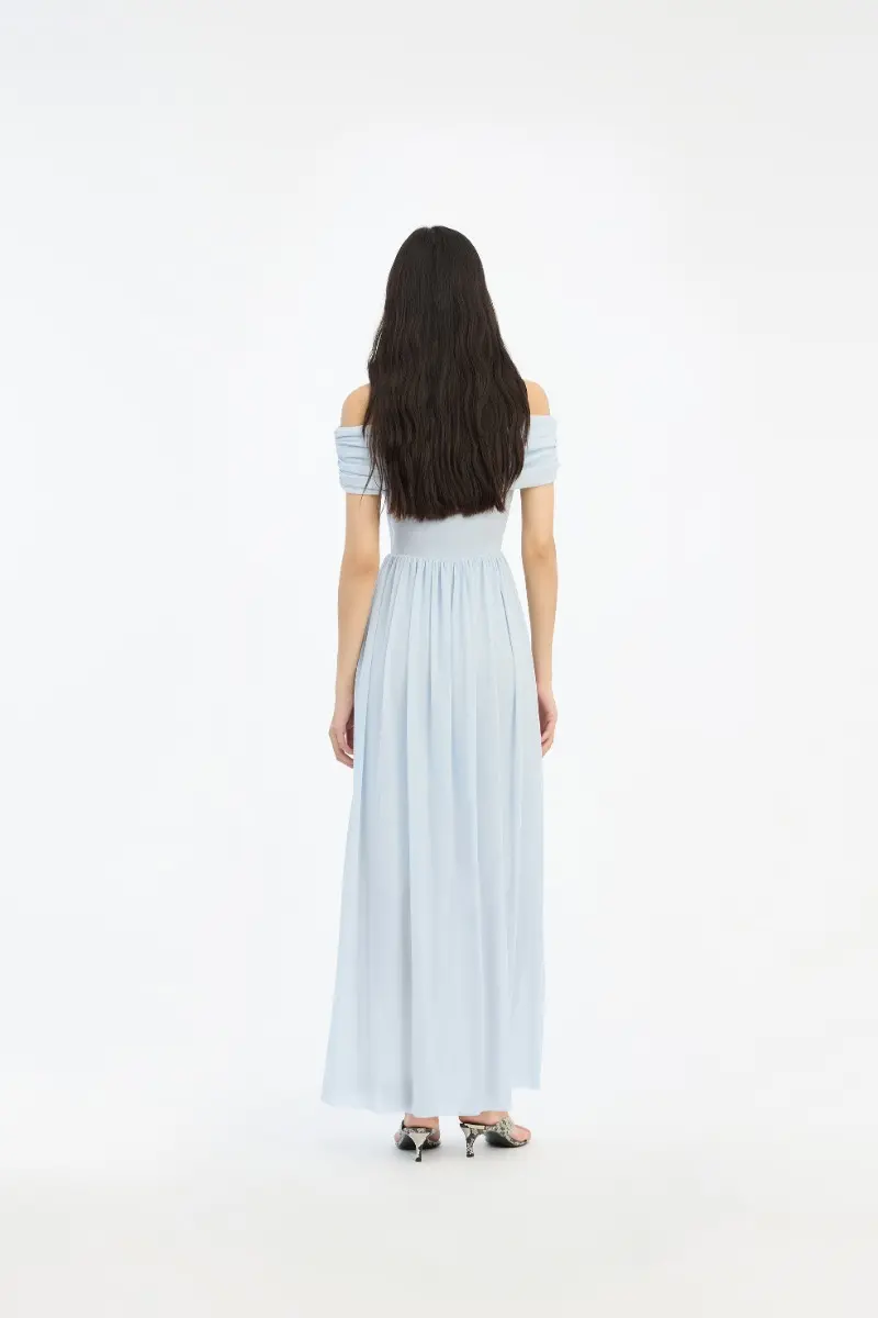 Off-shoulder Maxi Dress Light Blue is an elegant maxi dress with an off-shoulder neckline and a straight, fitted bodice. The dress features a wide folded band across the neckline and a softly draped, flowing skirt that falls to the floor. Subtle gathering at the waist adds gentle volume to the skirt, creating a fluid silhouette.