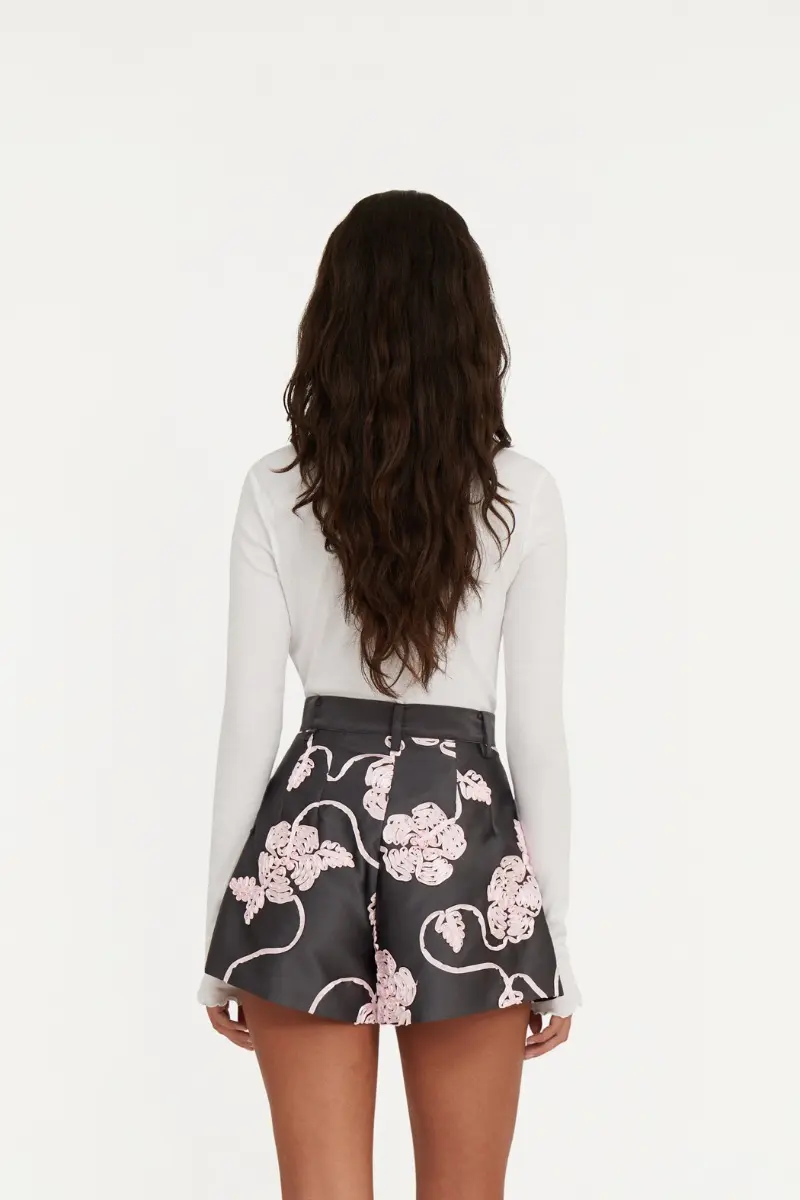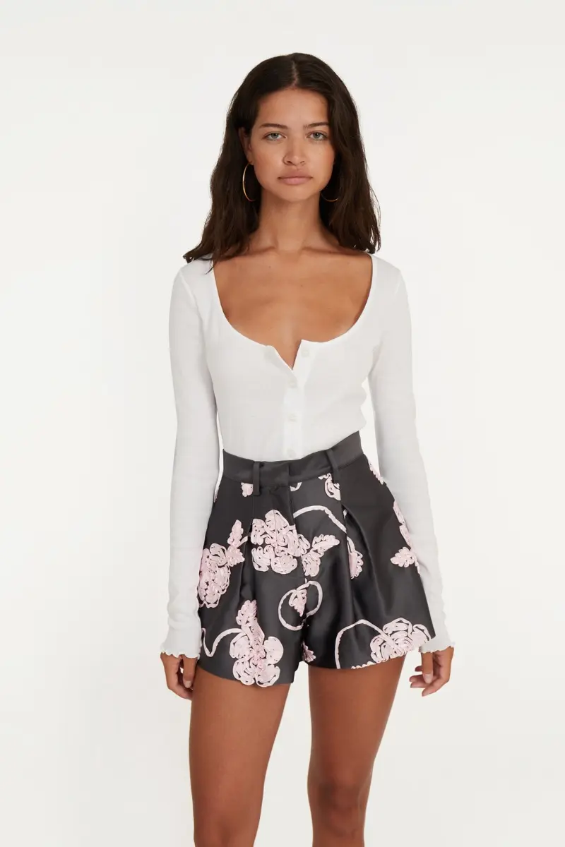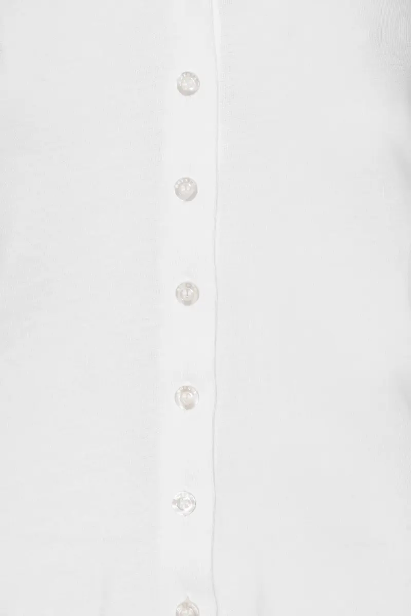 Buttoned Ls Top Bright White features long sleeves with mini ruffle detailing at the cuffs and hem. The design is completed with buttons down the front and an embroidered ROTATE logo at the back, adding a subtle finishing touch.