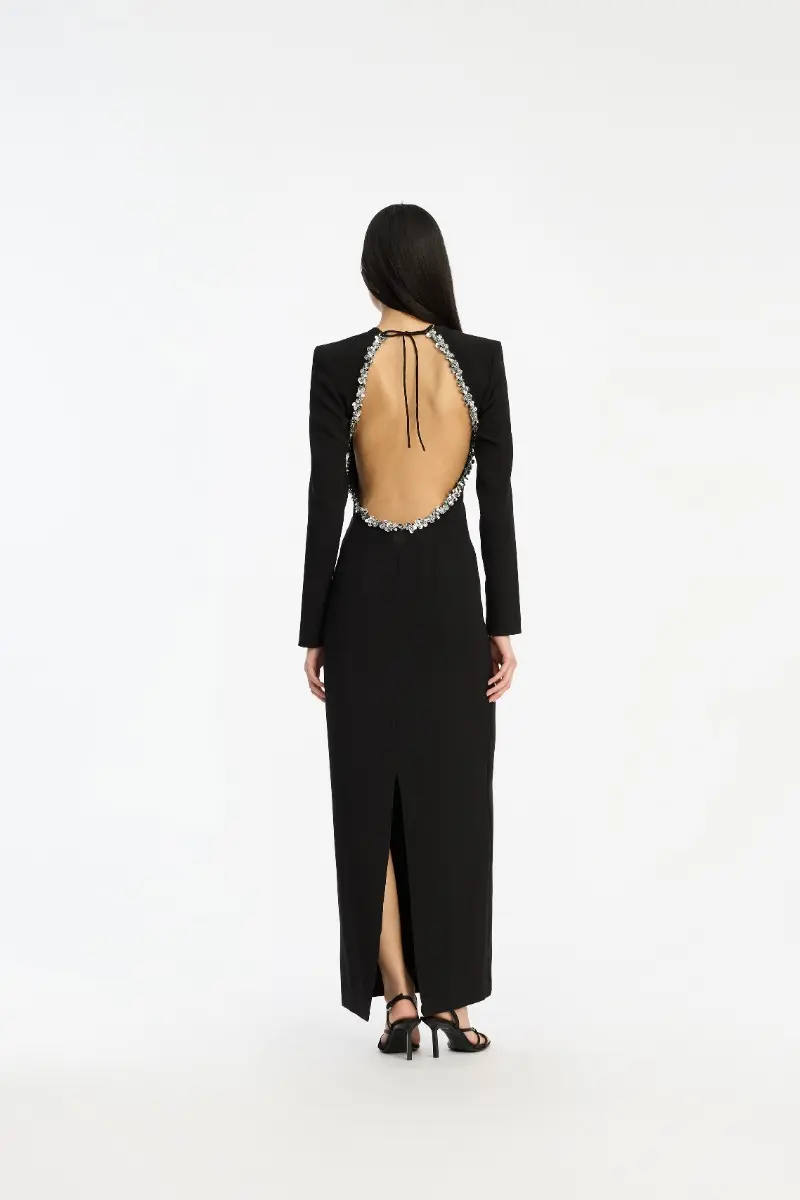 Crepe Open Back Dress Black is a long-sleeved maxi dress with a fitted silhouette and wide, structured shoulders. It features an open back framed by crystal embellishments and a slim string tie at the neck. Designed with a high slit at the back hem. The dress has lining.