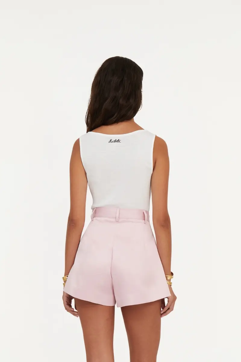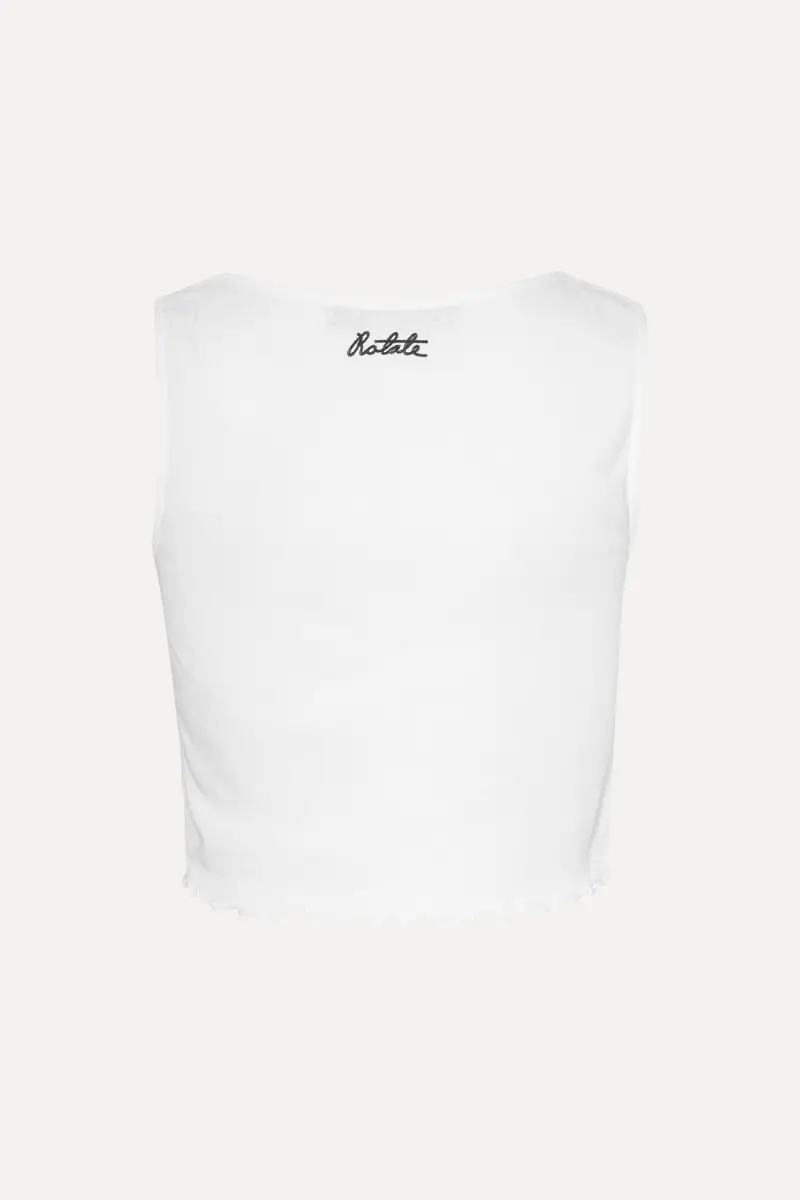 Buttoned Tank Top Bright White is a cropped design featuring buttons down the front and a delicate mini ruffle trim along the bottom edge. The back is detailed with an embroidered ROTATE logo, adding a subtle signature touch