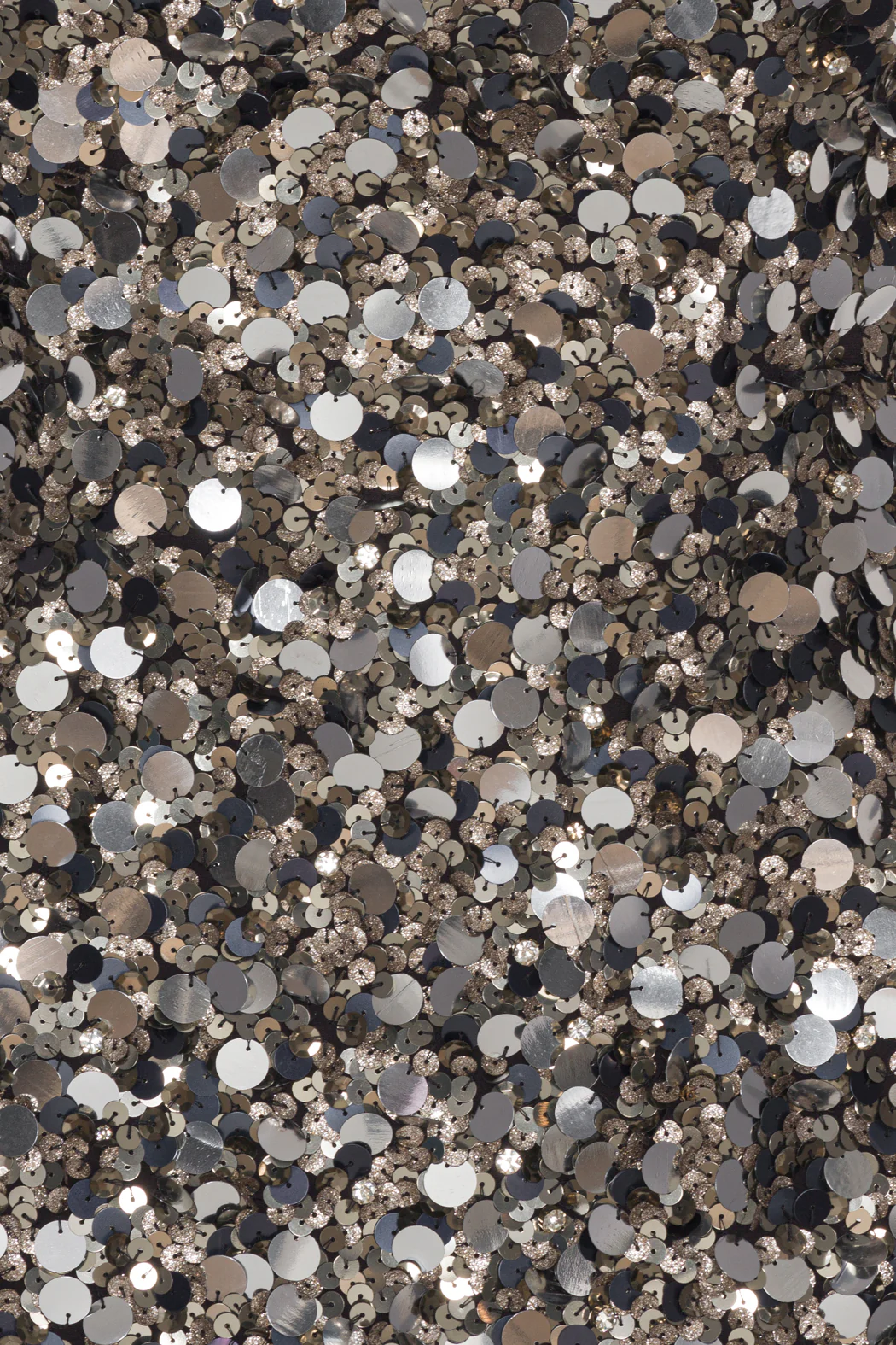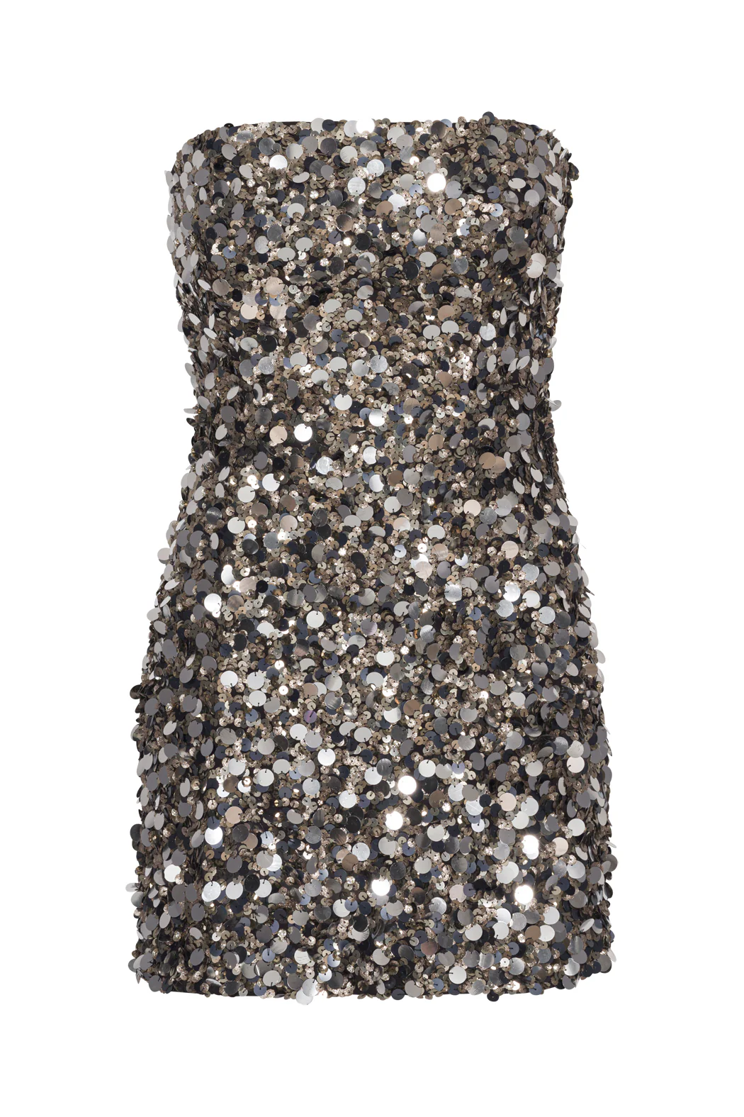 Crafted from recycled materials, this mini dress features a stretch design and an all-over silver-tone sequin embellishment. It has a strapless silhouette, a rear zip fastening, and a thigh-length straight hem. Material: 95% polyester, 5% elastane Lining:95% polyester, 5% elastane