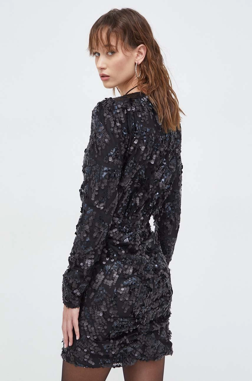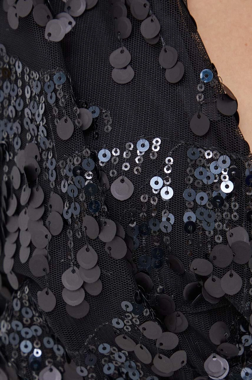 Rotate mini dress crafted in recycled polyester mesh, with draped design embellished with tonal sequins all over. It features V neckline, padded shoulders, empire waistline and back invisible zipper-and-hook closure. Lined interior. Waisted silhouette.