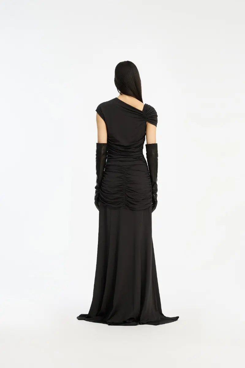 Maxi Asymmetric Dress Black features an asymmetric neckline with one gathered shoulder and a fitted ruched bodice. The skirt flows into a full-length silhouette with soft draping and a bubble-like hem. The back is detailed with gathered ruching across the lower section, adding definition and shape. The dress has lining.