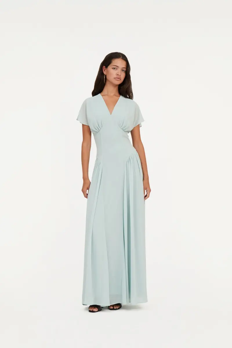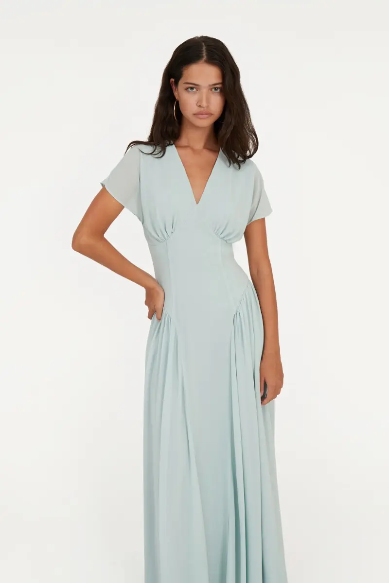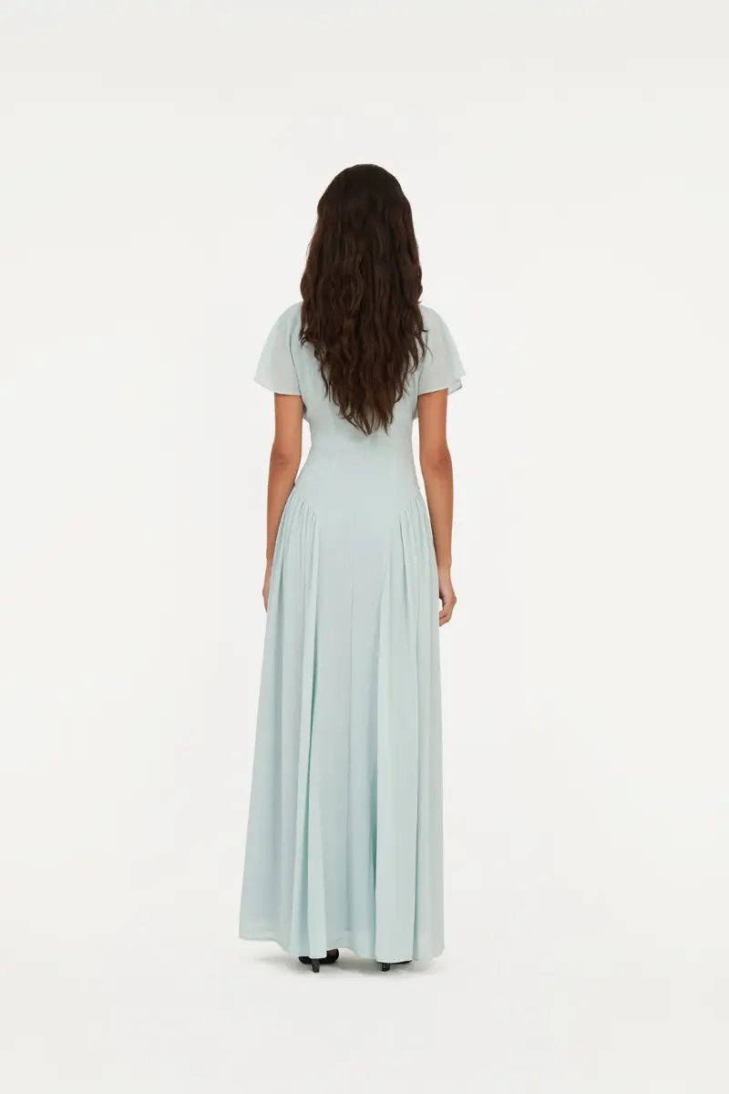 Maxi V-neck Dress Blue features a maxi length with short sleeves and a V-neckline. The design includes a fitted waist and a back zip closure, offering a sleek and elegant silhouette.
