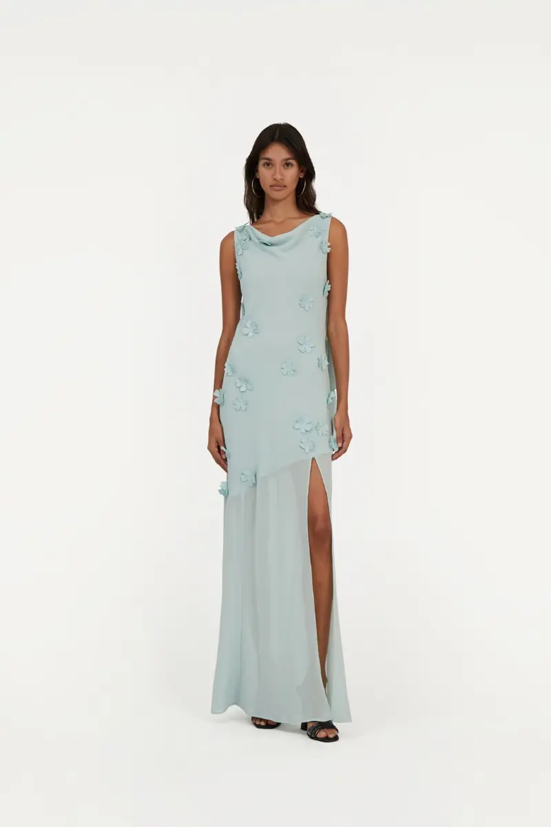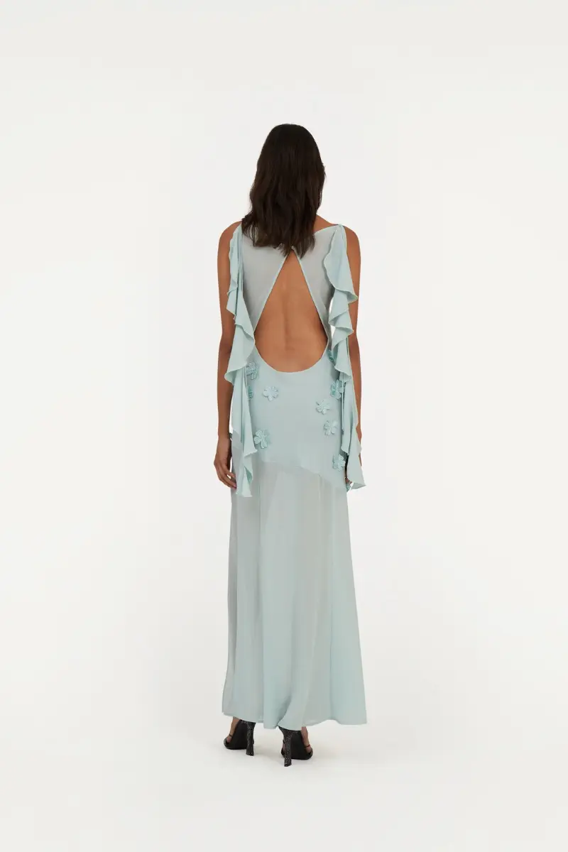Maxi V-neck Dress Blue features a maxi length with short sleeves and a V-neckline. The design includes a fitted waist and a back zip closure, offering a sleek and elegant silhouette.
