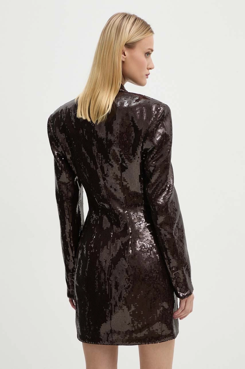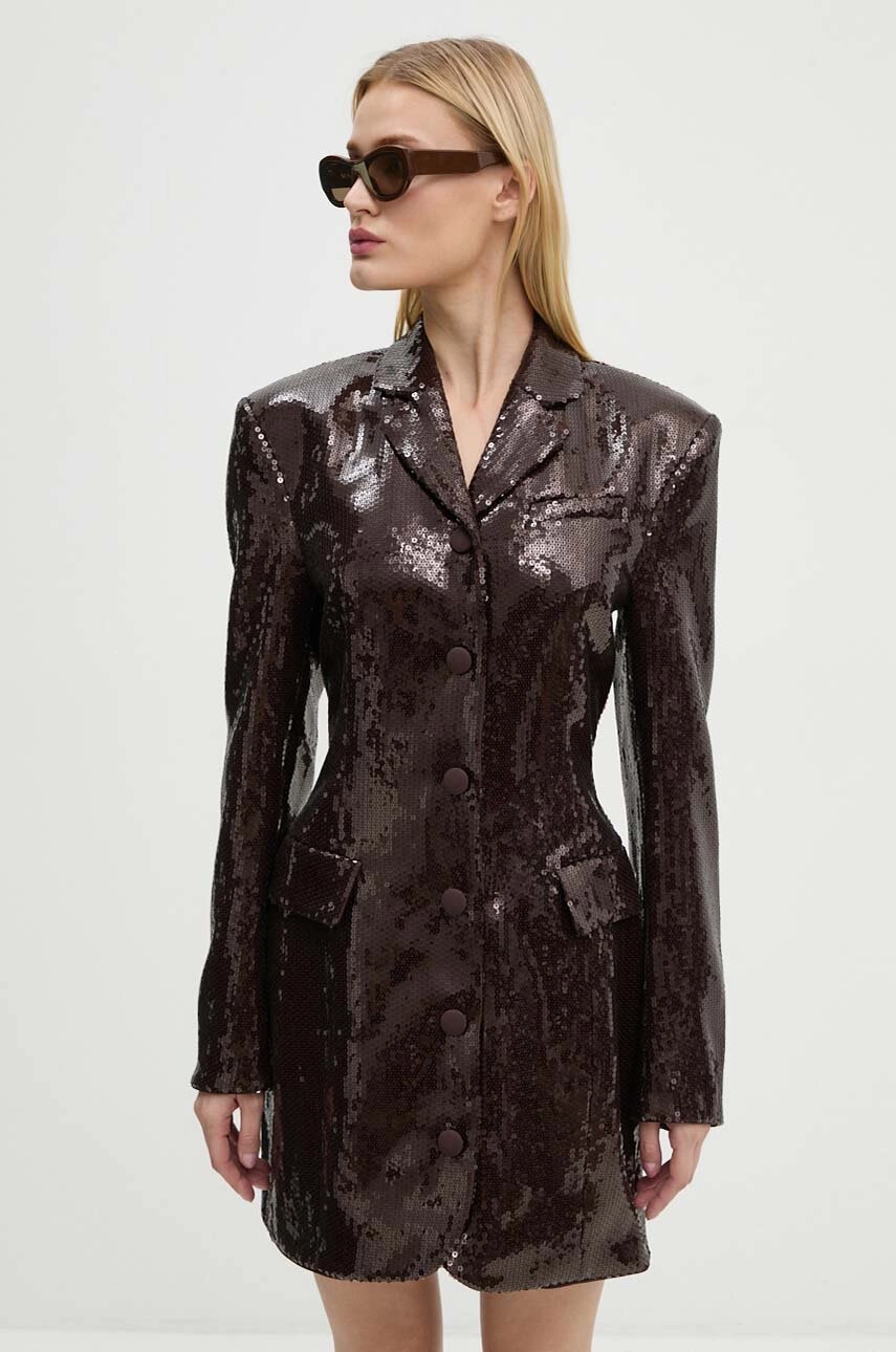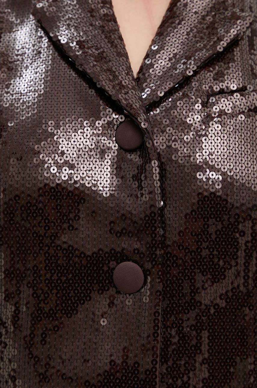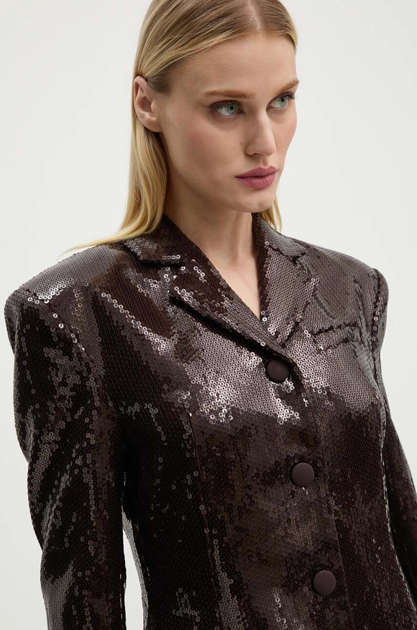 COMMAND ATTENTION IN OUR SEQUINNED BLAZER DRESS, A SEAMLESS BLEND OF CLASSIC TAILORING AND EVENING SPARKLE. THIS FITTED, SINGLE-BREASTED PIECE IS ARRAYED IN DARK BROWN SEQUINS, BOASTING FRONT POCKETS WITH FLAPS AND A SUBTLE PASPEL CHEST POCKET FOR ADDED SOPHISTICATION. PRESS BUTTON CLOSURE AND STRUCTURED, NON-DETACHABLE SHOULDER PADS CREATE A DEFINED SILHOUETTE. FULLY LINED FOR COMFORT, IT'S A STRIKING CHOICE FOR EMPOWERED EVENINGS.