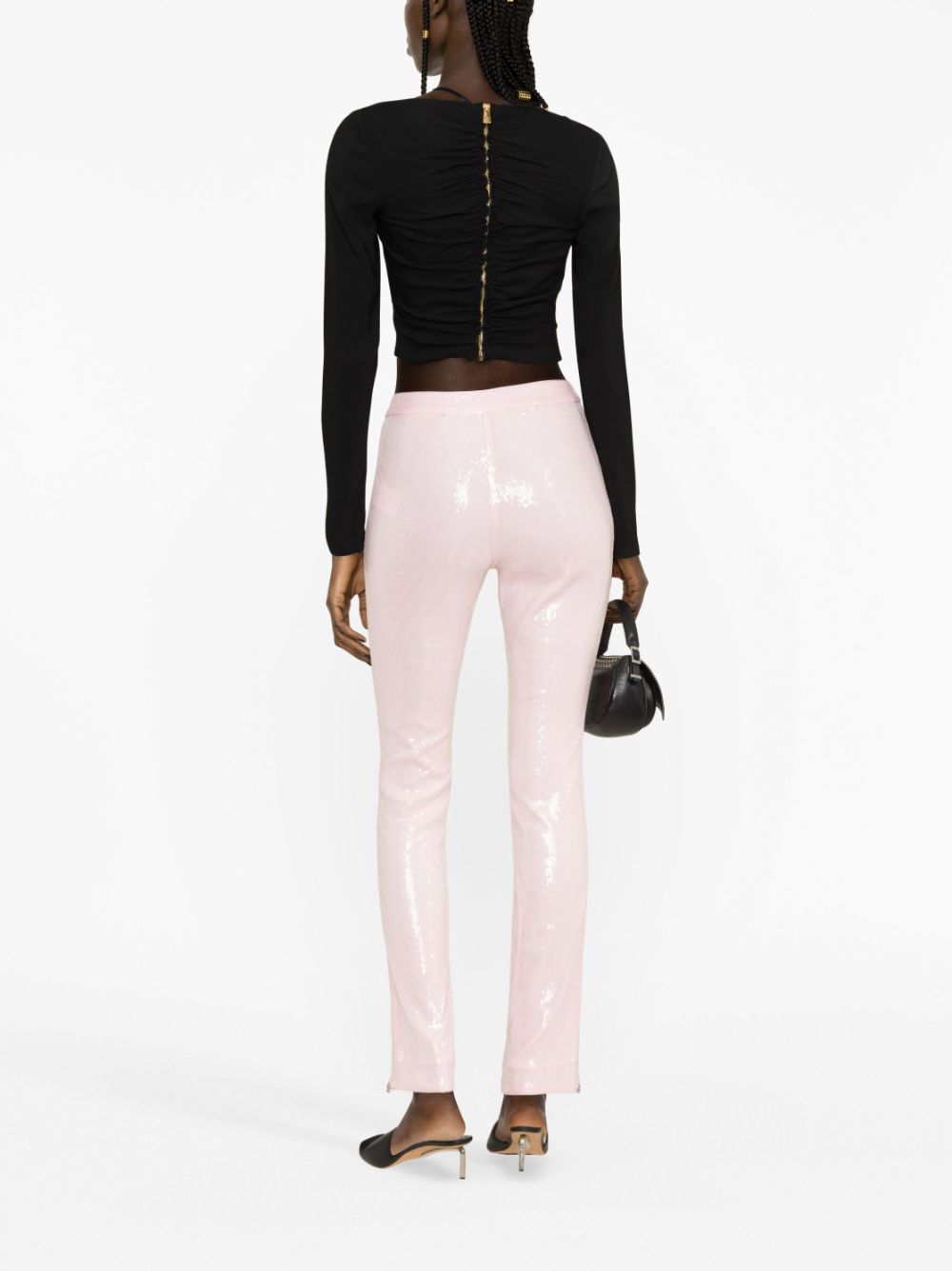 It showcases a playful and vibrant look with these trousers. The light-pink pair plays host to all-over sequin embellishments which lend a shimmering aesthetic.