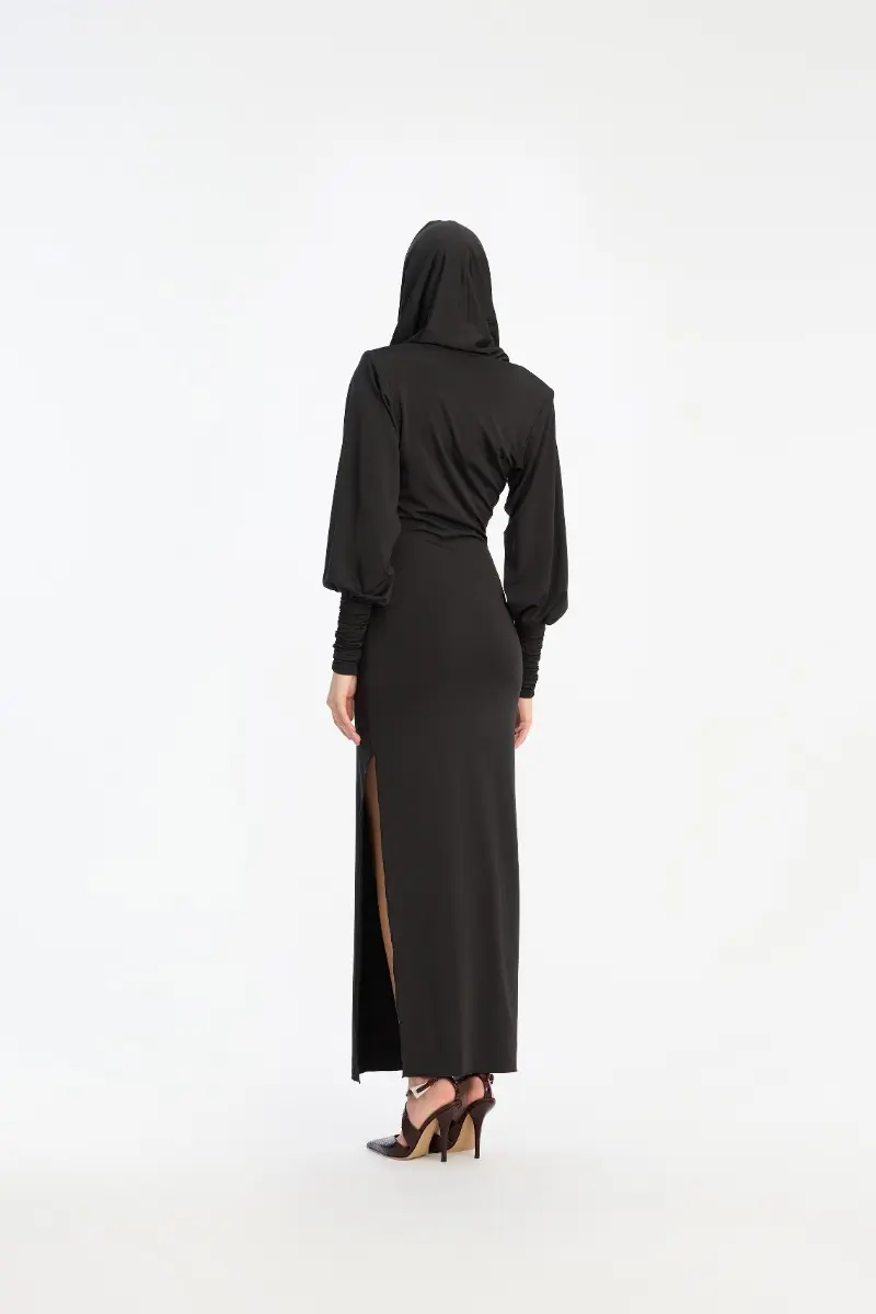 Slinky Hooded Dress Black is designed with a draped hood, a deep front neckline, and broad, structured shoulders. The long sleeves are voluminous and finished with gathered cuffs. The silhouette is fitted through the body and features a high side slit for added movement.