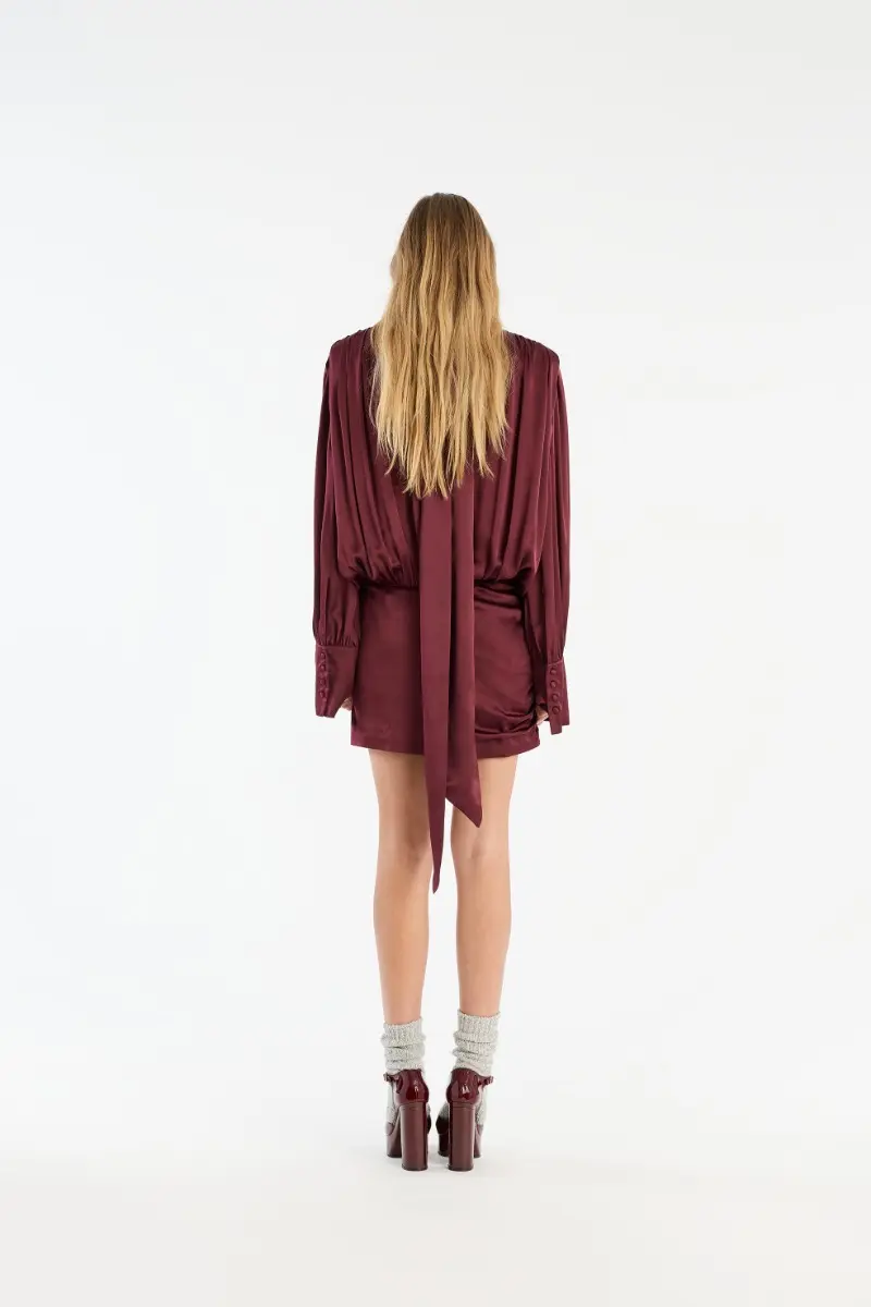 LS Silk V-neck Dress Burgundy features a deep V-neckline at both front and back. The bodice is softly draped with pleated shoulders and an attached scarf detail. Designed with long sleeves, a defined waist and a ruched mini skirt with an asymmetrical hemline. Hidden zip closure at the back.