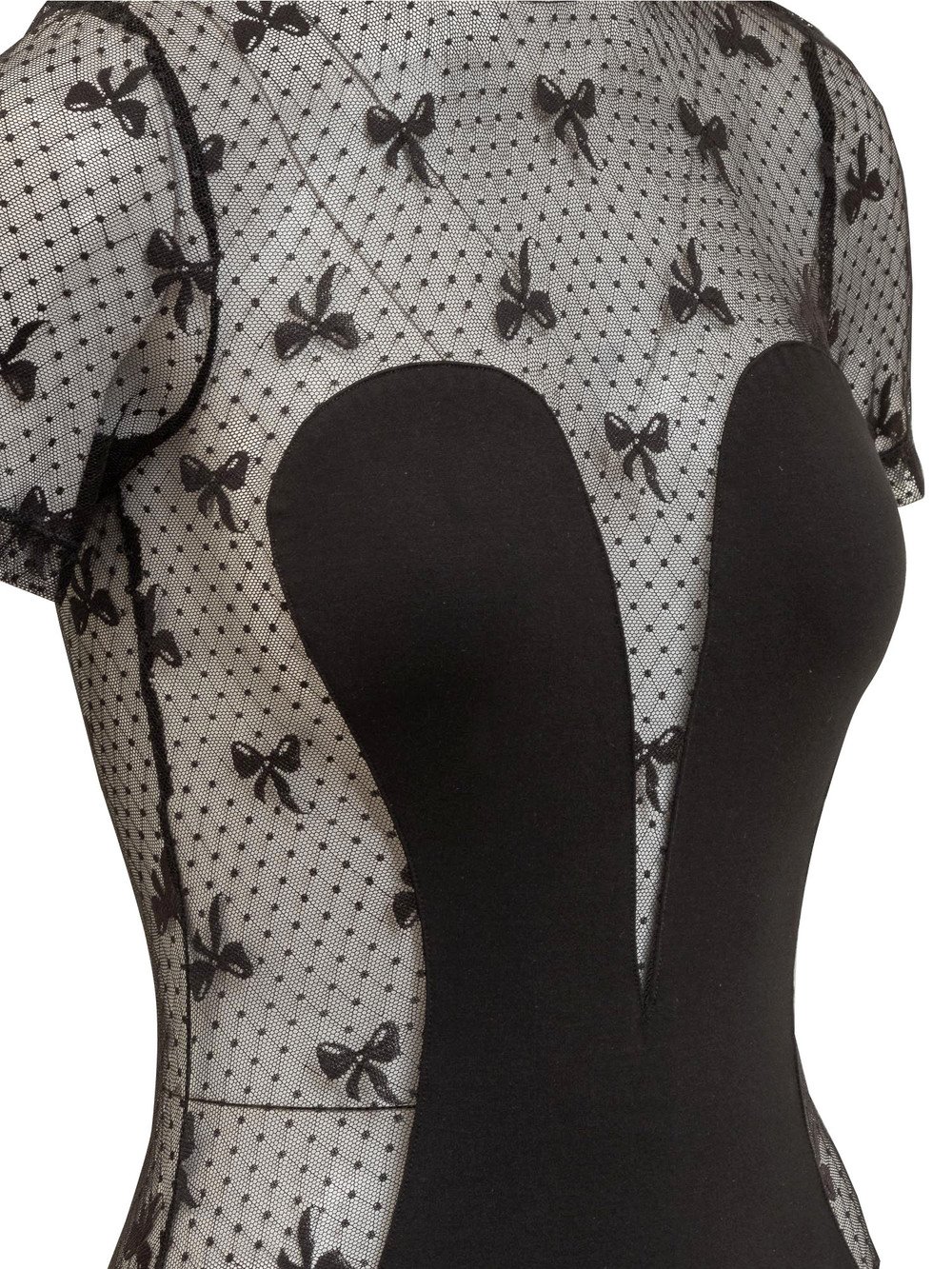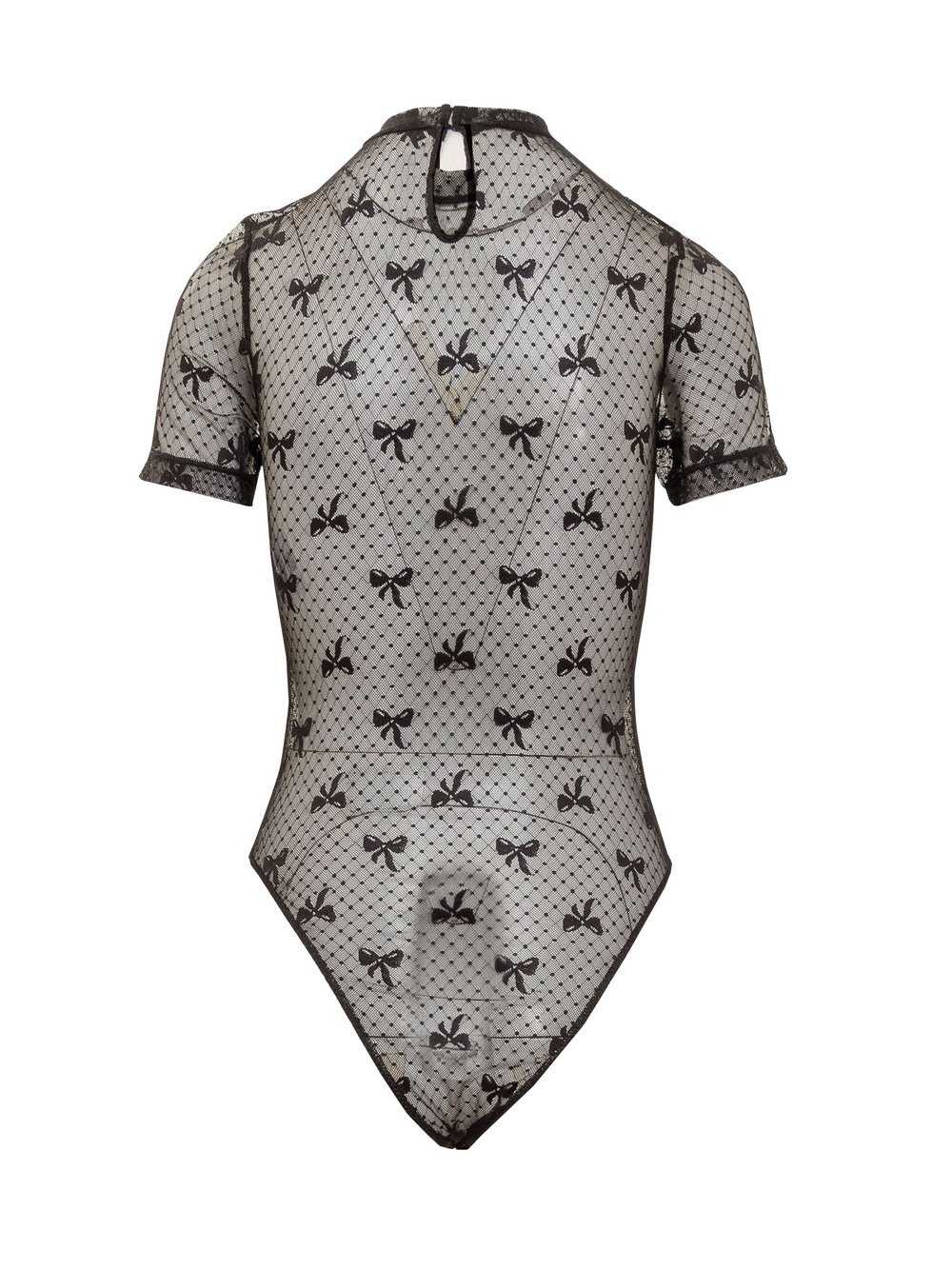 Short sleeve bodysuit. Crew neck. Button fastening at bottom and back. Coverage at front. Sheer effect with all-over Bow motif. 65% viscose 30% polyamide 5% elastane