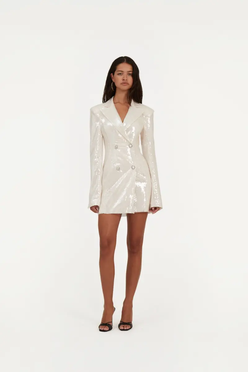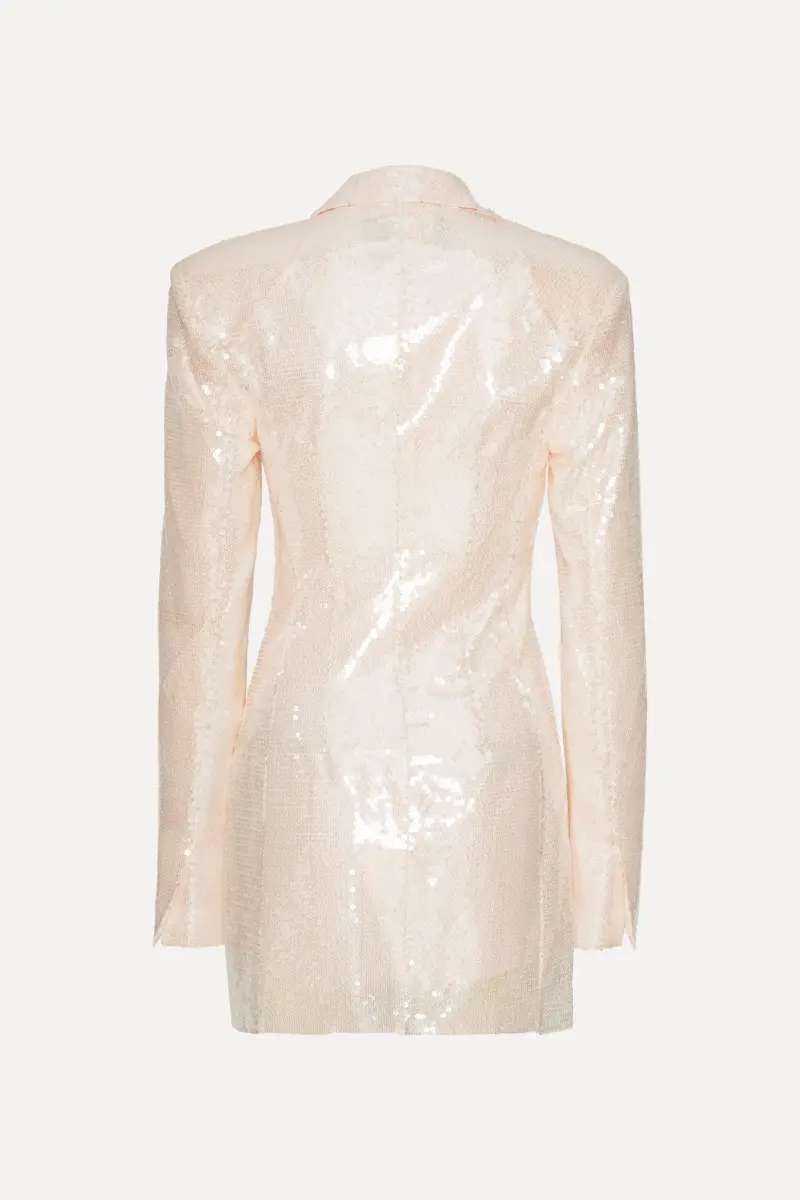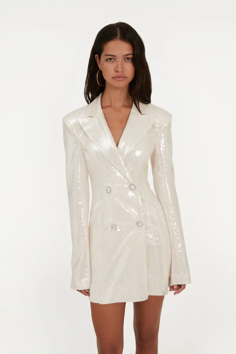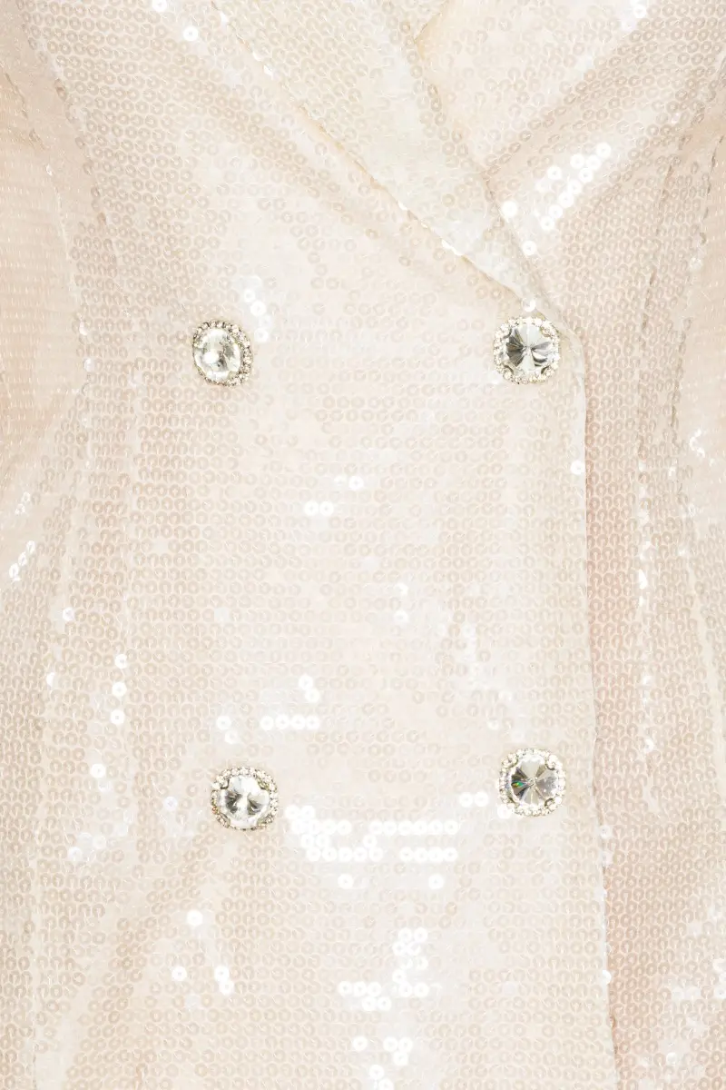 Sequins Blazer Dress Beige features a striking design with broad shoulders and four silver buttons at the front. The shimmering sequins add an elegant touch to this tailored blazer-inspired silhouette.