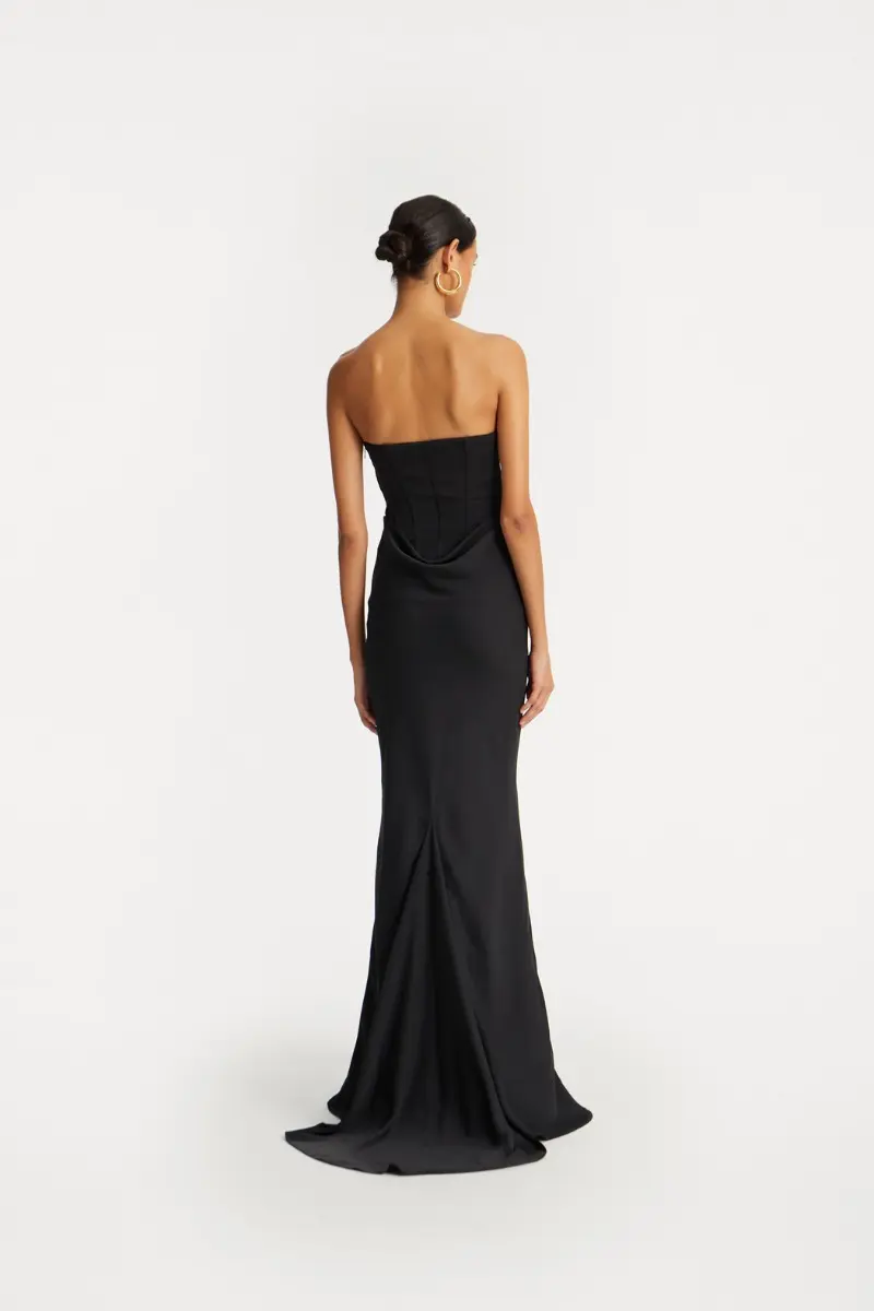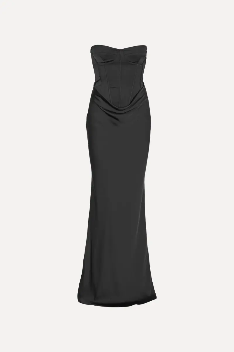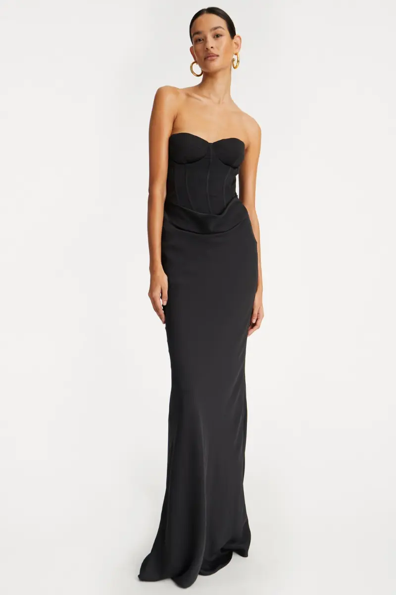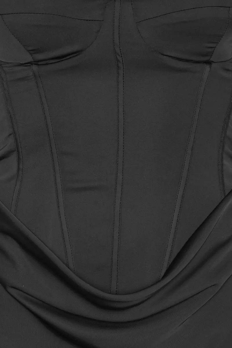 Satin Corset Maxi Dress Black features a floor-length silhouette with a fitted bodice and fluid skirt. Design details include an open back with a concealed zipper and a clean-finished hemline.