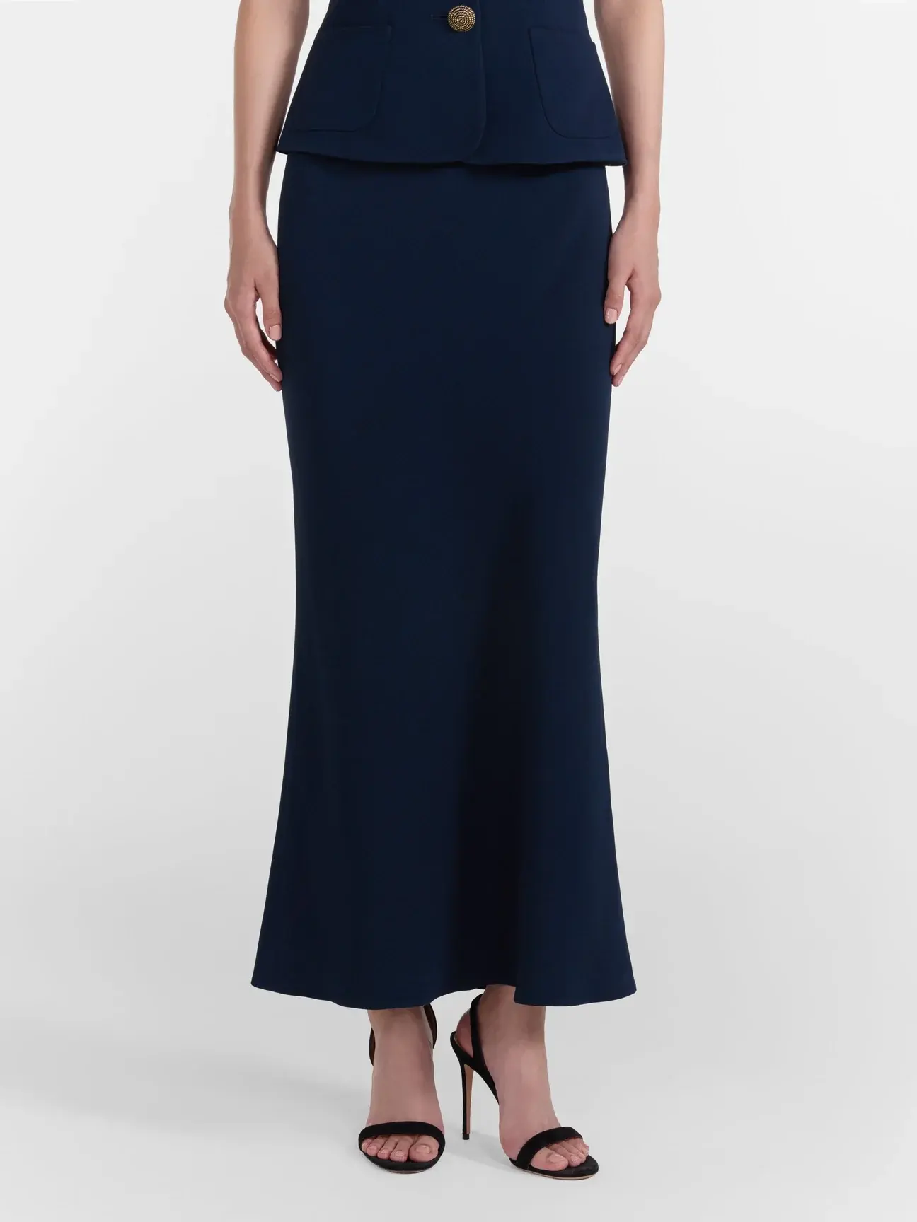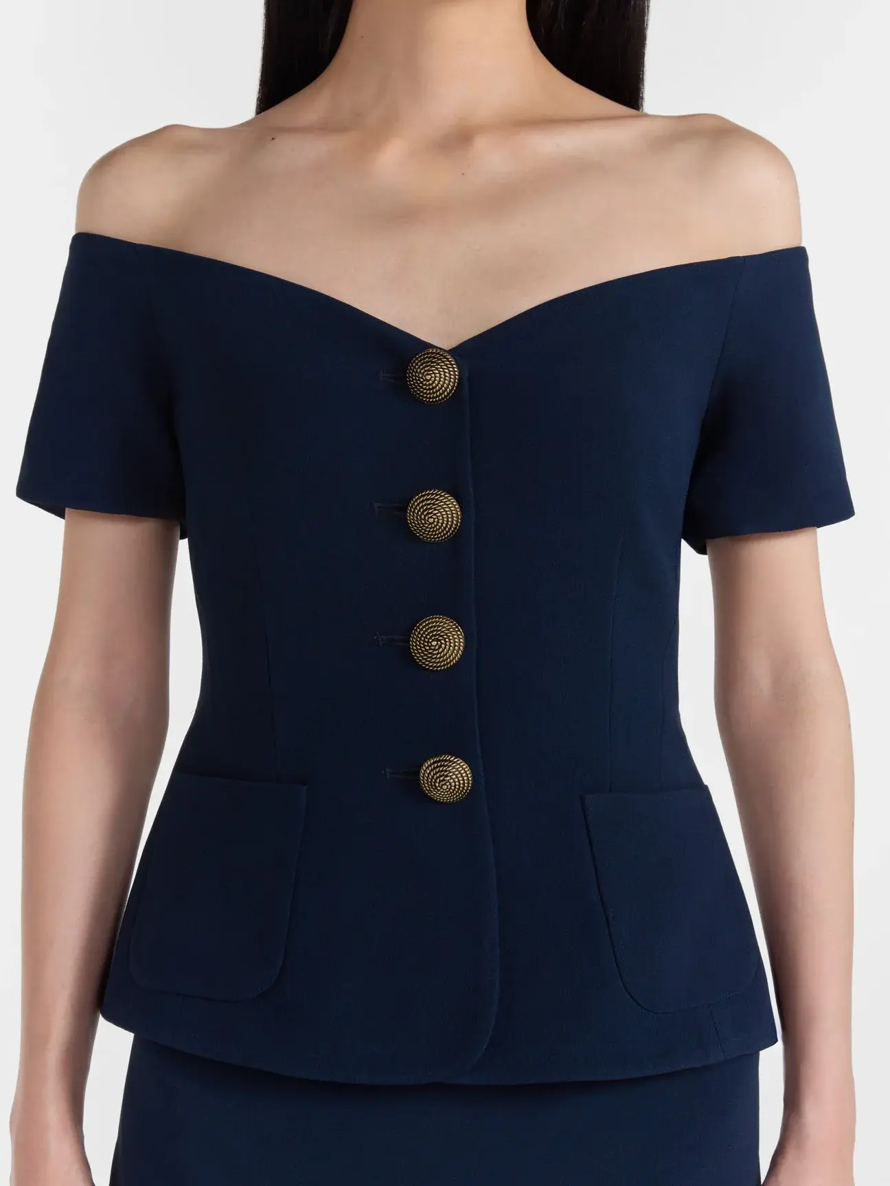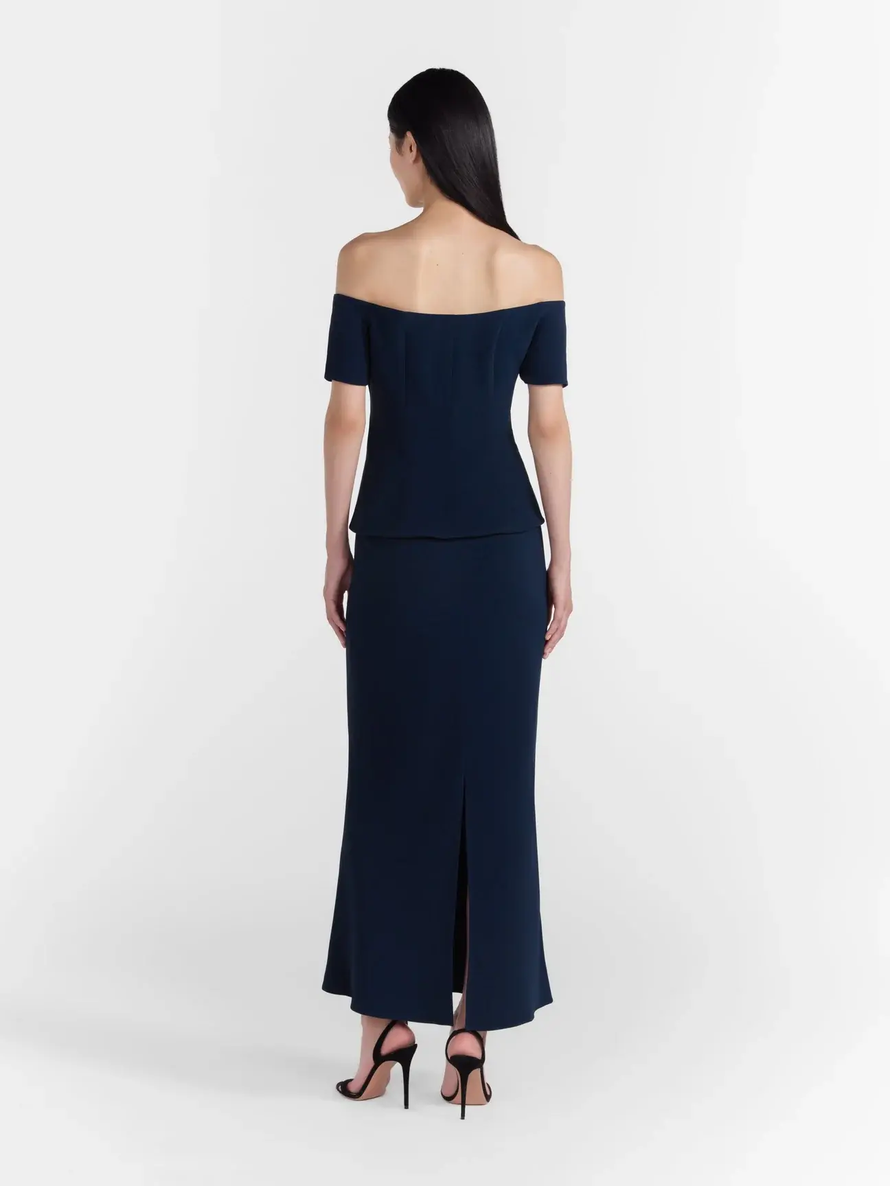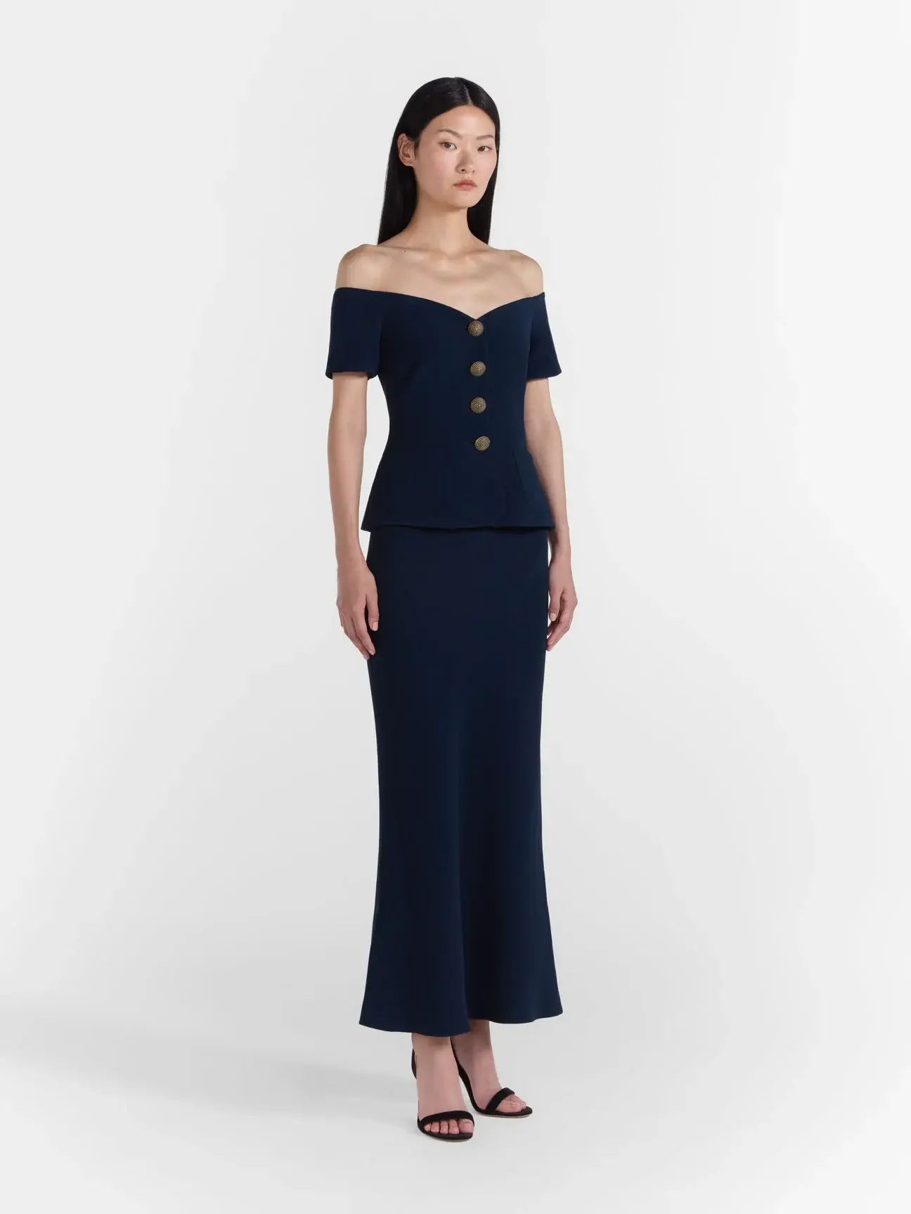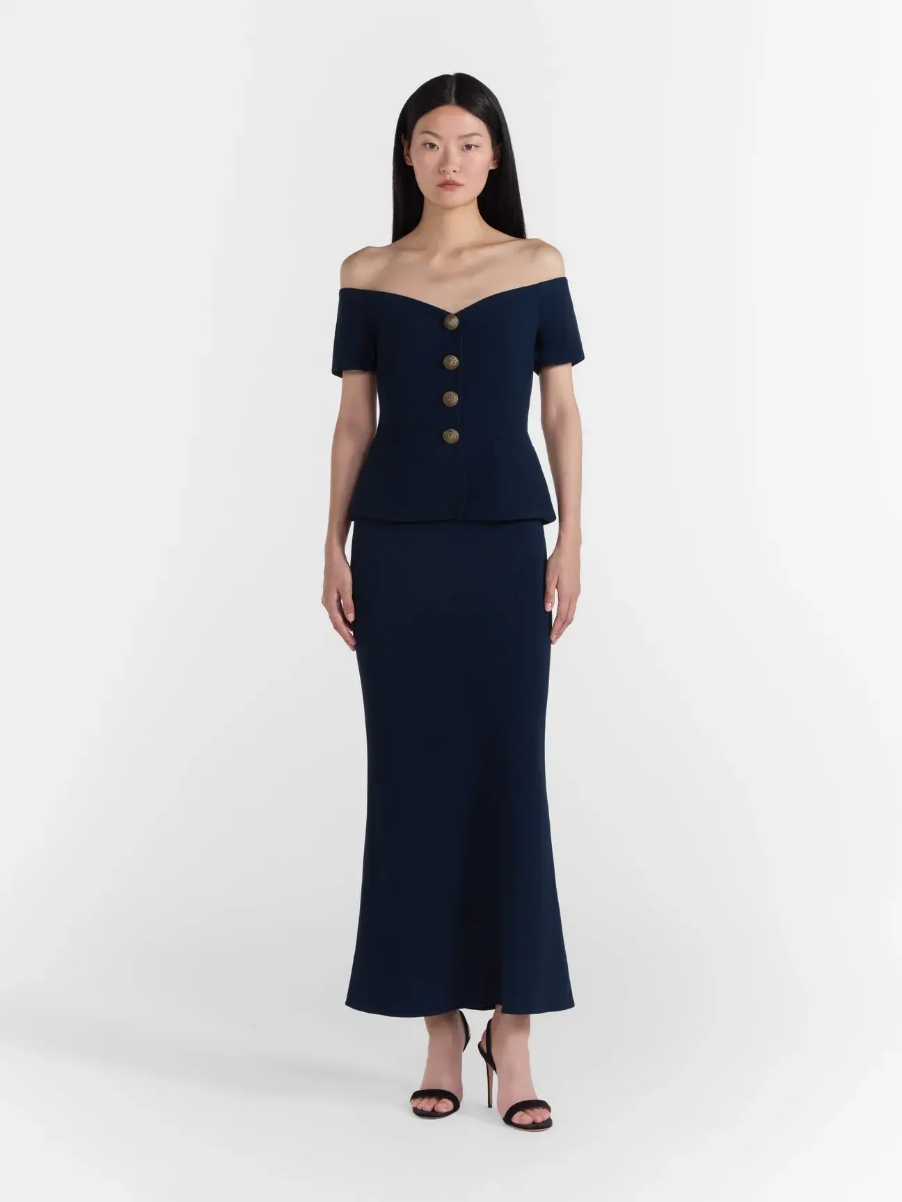 The Clementine-B Dress in Dark Navy is a sophisticated take on a classic top and skirt set. This crepe midi dress features an off-shoulder bodice with chic gold coil buttons down the front, paired with a sleek bias-cut skirt. The design connects the skirt to the top at the back waistline, giving the illusion of a coordinated set, offering both elegance and ease.