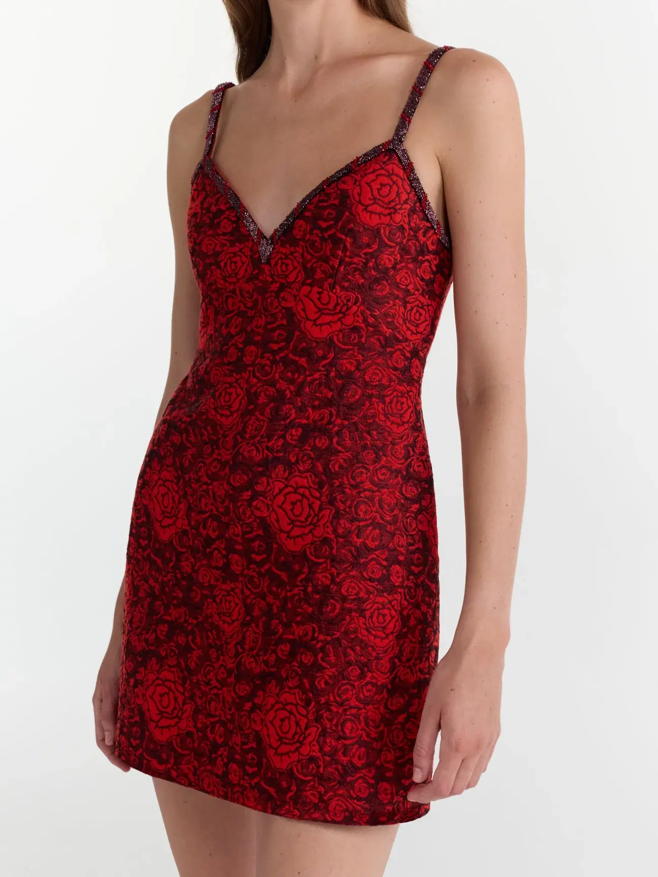 The Boa-B Dress is crafted in a rich brocade with an intricate rose pattern. A delicate ruby crystal embellished trim gracefully sweeps across the neckline and shoulder straps, catching the light with every movement. Designed to be a statement piece which can be styled in multiple ways, the Boa-B brings timeless and confident sophistication to any occasion.